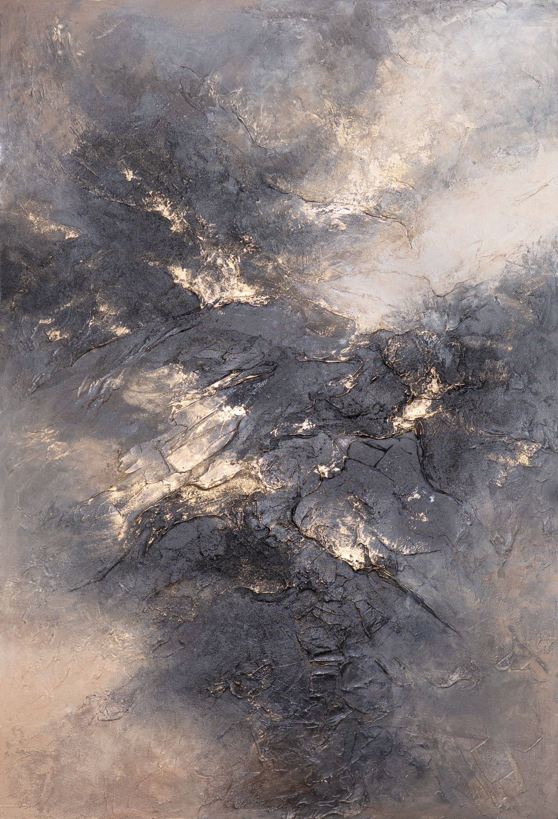 Apportez une énergie puissante à votre intérieur avec la peinture à la main "Himmelsglühen". Les nuances sombres de gris se mélangent aux tons doux de beige, tandis que des accents dorés, comme des rayons lumineux perçant les nuages, ajoutent une touche spectaculaire. La surface texturée crée une profondeur fascinante et une dynamique qui rend cette œuvre unique.