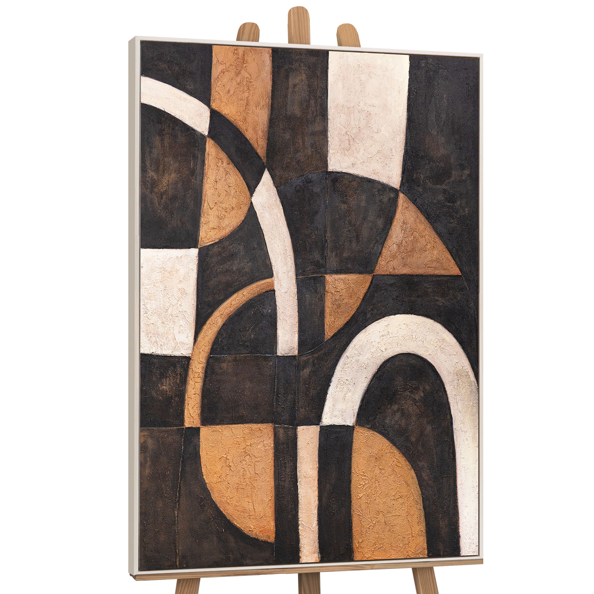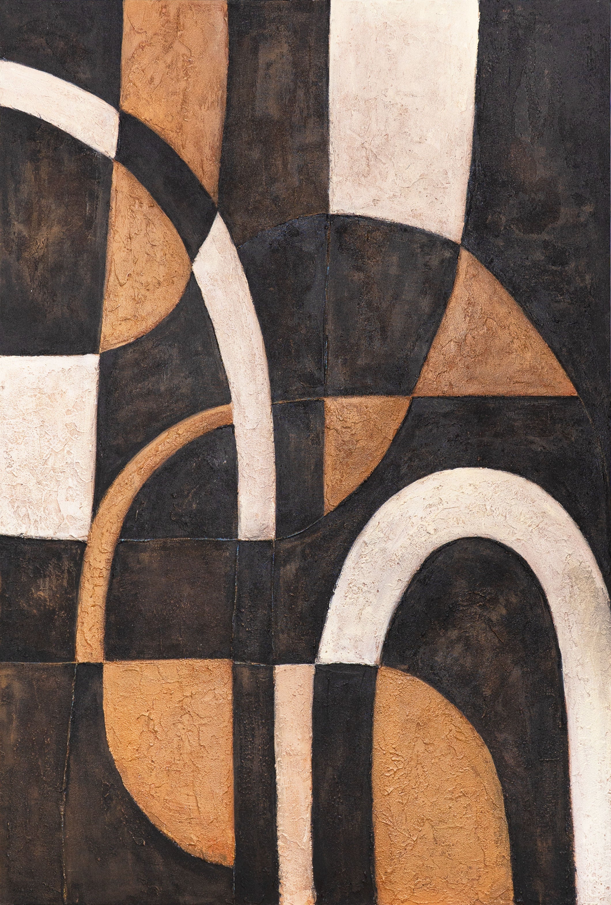 Cette œuvre d'art peinte à la main séduit par un jeu de lignes courbes et de formes géométriques. La combinaison de brun chaud, beige élégant et noir profond crée une harmonie parfaite de contrastes. La surface texturée confère à la peinture profondeur et caractère, en faisant un véritable point focal.