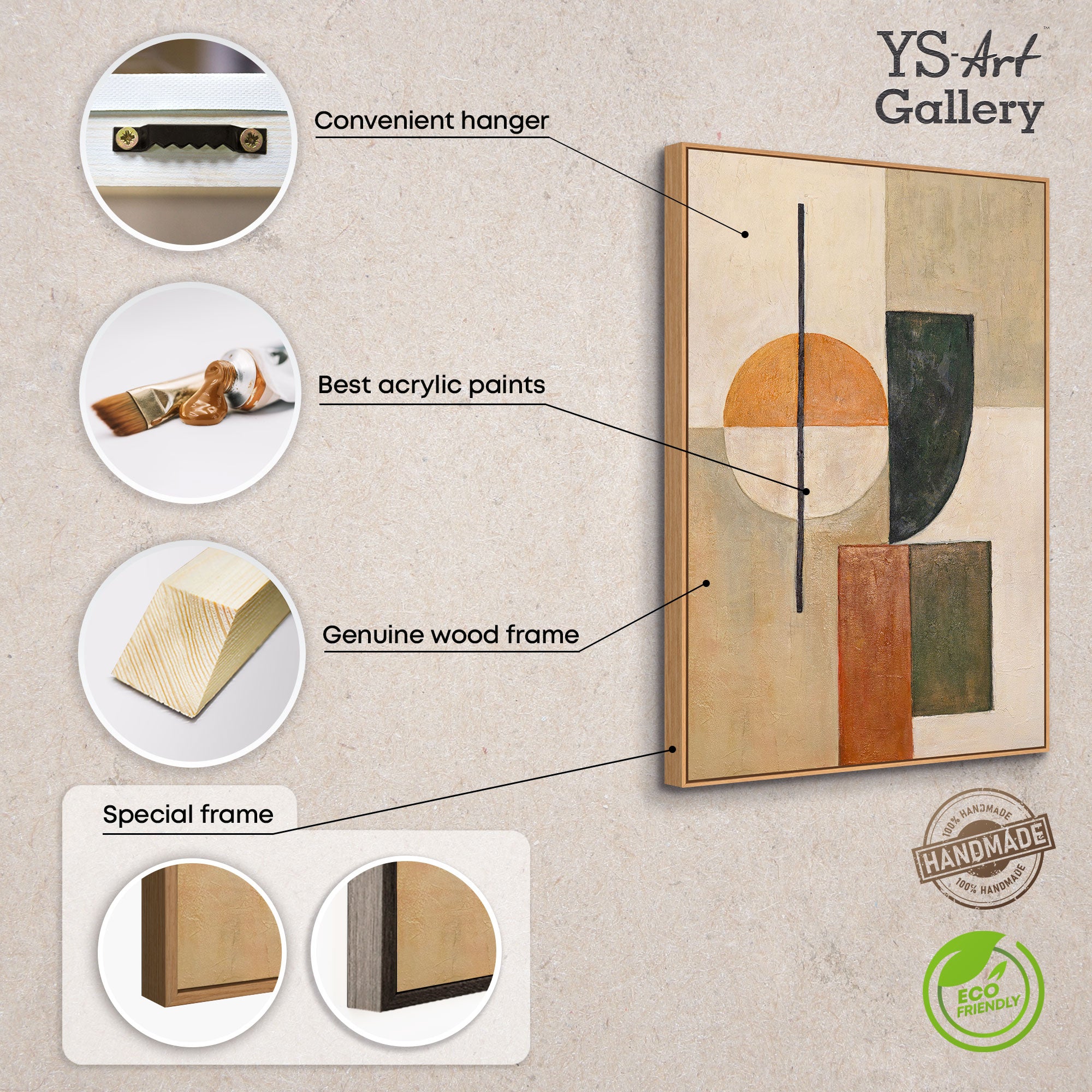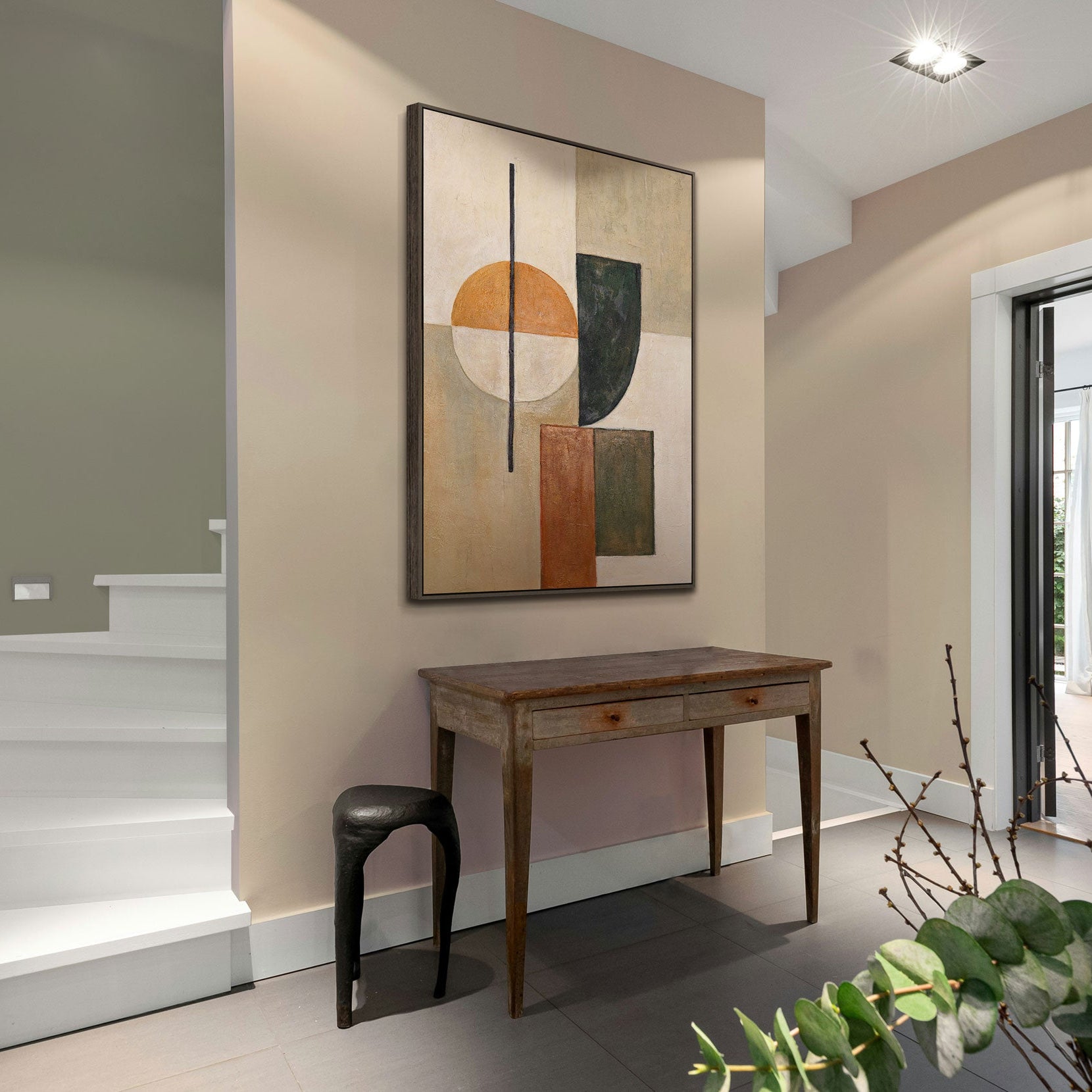 "Équilibre" est une peinture acrylique réalisée à la main, qui séduit par ses formes nettes, ses lignes et sa palette de couleurs équilibrée, comprenant beige, vert, rouge rouille et noir. La composition géométrique diffuse calme et stabilité, tandis que la surface texturée donne de la profondeur et de l'expression à l'œuvre.