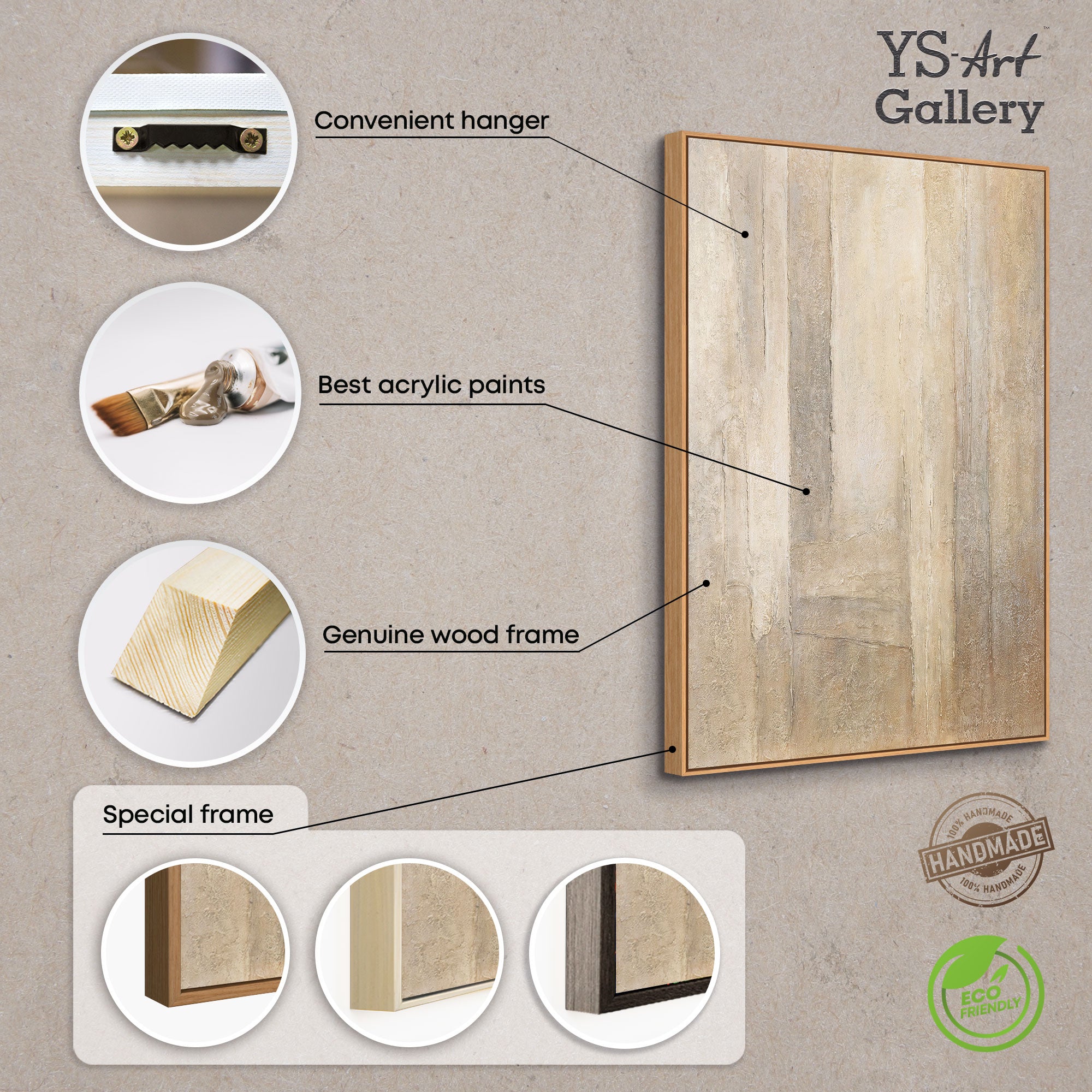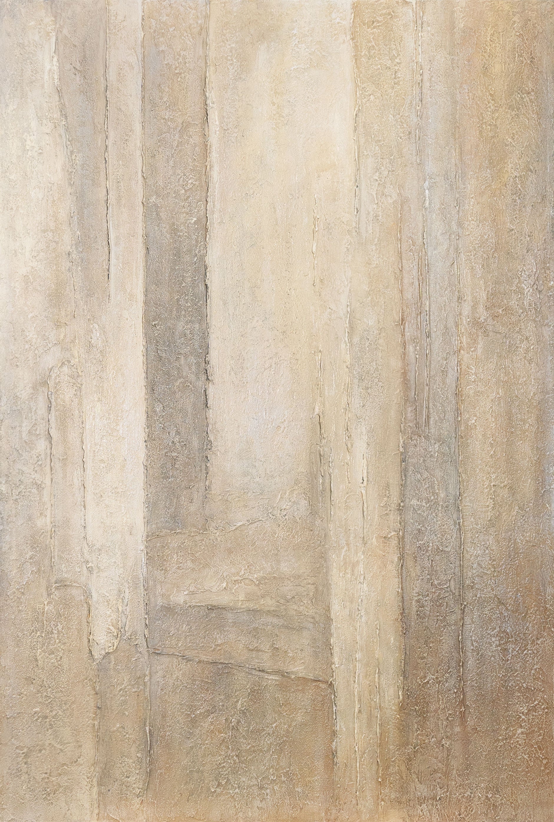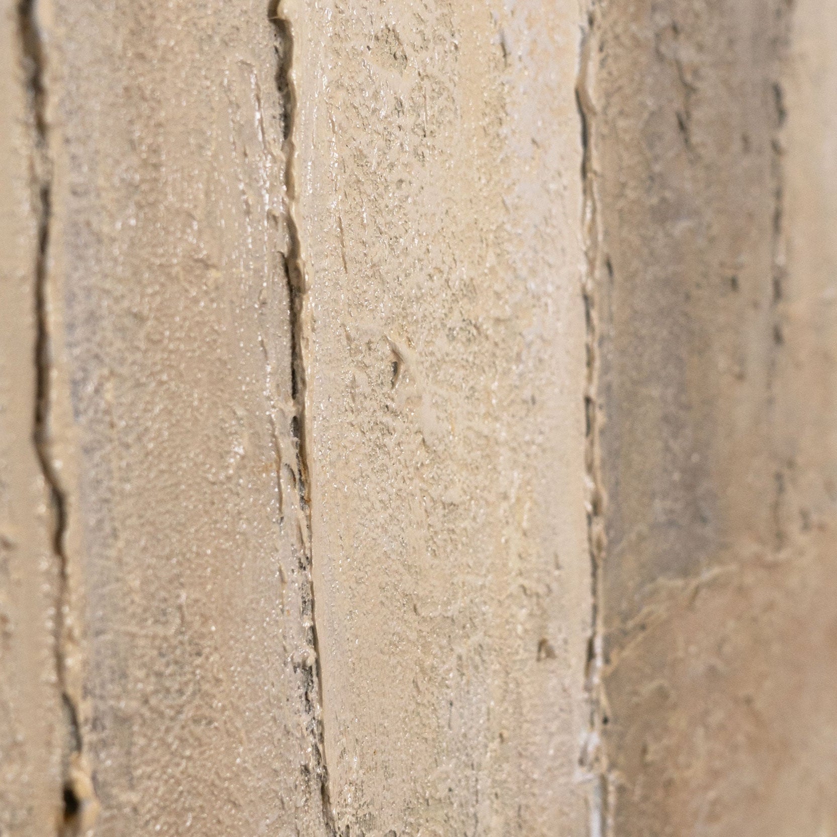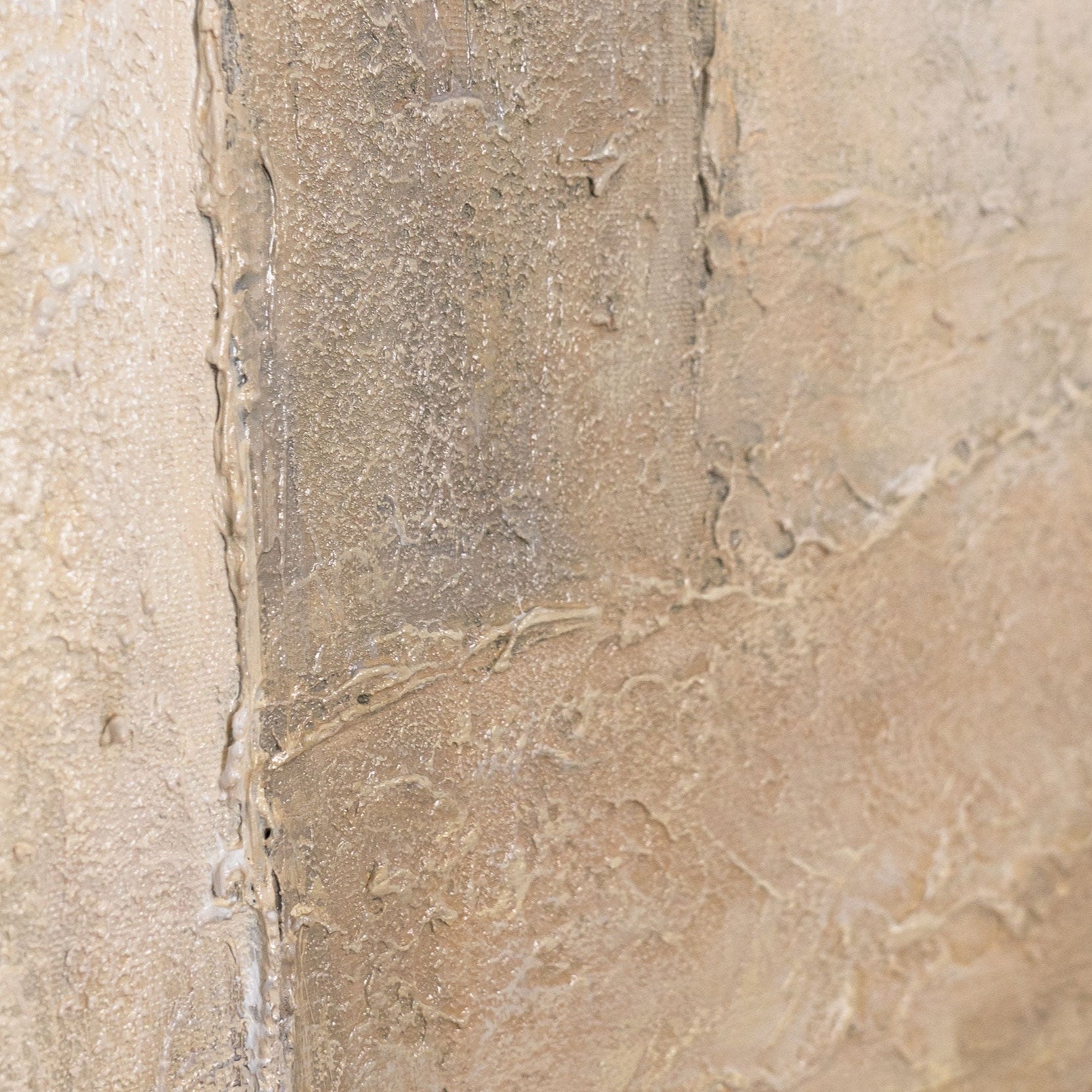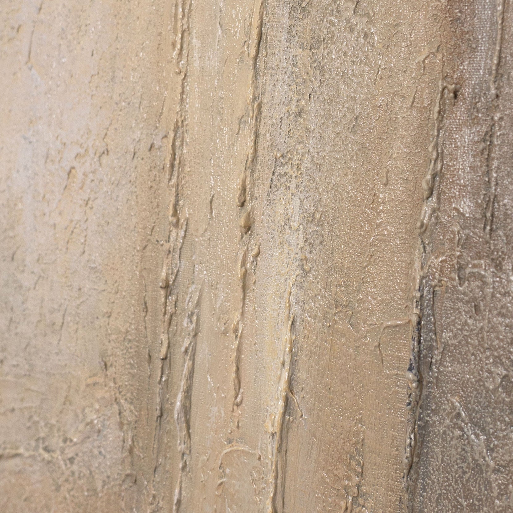 Cette œuvre d'art peinte à la main séduit par sa composition verticale apaisante et sa palette de couleurs harmonieuses de beige, sable et doux tons de gris. Grâce à sa texture en relief, elle transmet de la profondeur et une sensation de naturel, invitant à une contemplation méditative.