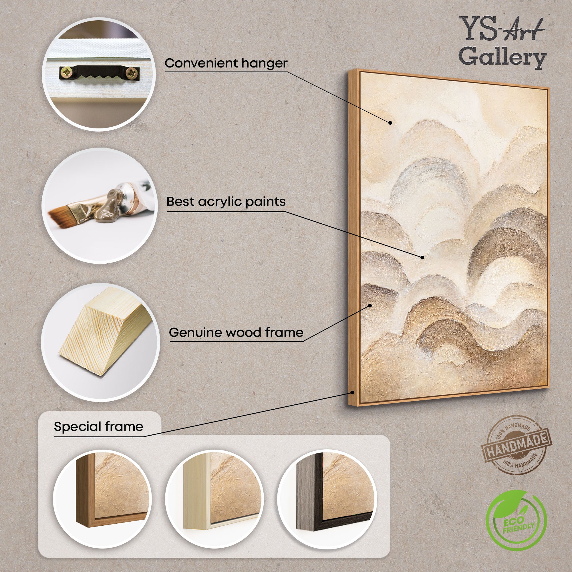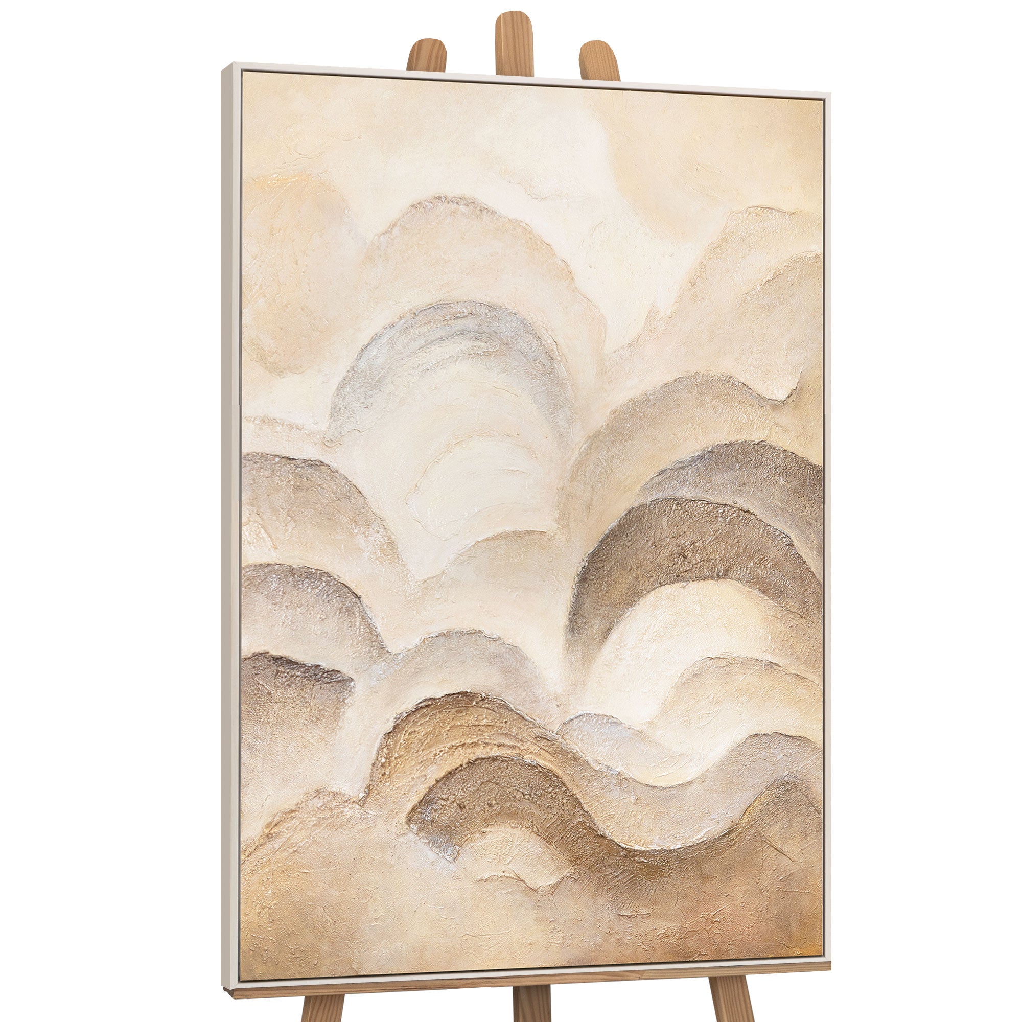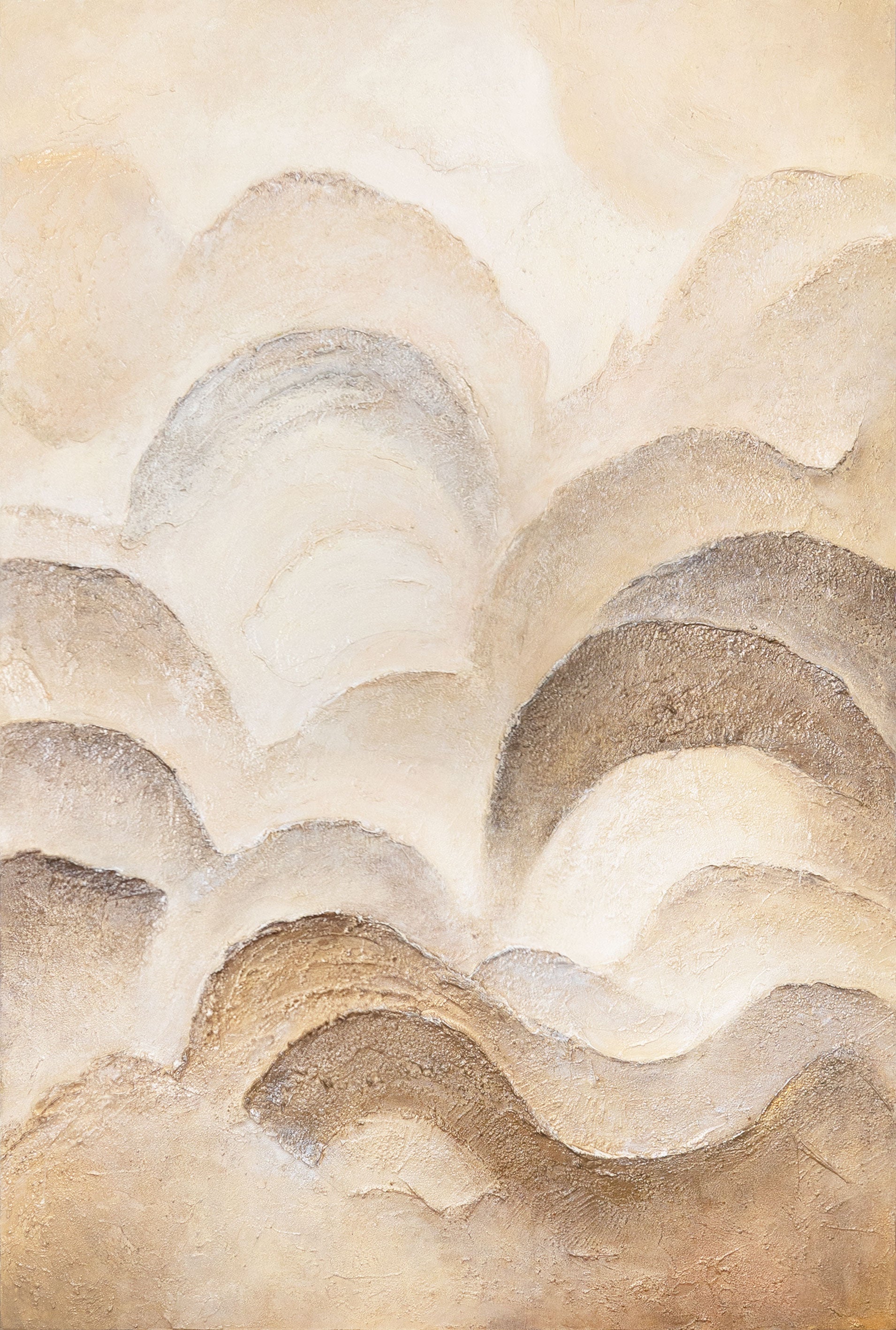 Apportez une tranquillité naturelle à votre intérieur avec cette peinture abstraite peinte à la main. Les couches douces de tons beige, brun et crème rappellent les contours des montagnes ou des vagues, créant une atmosphère chaleureuse et harmonieuse.