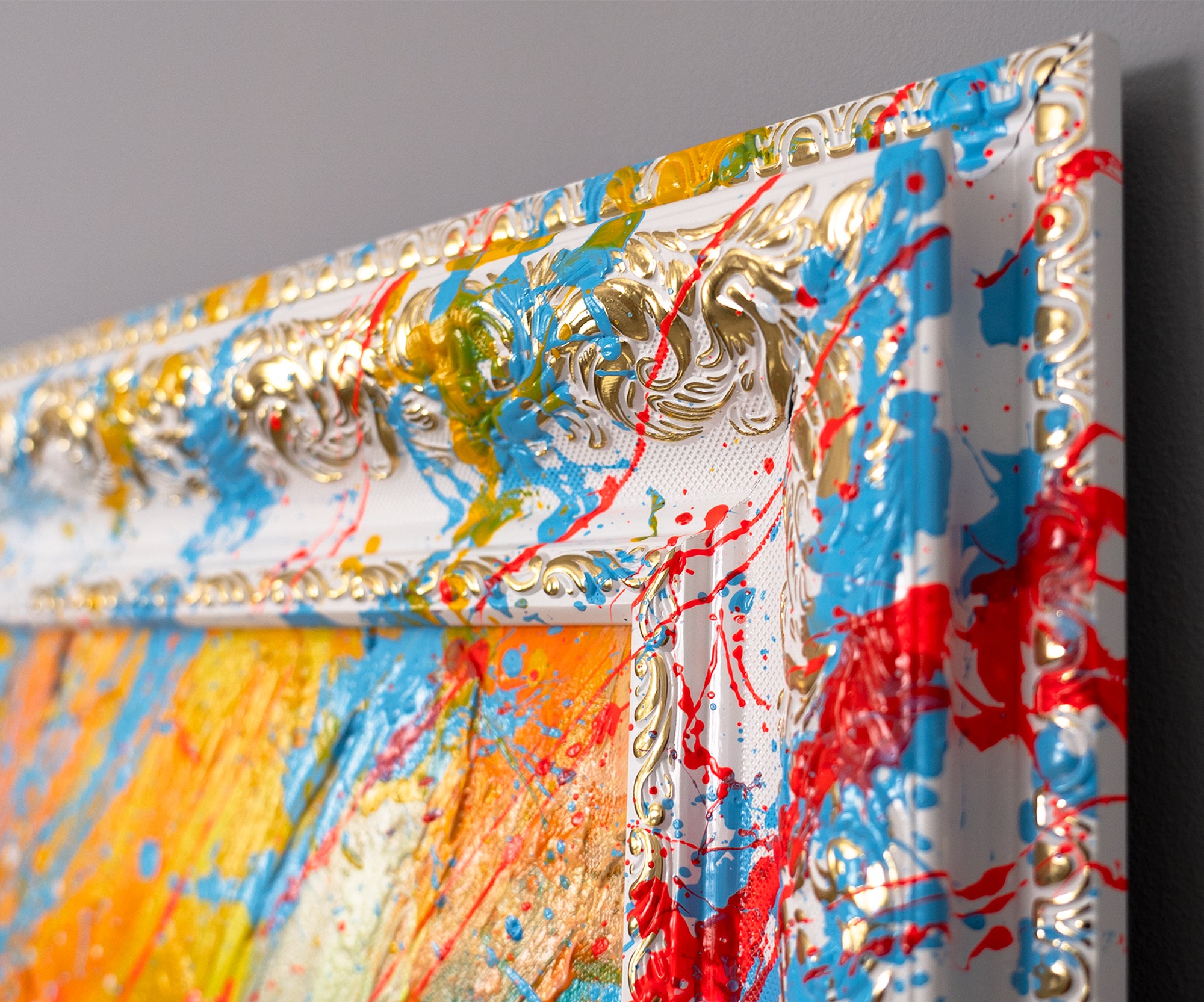 Perfekt für moderne Wanddeko Wohnzimmer, auffällige abstrakte Kunst oder große Leinwandbilder, die Ihre Räume mit positiver Energie und Farbintensität füllen. Dieses Werk kombiniert die Kraft der Farben mit exklusiver Handarbeit und hochwertiger Rahmung.