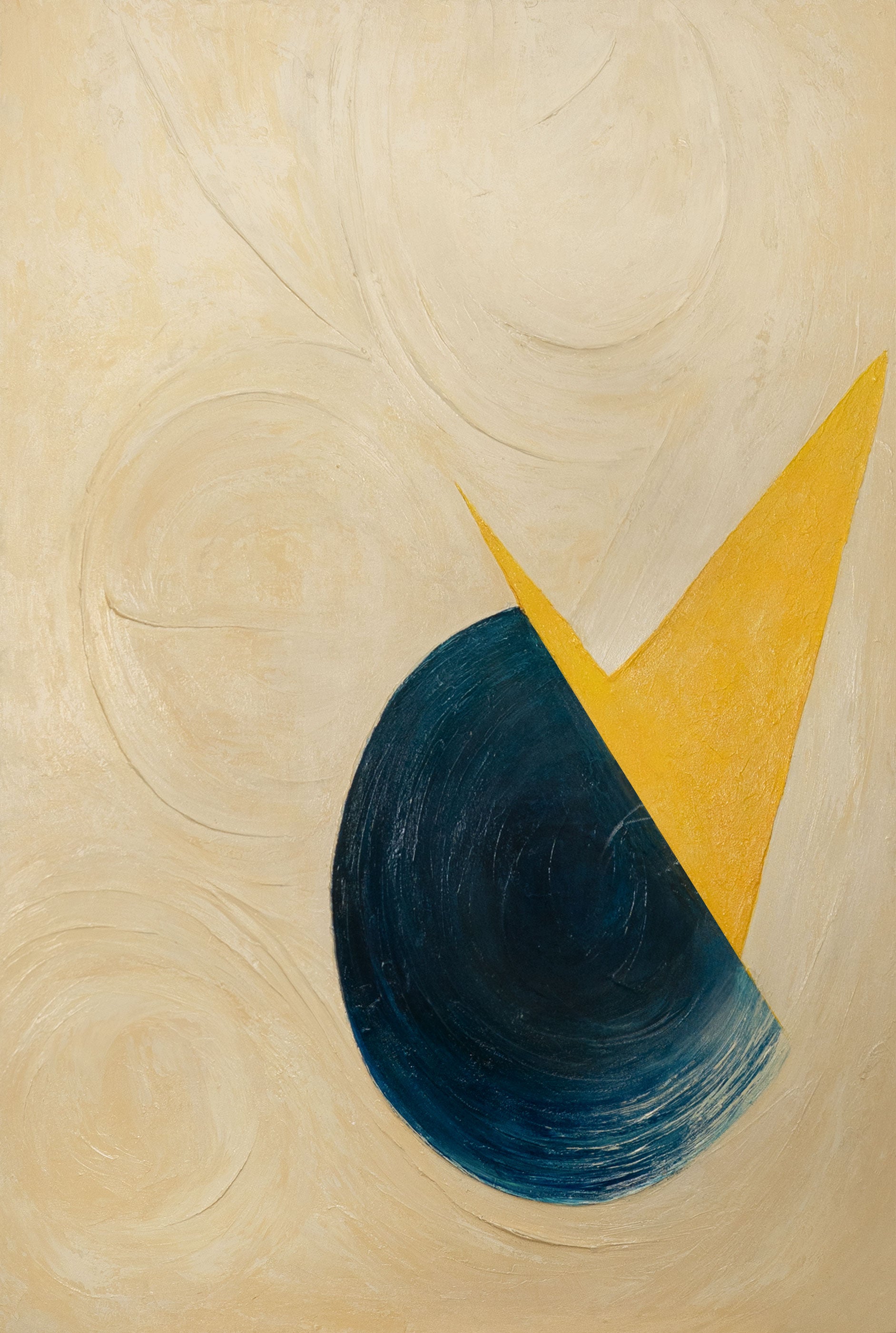 "Coup à travers l'Horizon" est une peinture acrylique dynamique, réalisée à la main, qui fascine par ses formes géométriques nettes et ses couleurs puissantes. La composition d'un cercle bleu profond et d'un triangle jaune distinctif crée une dynamique et symbolise le jeu entre équilibre et contraste.