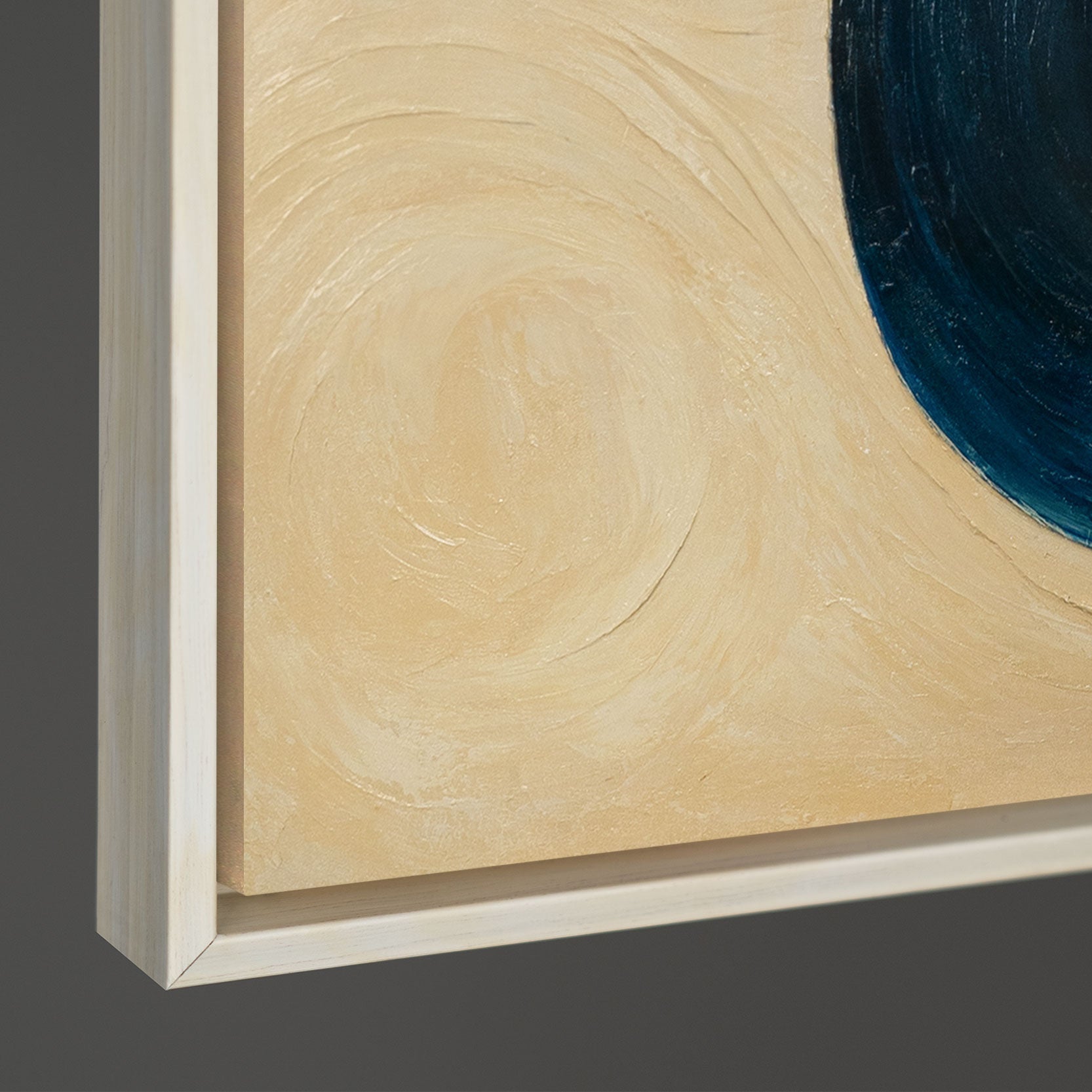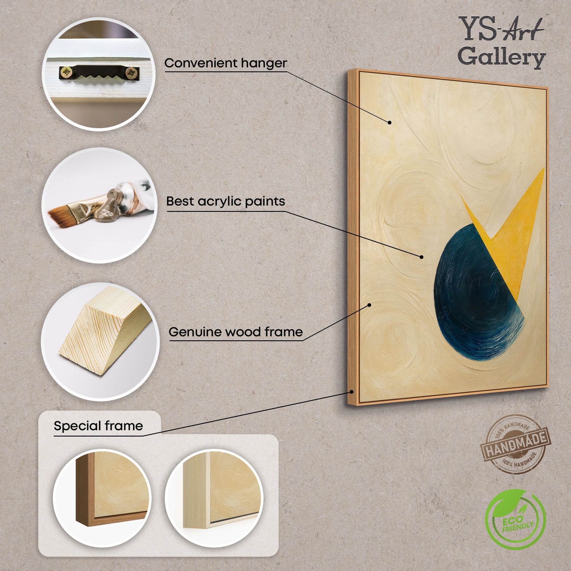 Cette peinture moderne sur toile apporte une énergie fraîche à votre maison ou bureau. Avec sa palette de couleurs minimalistes en bleu, jaune et beige, elle se combine facilement et convient parfaitement aux intérieurs modernes, scandinaves ou épurés.