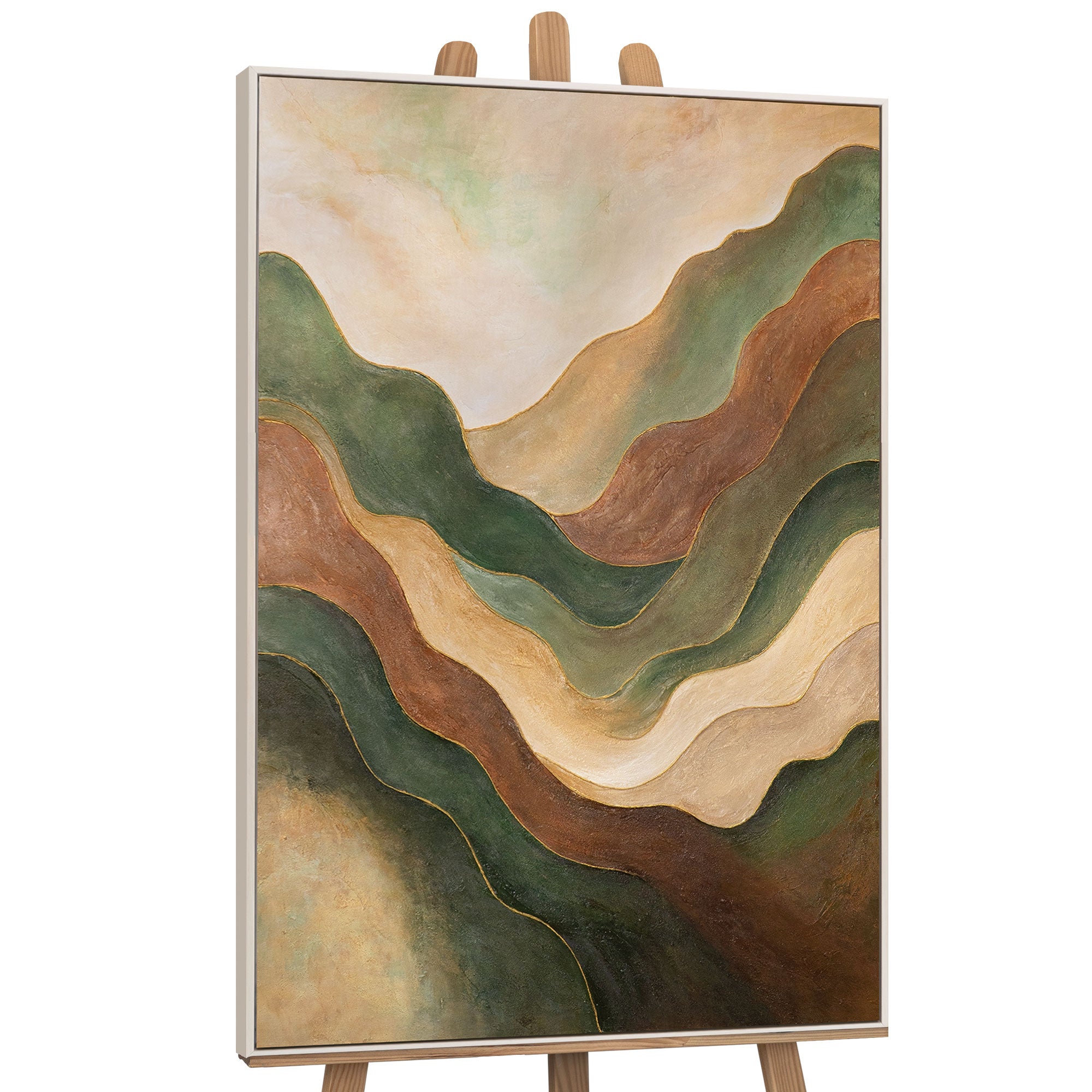 "Danse des Collines" est une peinture acrylique atmosphérique qui capture les mouvements doux d'un paysage vallonné. Les lignes fluides en vert, brun et beige forment une structure ondulante harmonieuse qui dégage une sensation de connexion à la nature et de calme. Grâce à la technique de peinture texturée, l'œuvre acquiert de la profondeur et une qualité tactile particulière.