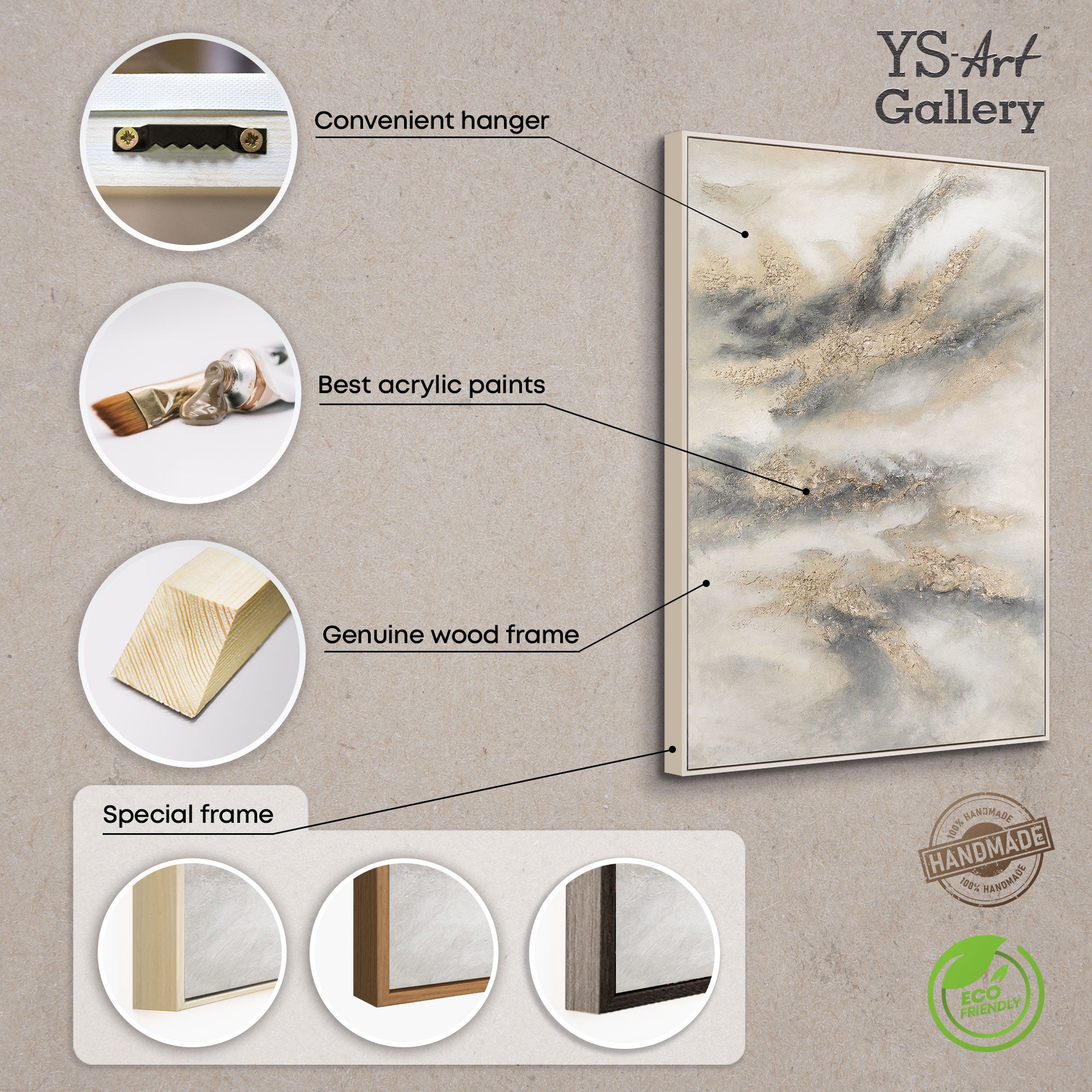 Chaque tableau est réalisé sur une toile de haute qualité et tendu sur un cadre en bois solide, prêt à être accroché immédiatement.