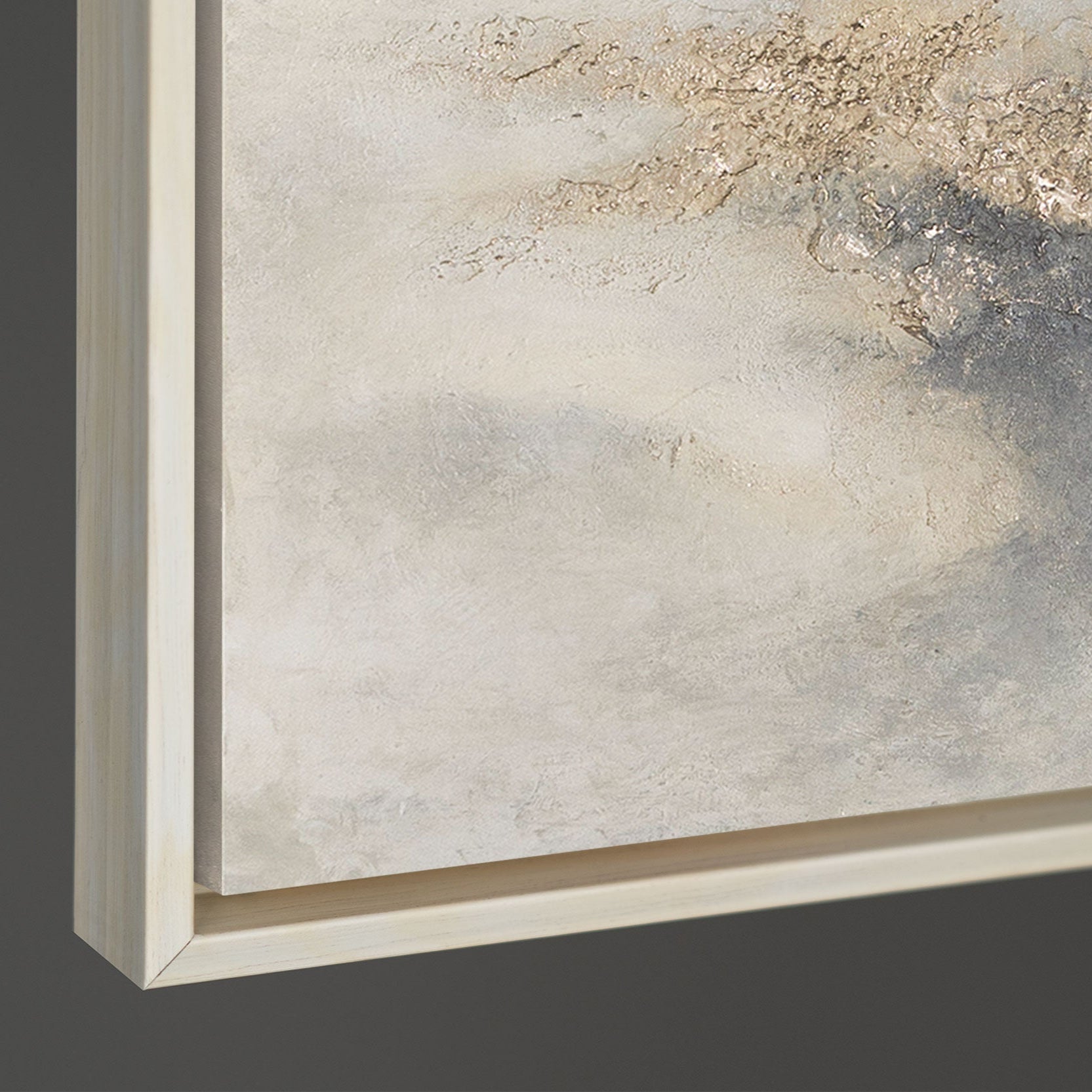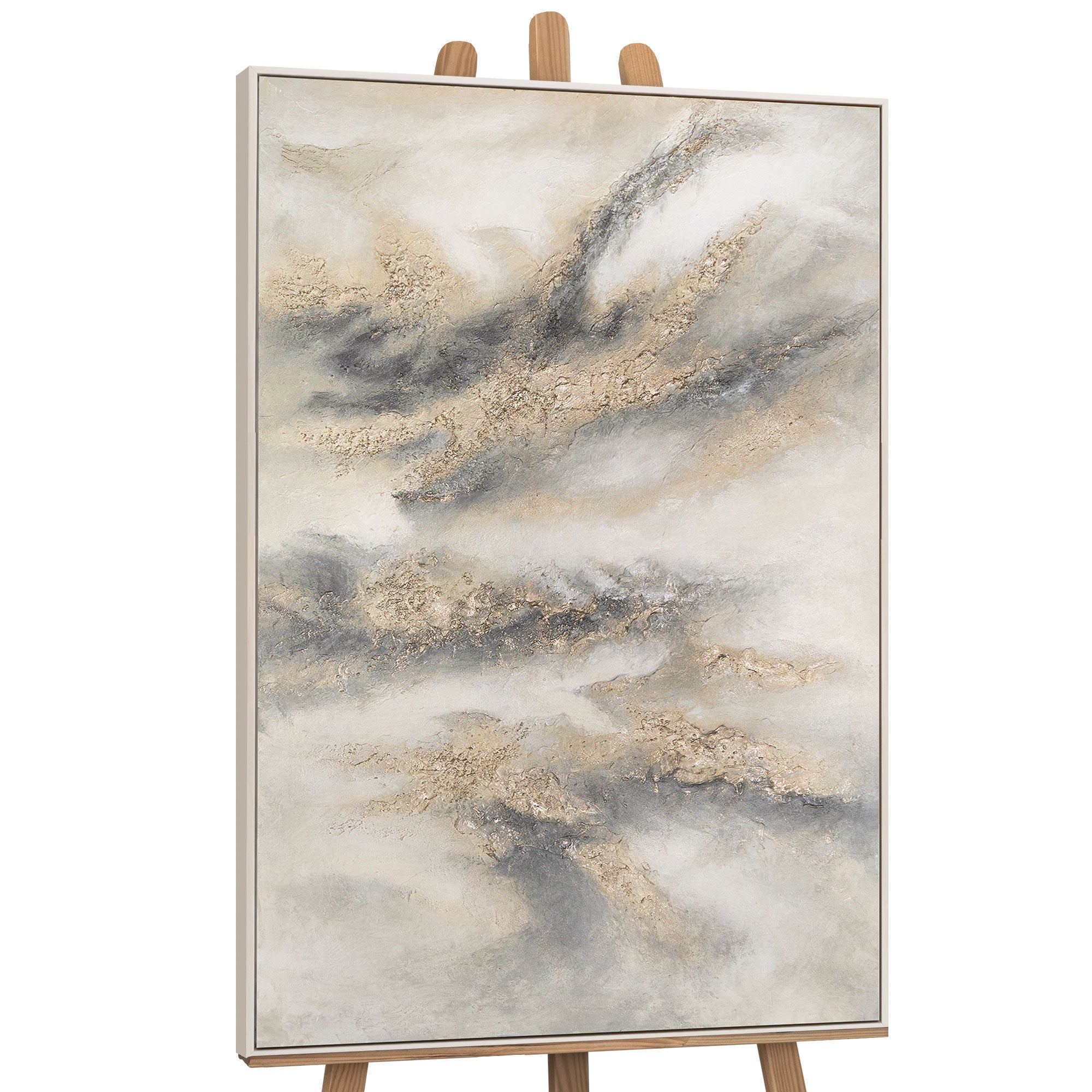 Apportez calme et élégance dans votre maison avec cette peinture à la texture faite main. Les douces formes de nuages en gris, beige et blanc se mélangent harmonieusement avec des touches dorées, conférant à l'œuvre une légèreté noble et presque flottante. Chaque coup de pinceau et chaque structure en relief fait de cette œuvre un objet d'art unique.