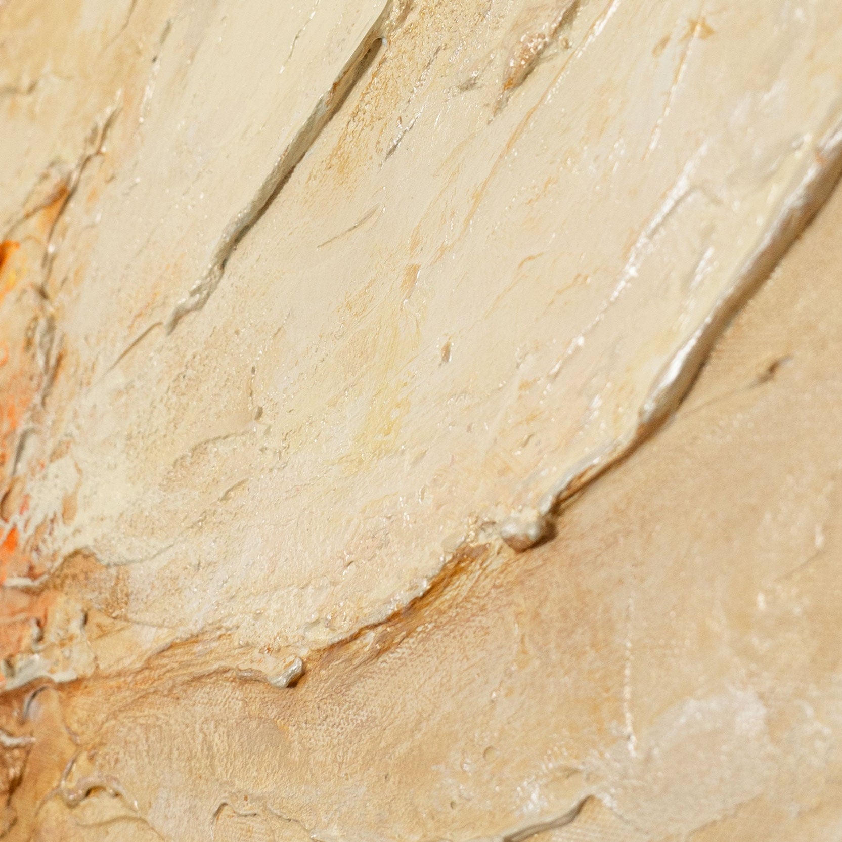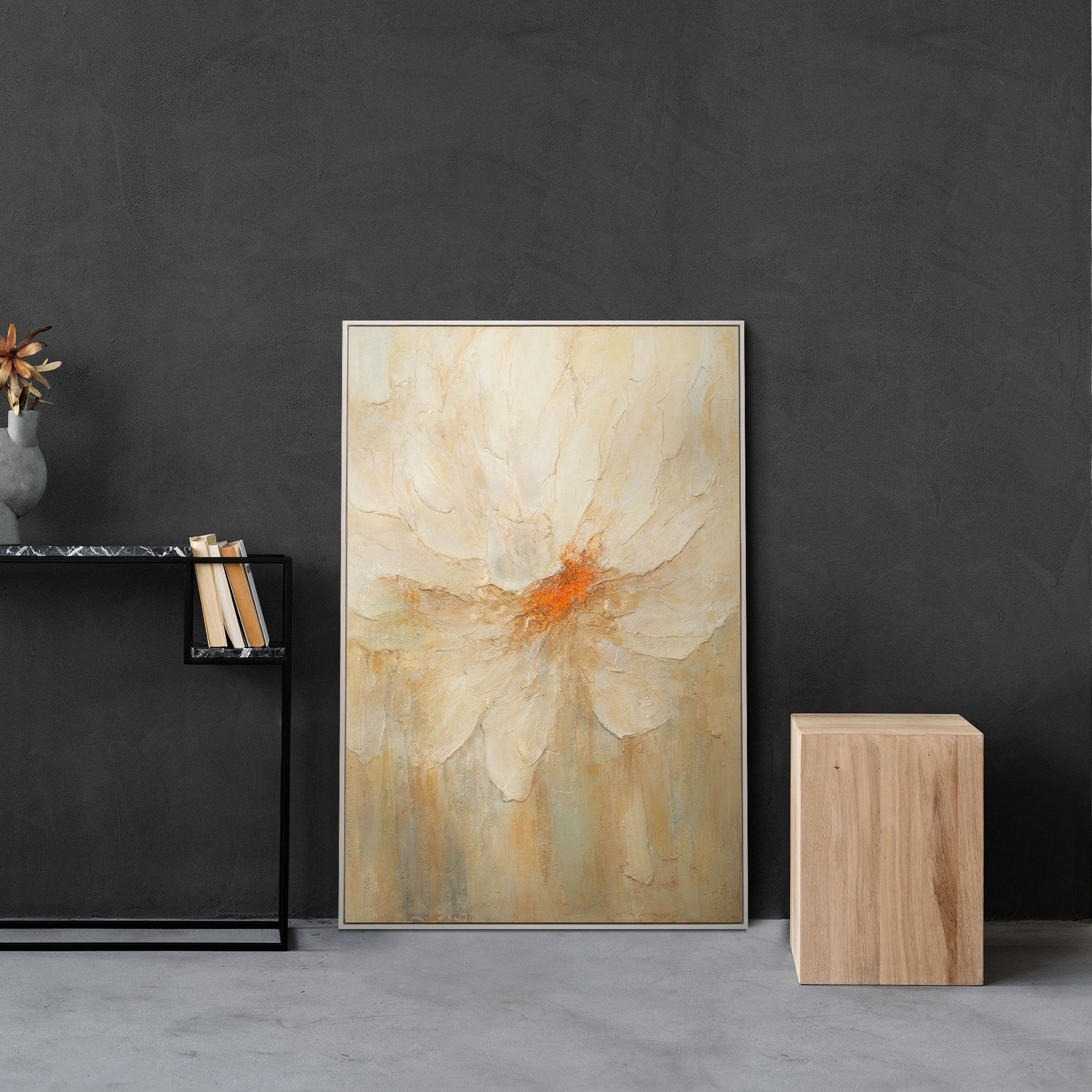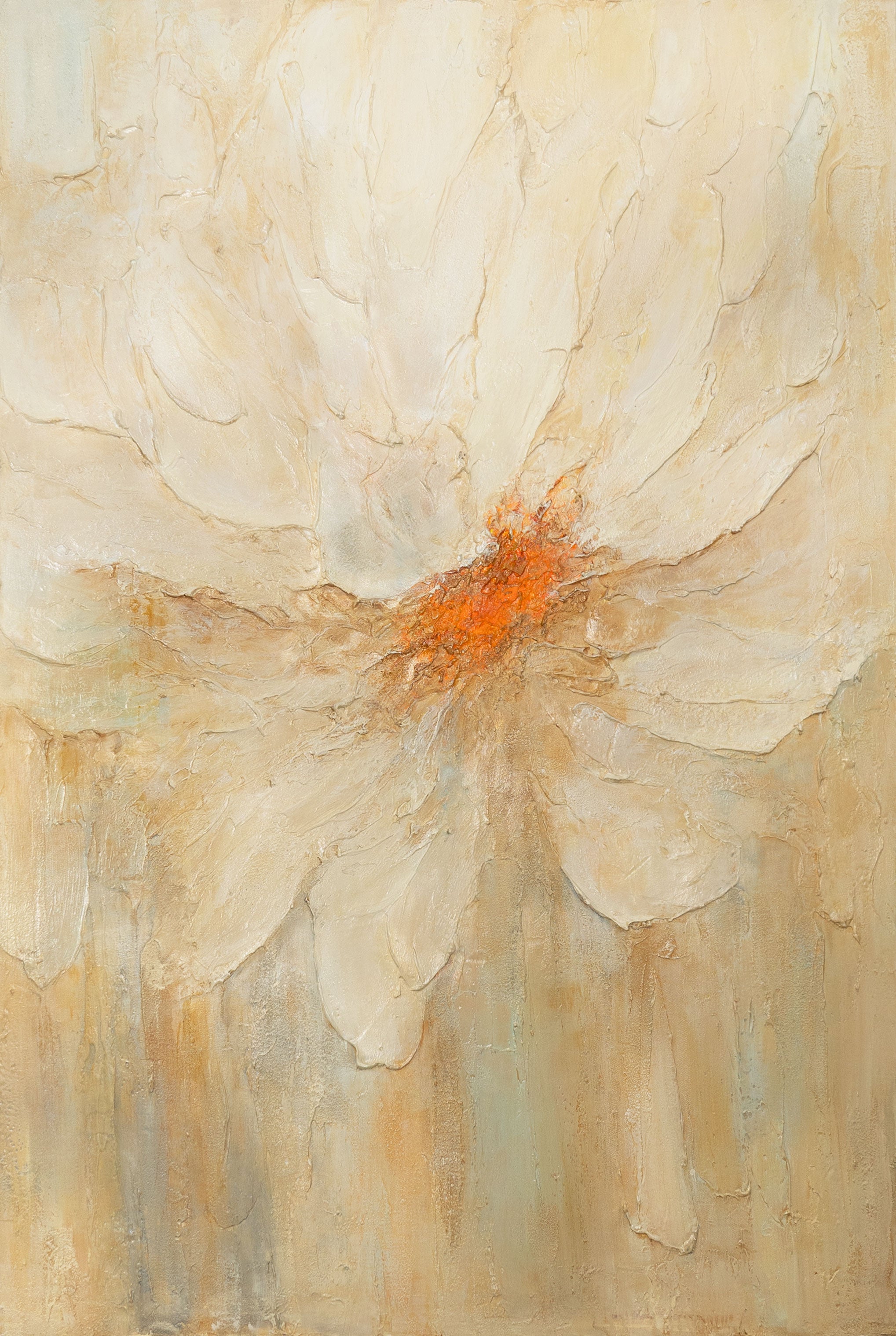 La peinture acrylique "Poussière de Feu" brille par une composition fascinante de tons crémeux doux et un centre orange éclatant. La texture donne de la profondeur et de la vivacité aux pétales, tandis que les nuances chaudes créent l'impression de lumière et de mouvement.
