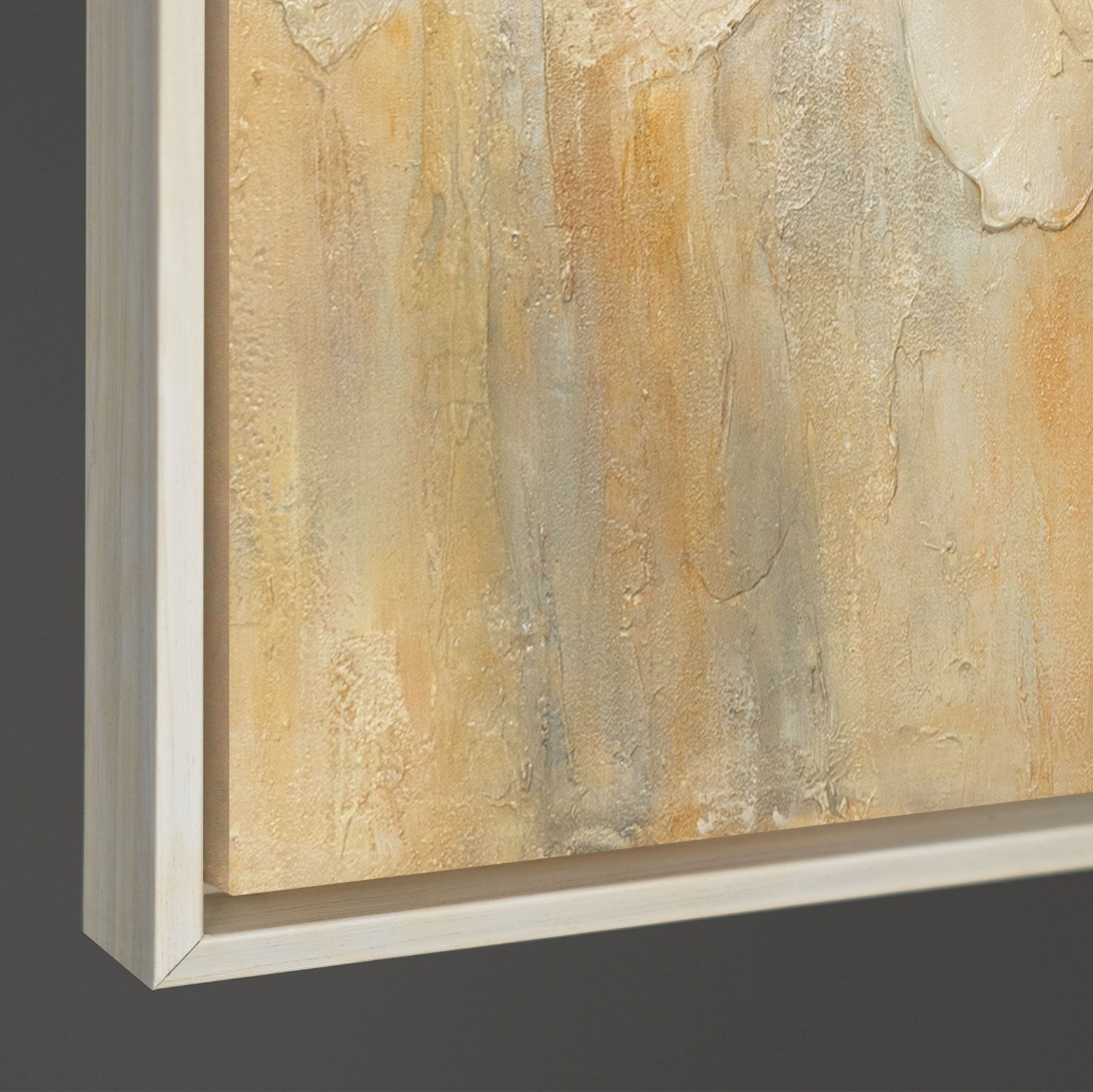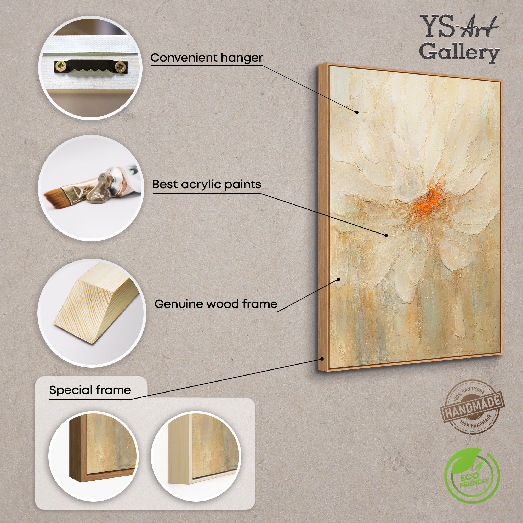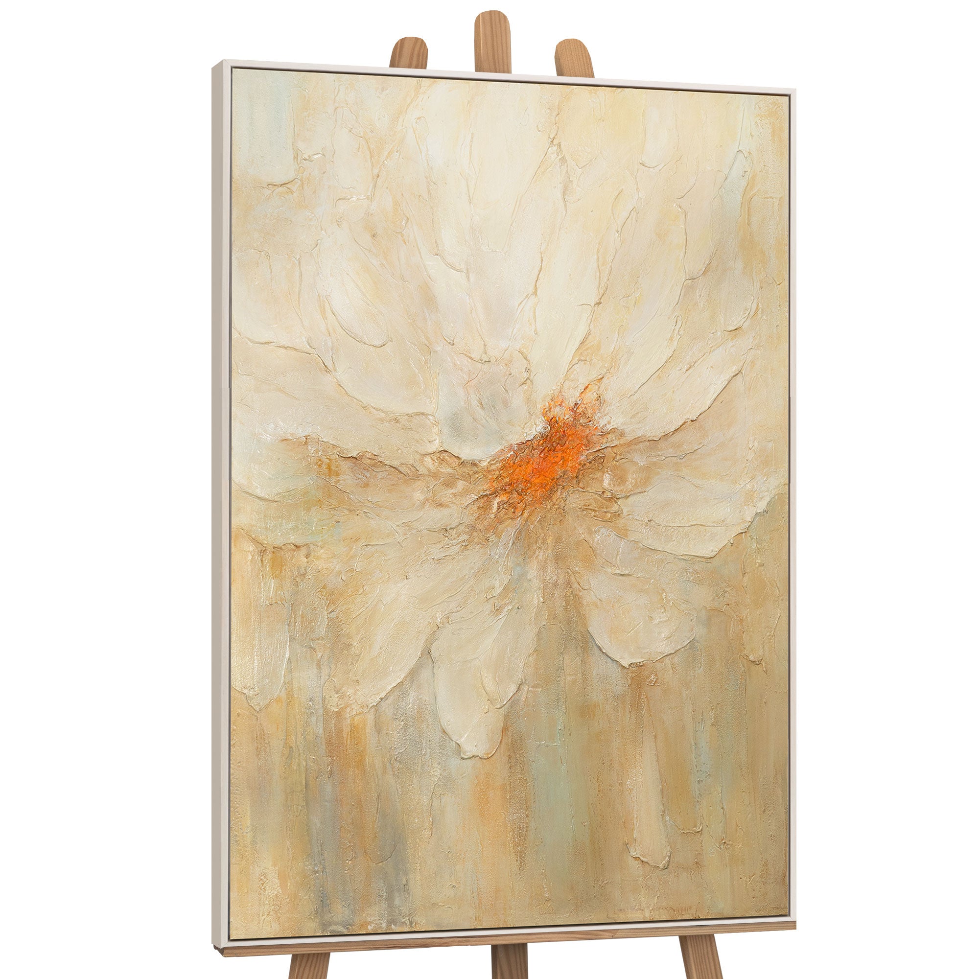 La peinture acrylique "Poussière de Feu" brille par une composition fascinante de tons crémeux doux et un centre orange éclatant. La texture donne de la profondeur et de la vivacité aux pétales, tandis que les nuances chaudes créent l'impression de lumière et de mouvement.
