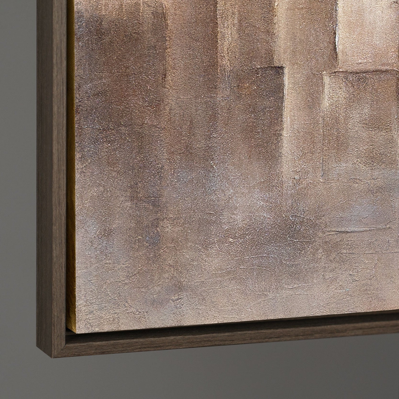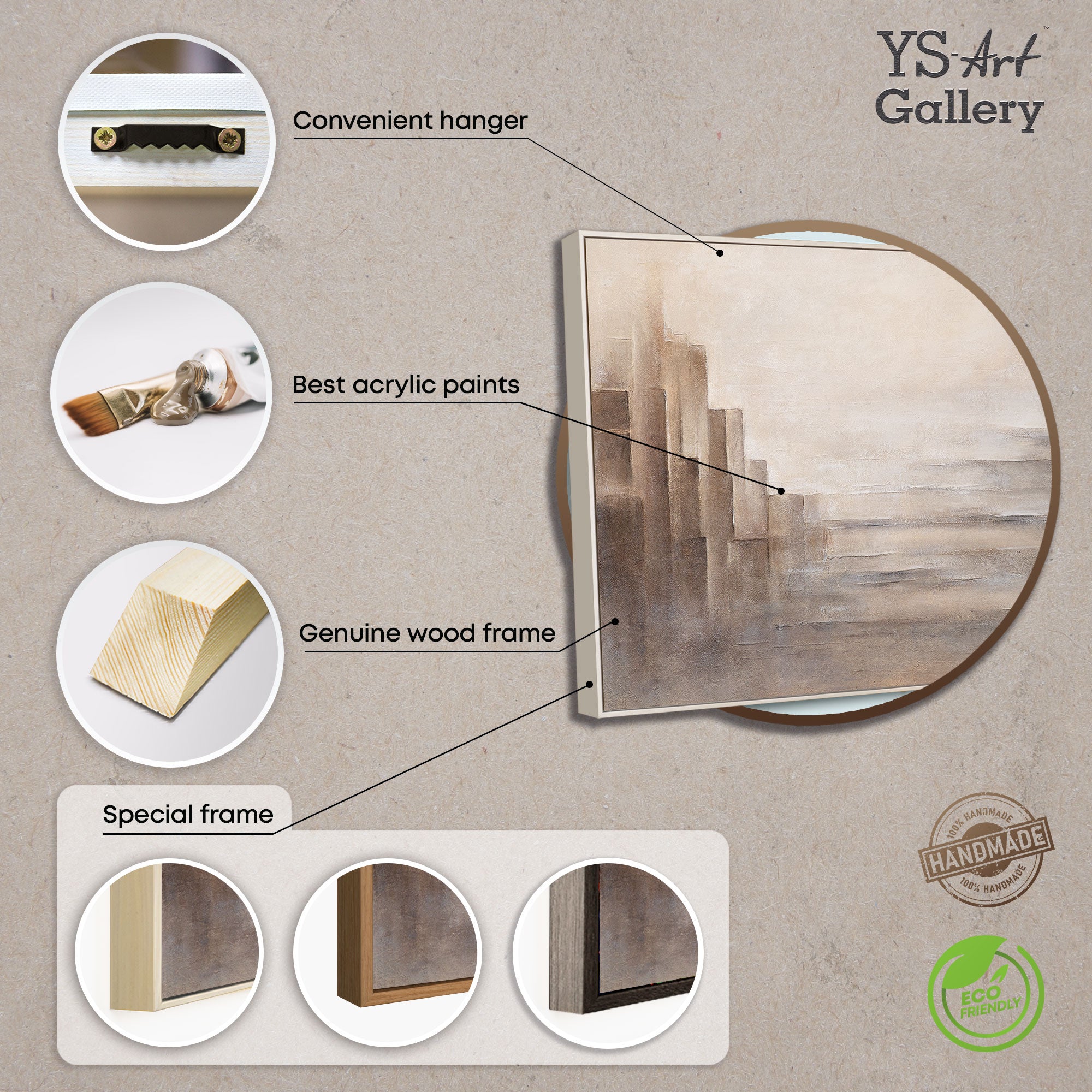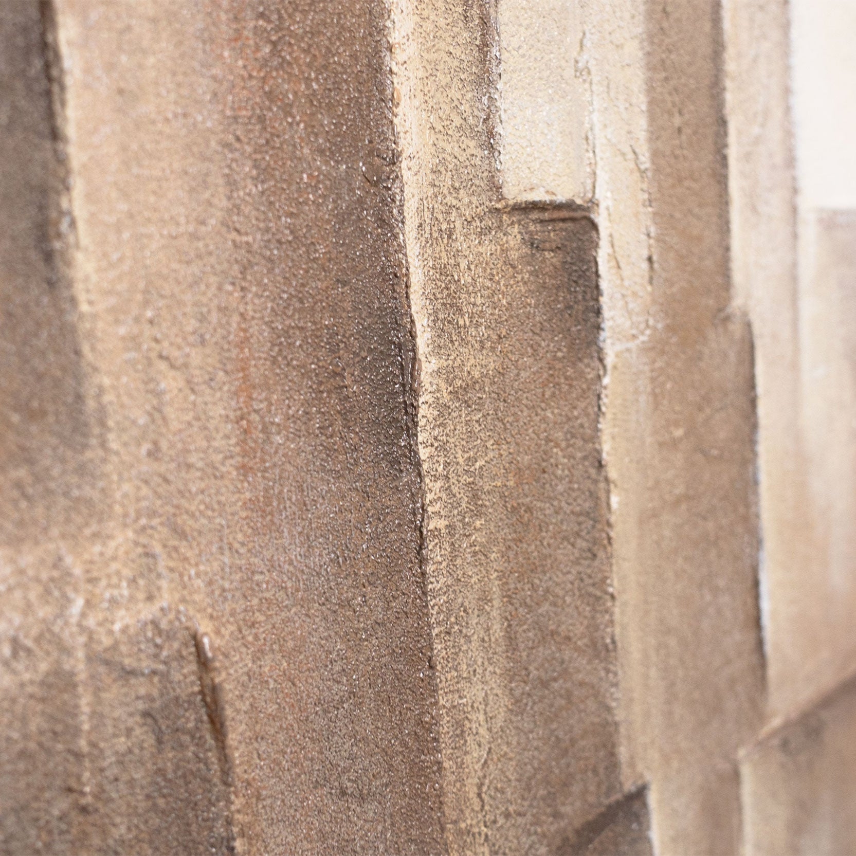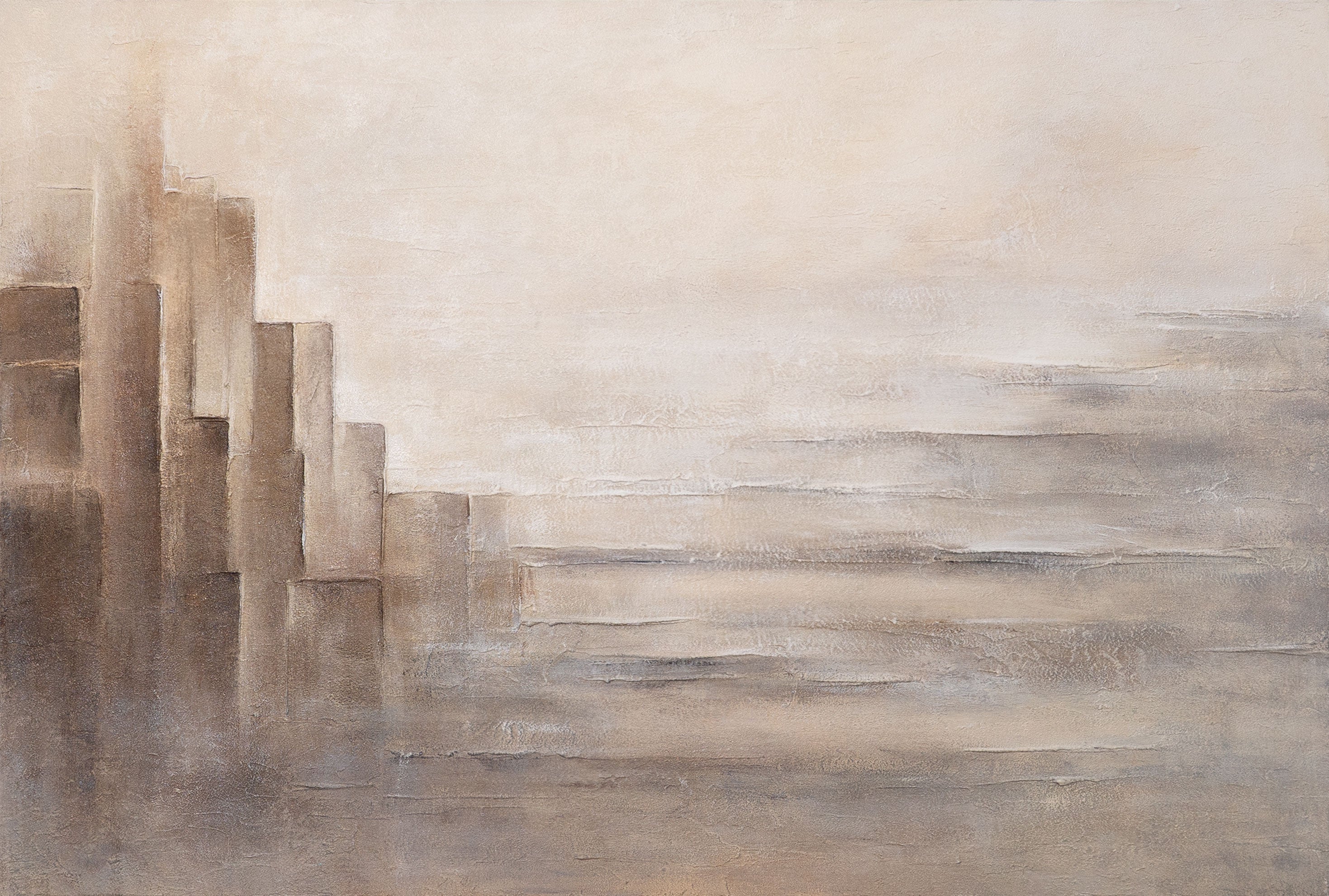 La peinture sur toile "Les Limites de l'Illusion" joue avec des structures nettes et des transitions douces. Des formes rectangulaires s'élèvent comme des marches, tandis que des teintes douces de beige et de brun se fondent dans de larges espaces. La composition donne l'impression d'un paysage urbain qui se perd au loin – un mélange d'architecture et d'illusion.
