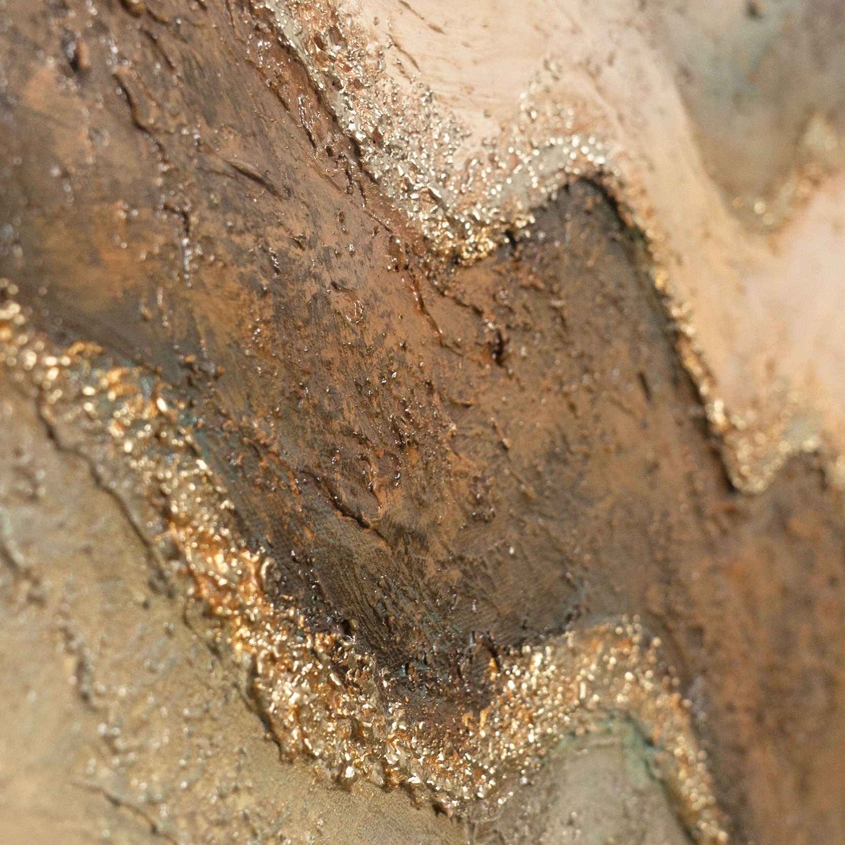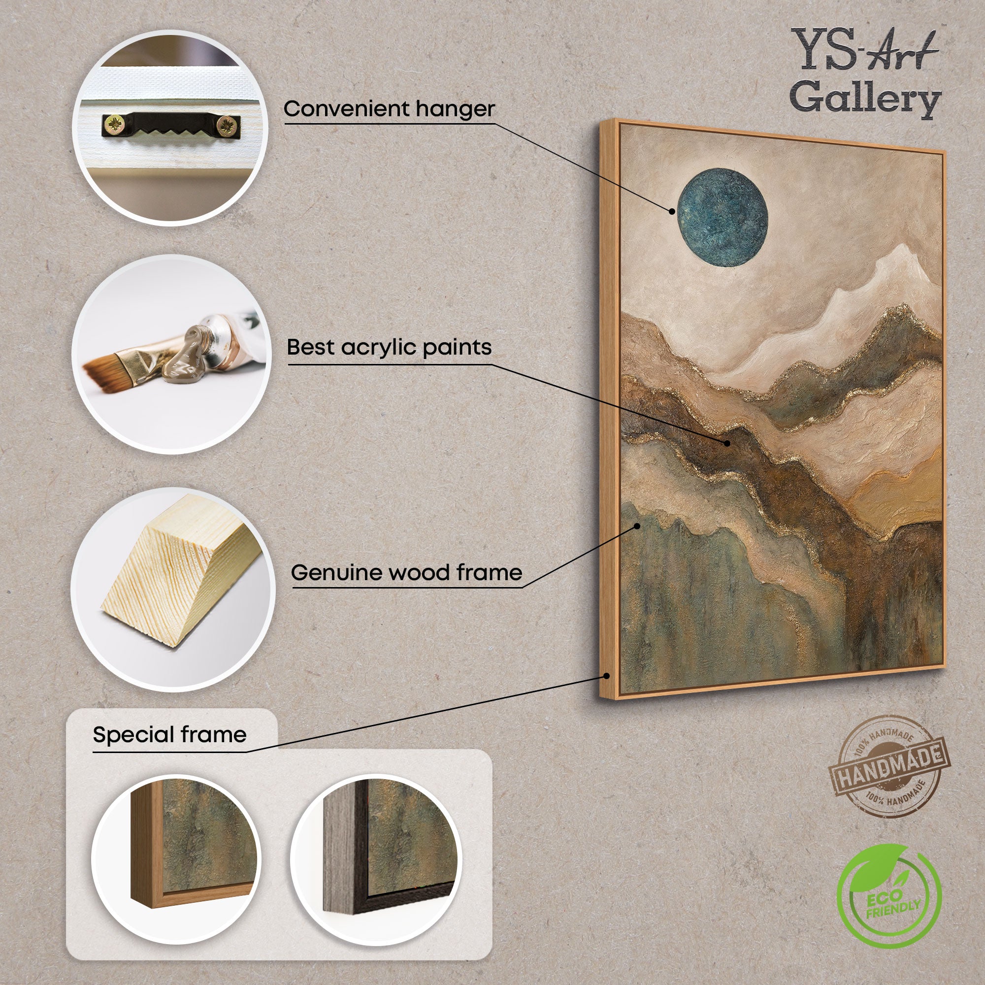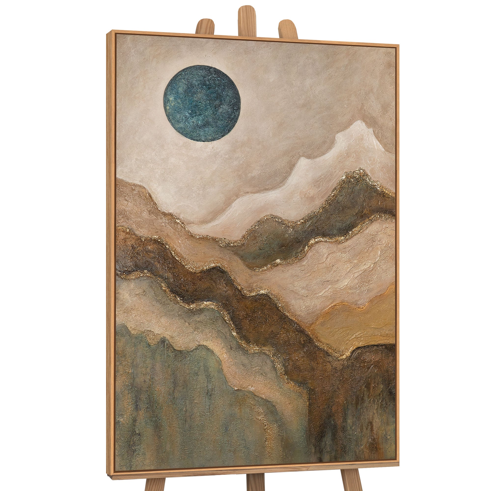 "Soleil Émeraude" est une peinture acrylique atmosphérique qui représente un paysage montagneux abstrait dans des tons naturels chauds. Des lignes fluides en beige, brun et or rencontrent la présence intense d'un soleil émeraude, conférant à l'œuvre profondeur et mysticisme. La surface texturée renforce la naturalité et donne à la composition un caractère expressif.
