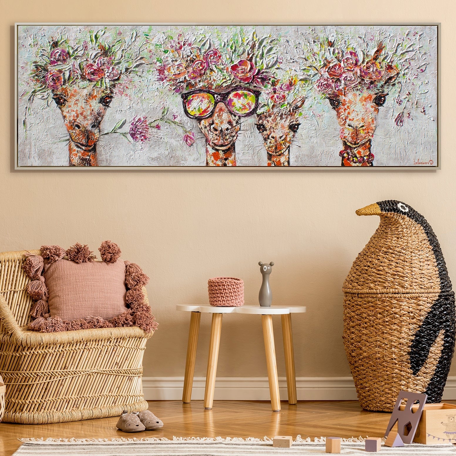 Ein lebendiges wandbilder acryl mit fröhlichen Giraffen in einem modernen Stil sorgt für eine positive Atmosphäre in jedem Raum. So kann es sowohl im Arbeitsbereich als auch in den Ruheräumen platziert werden. Darüber hinaus sind diese positiven Giraffen eine gute Ergänzung zu einem hellen und gemütlichen Kinderzimmer.