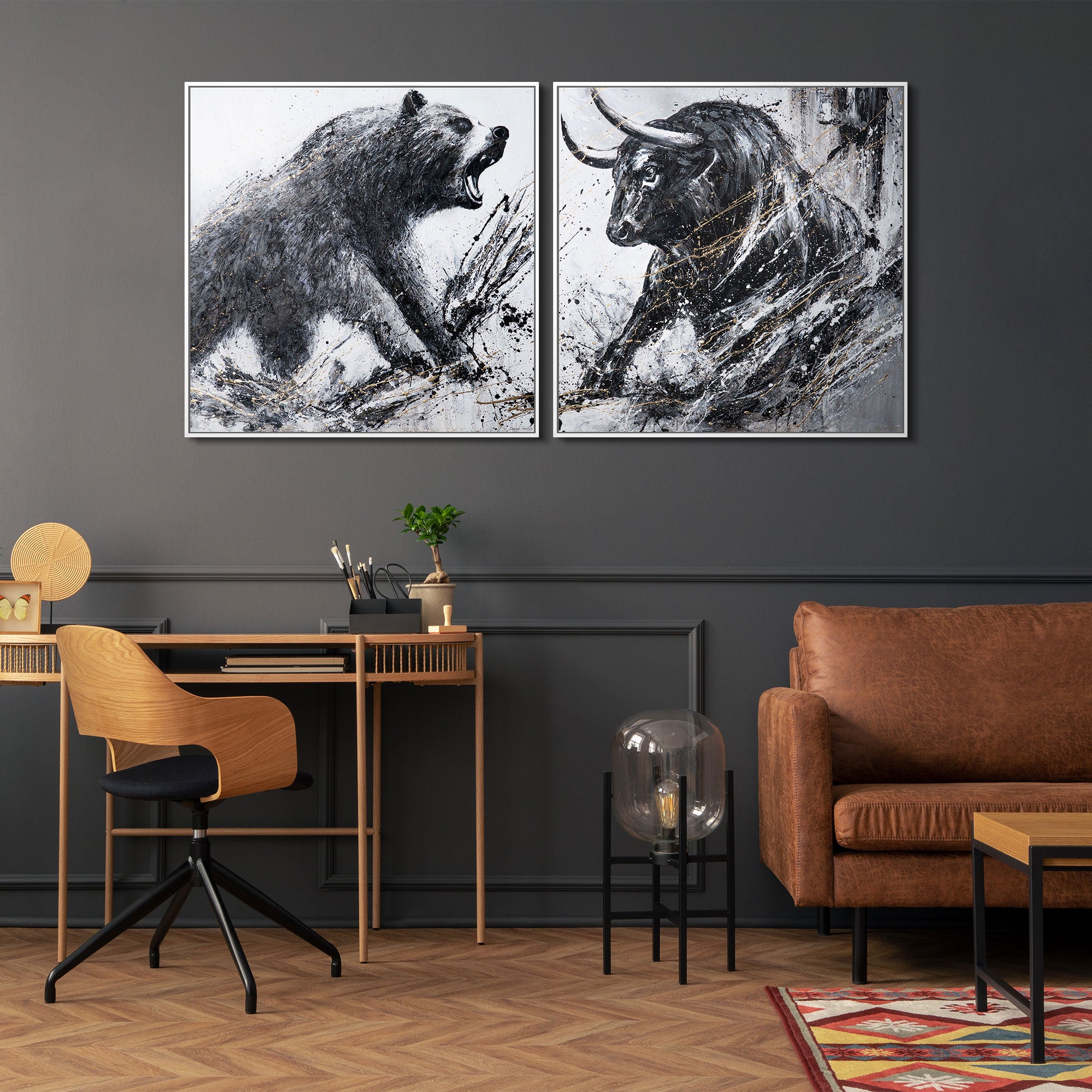 Ce diptyque saisissant met en scène deux symboles puissants du monde des marchés : l’ours rugissant et le taureau chargeant. Réalisées en noir et blanc contrasté, rehaussées de touches dorées, les deux toiles reflètent non seulement l’énergie animale, mais aussi des contrastes émotionnels tels que l’attaque et la défense, la maîtrise et l’impulsion. La texture des coups de pinceau et les éclats de couleur dynamiques confèrent aux motifs une tension et une expressivité accrues.