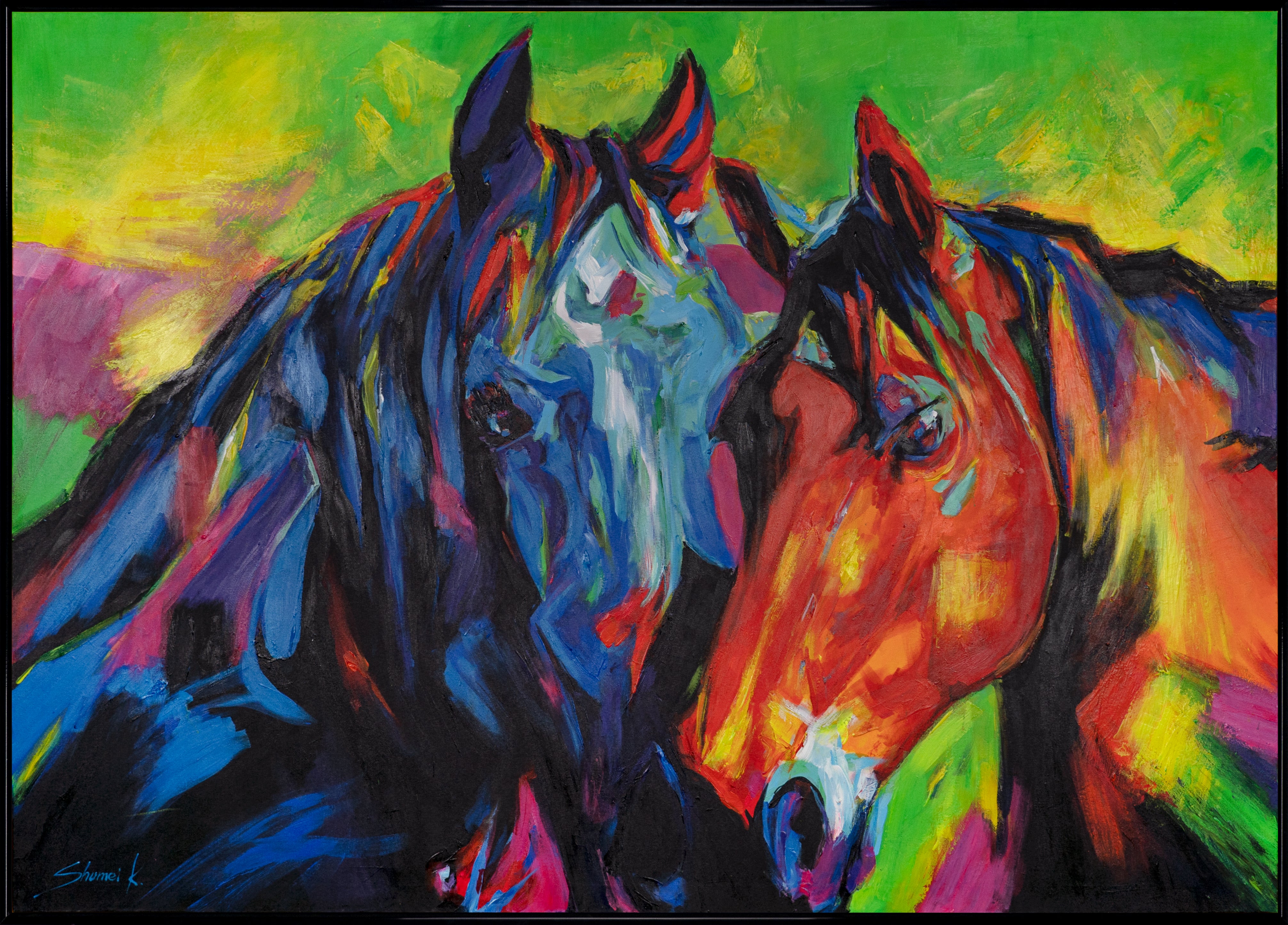 Tauchen Sie ein in eine Welt lebendiger Farben und Emotionen mit diesem handgemalten Acrylgemälde für Ihr Wohnzimmer. Die leuchtenden Blautöne treffen auf warme Rottöne und kräftiges Grün, was den beiden majestätischen Pferden eine unglaubliche Präsenz und Tiefe verleiht. Der goldene Rahmen rundet das Kunstwerk perfekt ab und fügt sich nahtlos in jeden Wohnraum ein.