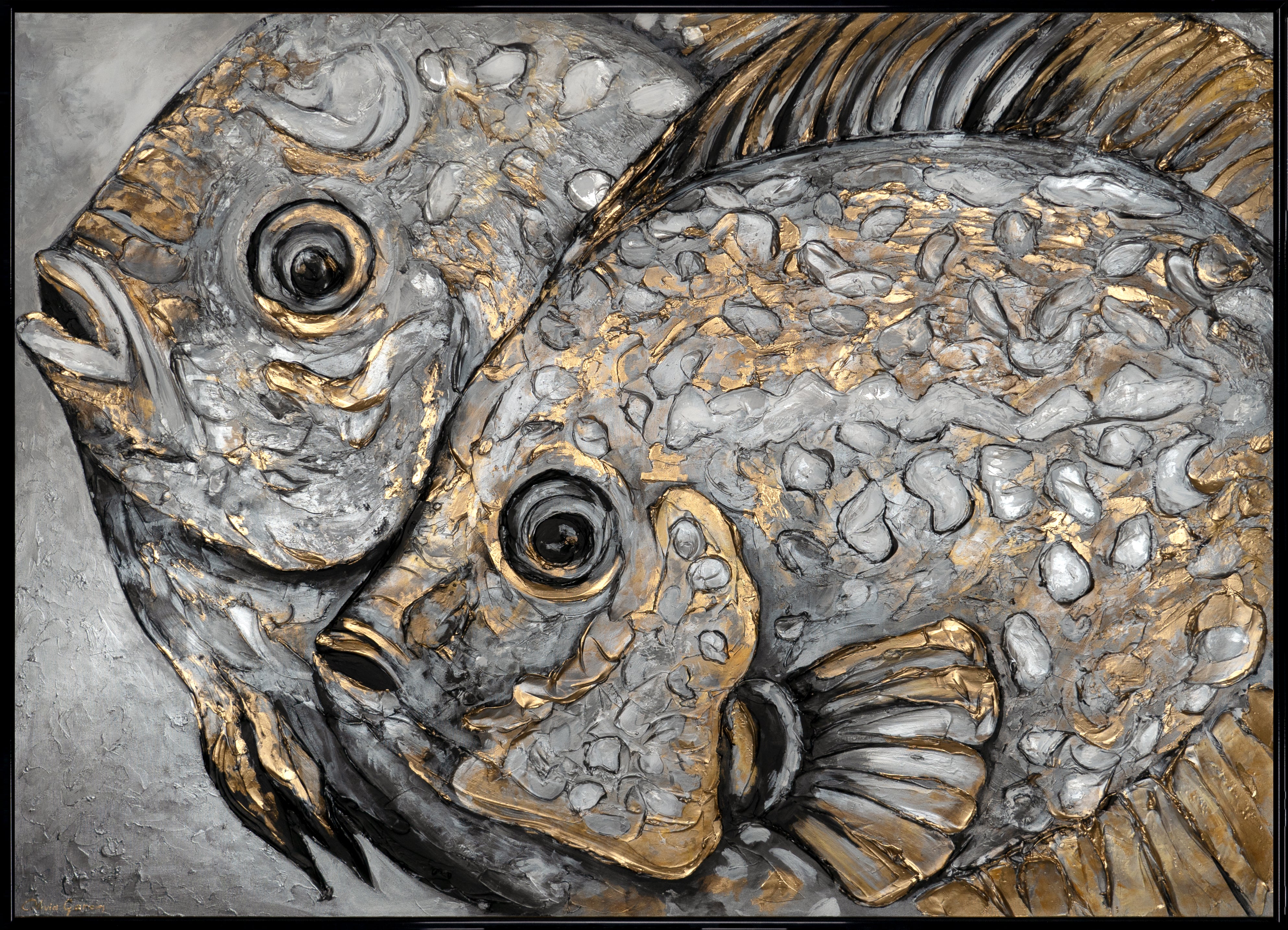• Handgemaltes Wandbild Fisch Struktur Grau Gold