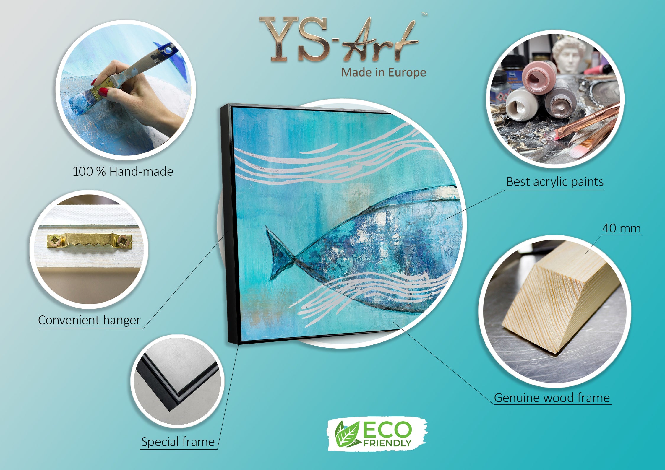 Das Bild mit Fisch passt ideal in das Innere einer Stadtwohnung oder eines Landhauses, in ein Wohnzimmer oder ein Arbeitszimmer. Sie erhalten nicht nur ein Gemälde, sondern ein exklusives und einzigartiges Kunstwerk, das von einem talentierten Künstler gemalt wurde.