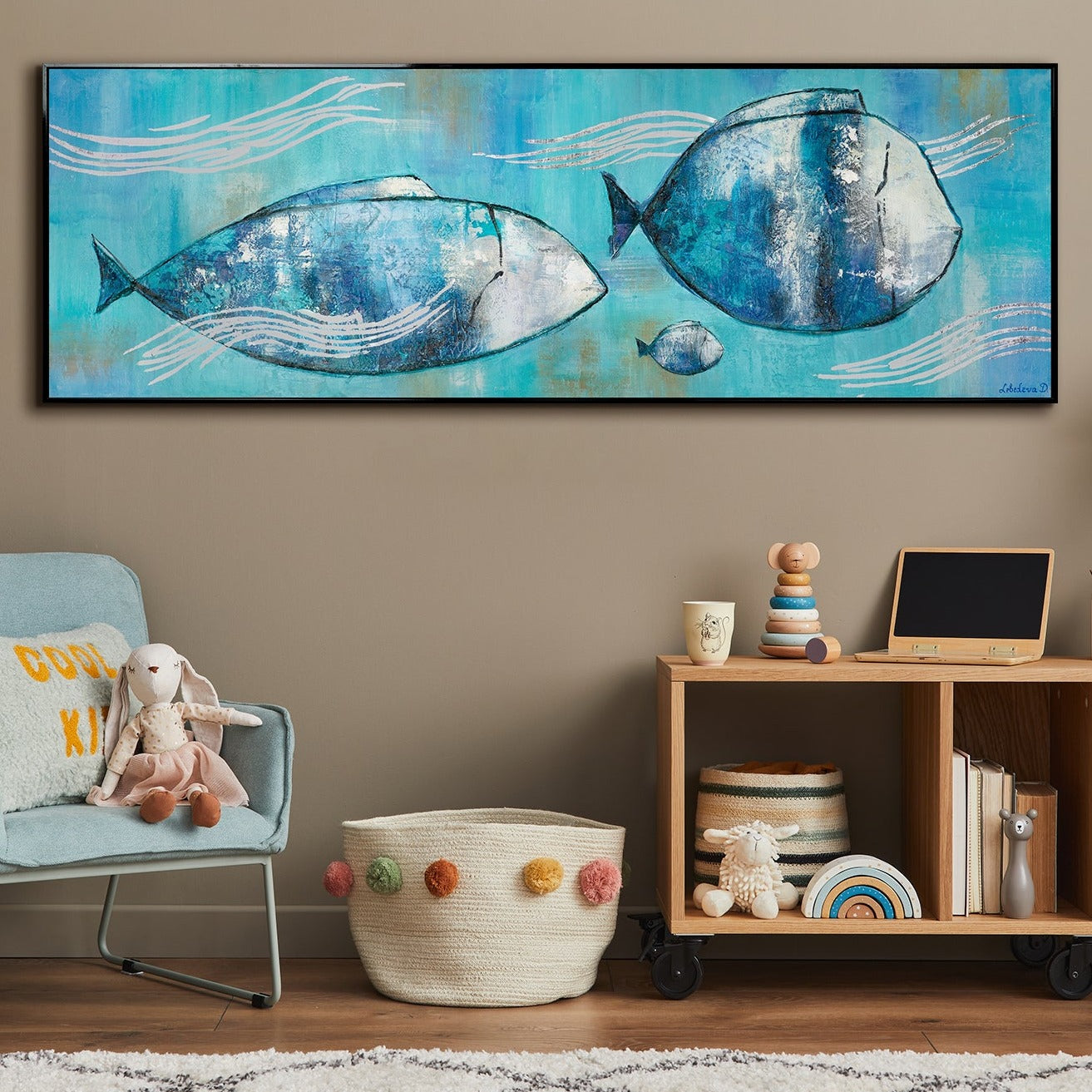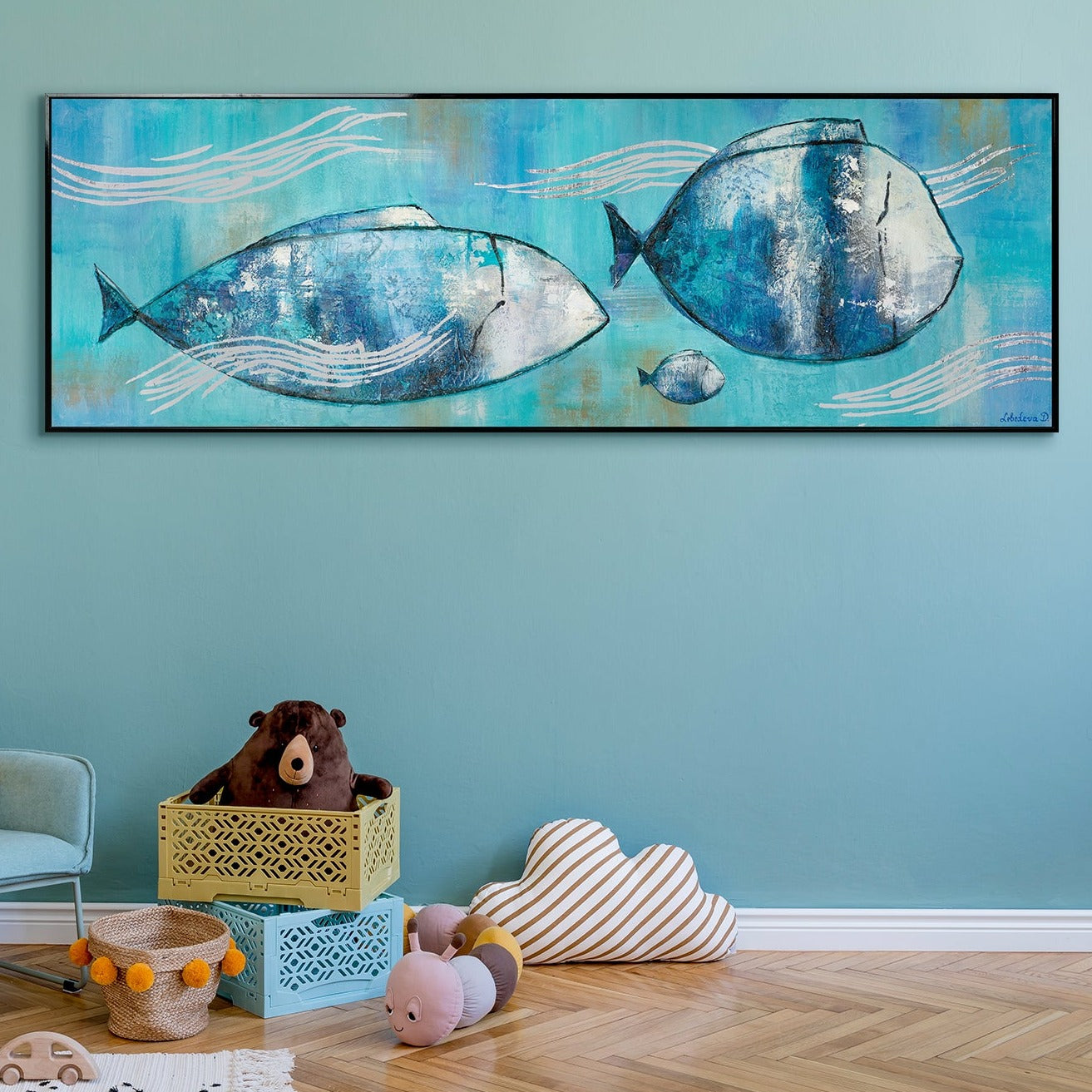 Moderne malerei acryl "Reisende Fische" 150x50cm
