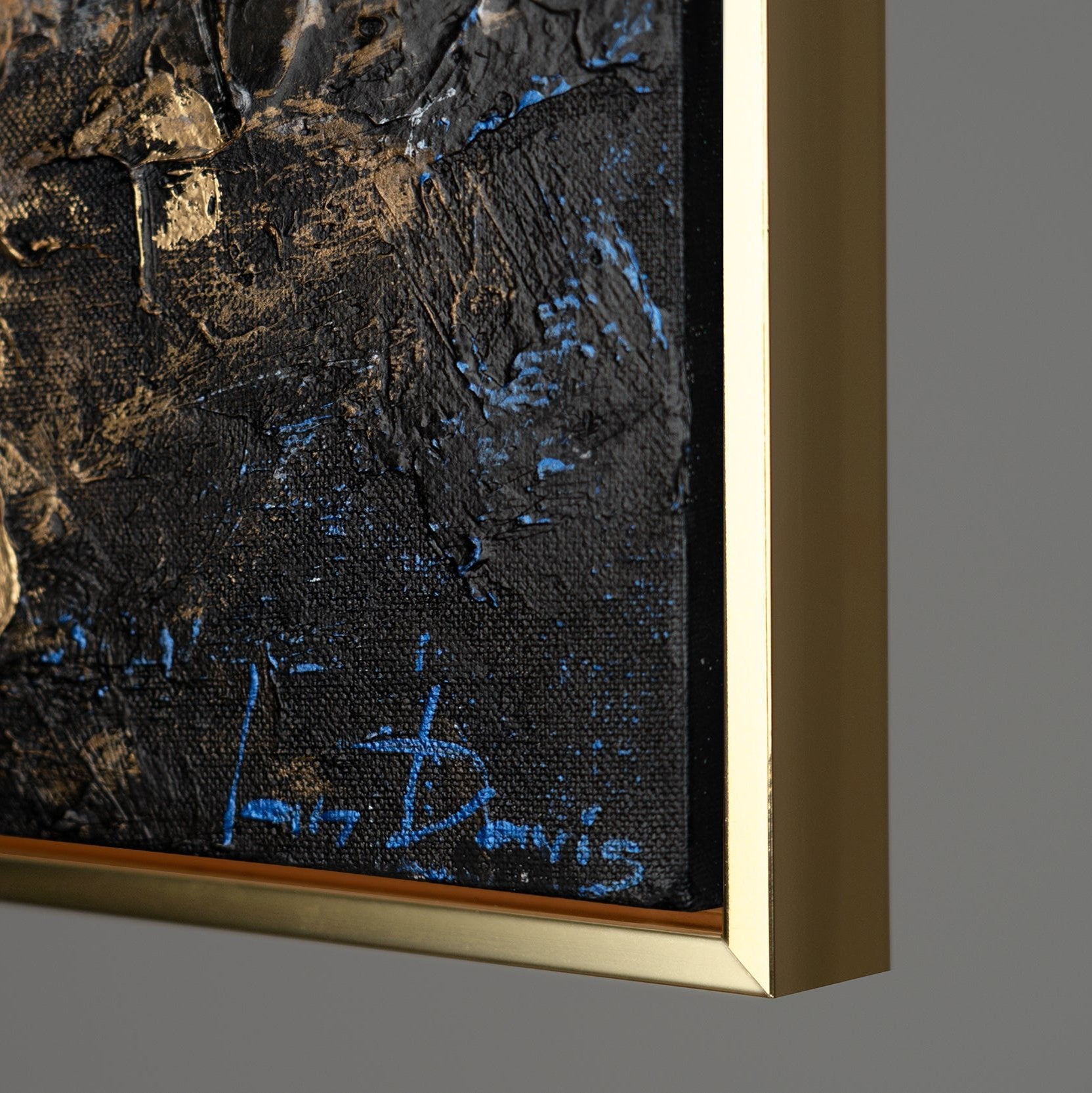 Dieses beeindruckende handgemalte Acrylbild auf Leinwand ist ein Meisterwerk moderner abstrakter Kunst. Die Kombination von kräftigen schwarzen, goldenen und blauen Akzenten verleiht dem Kunstwerk eine faszinierende Tiefe und Struktur.
