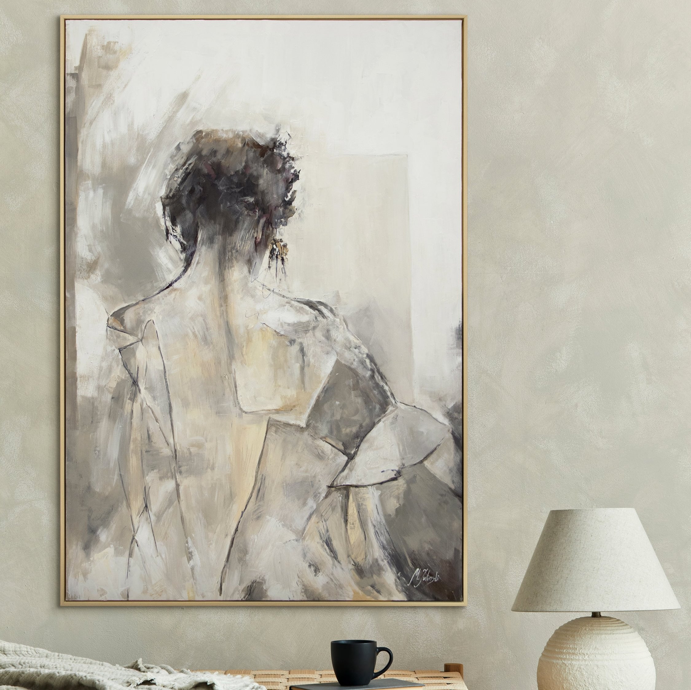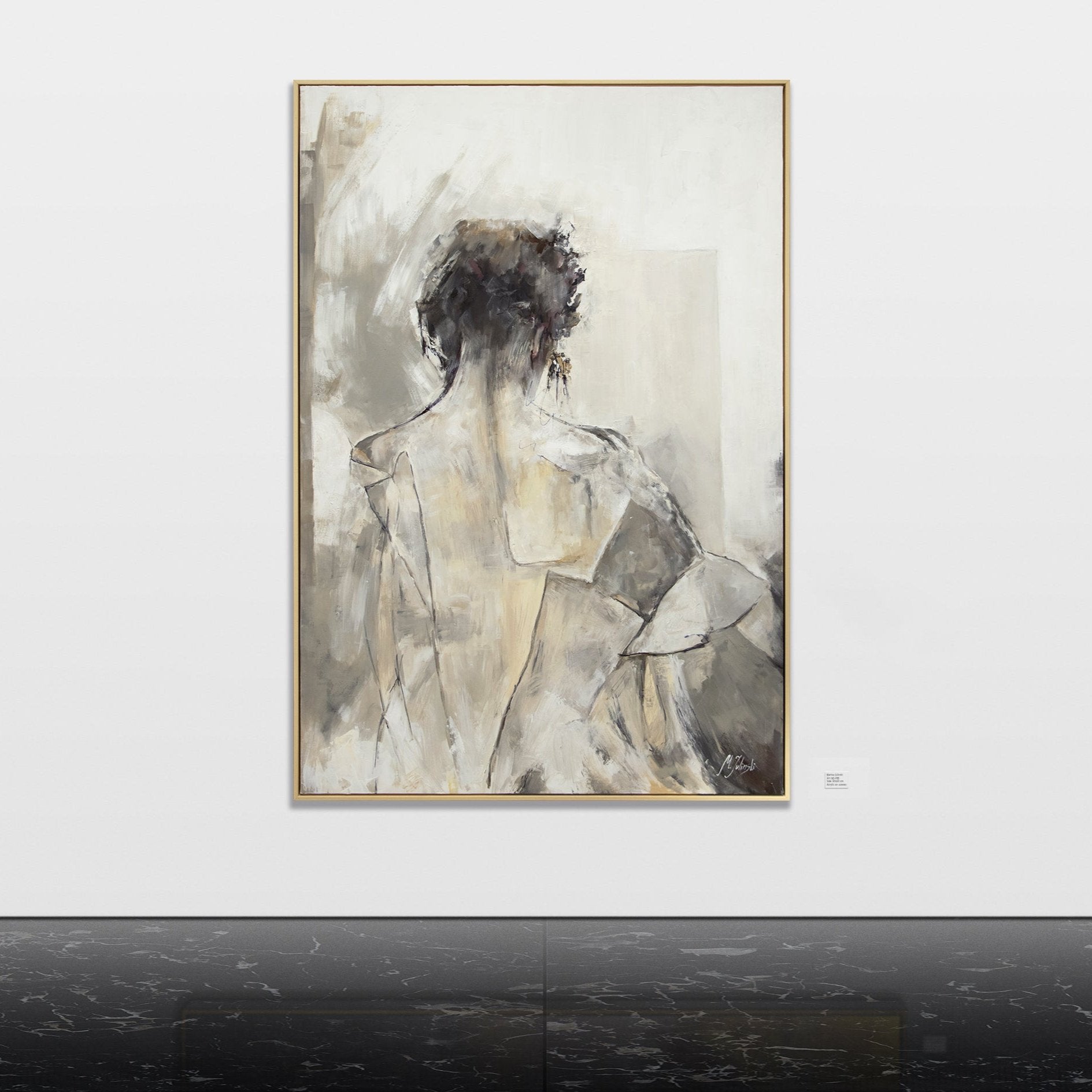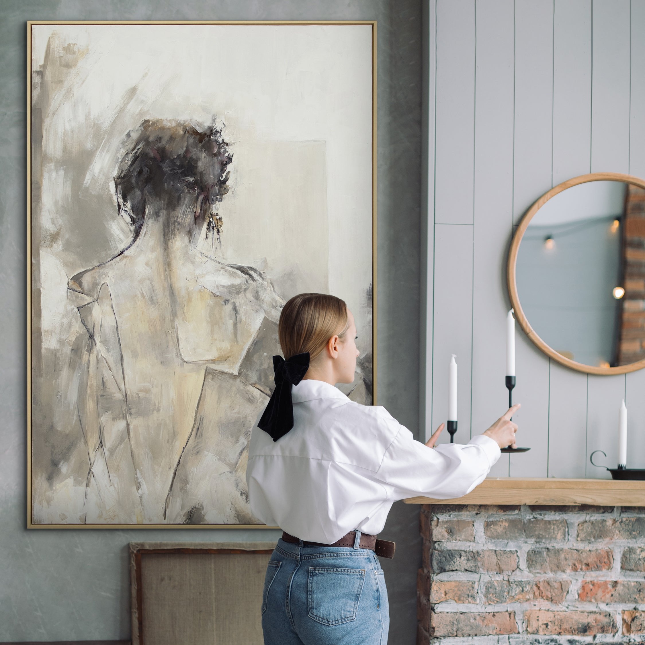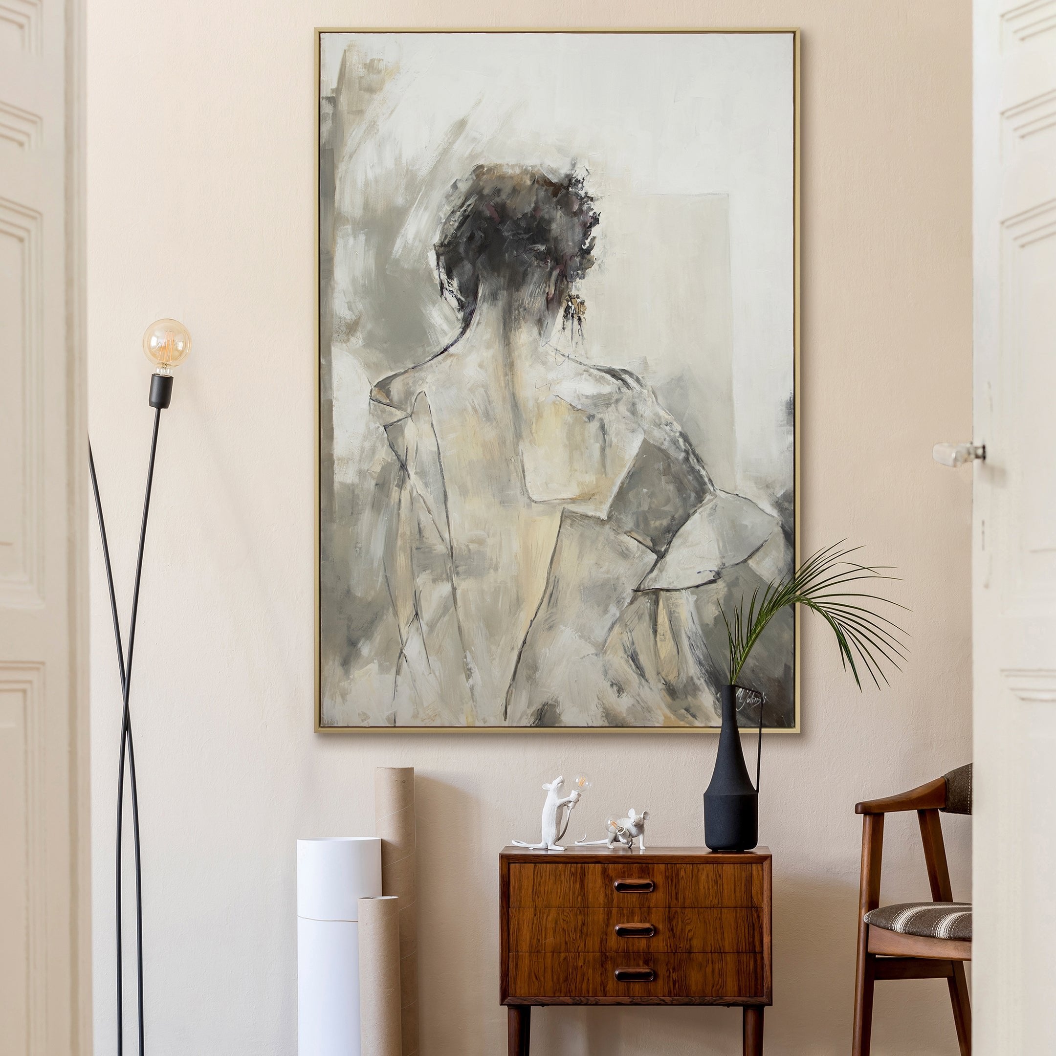 Dieses atemberaubende abstrakte Gemälde zeigt die Rückansicht einer Frau, die in sanften Farben und expressiven Pinselstrichen dargestellt ist. Die harmonische Mischung aus Grautönen und dezenten Akzenten verleiht dem Bild eine elegante und zeitlose Ästhetik.