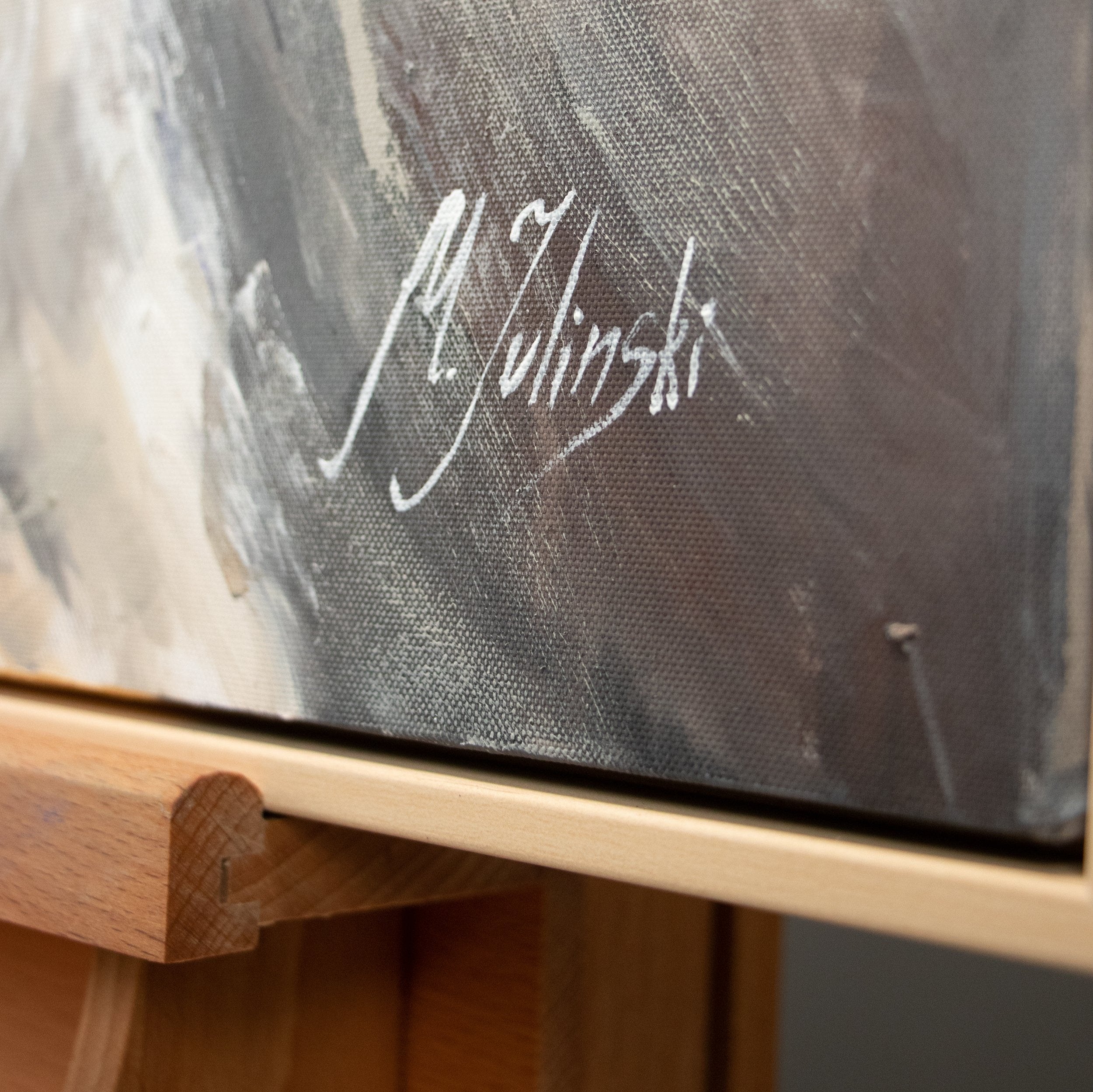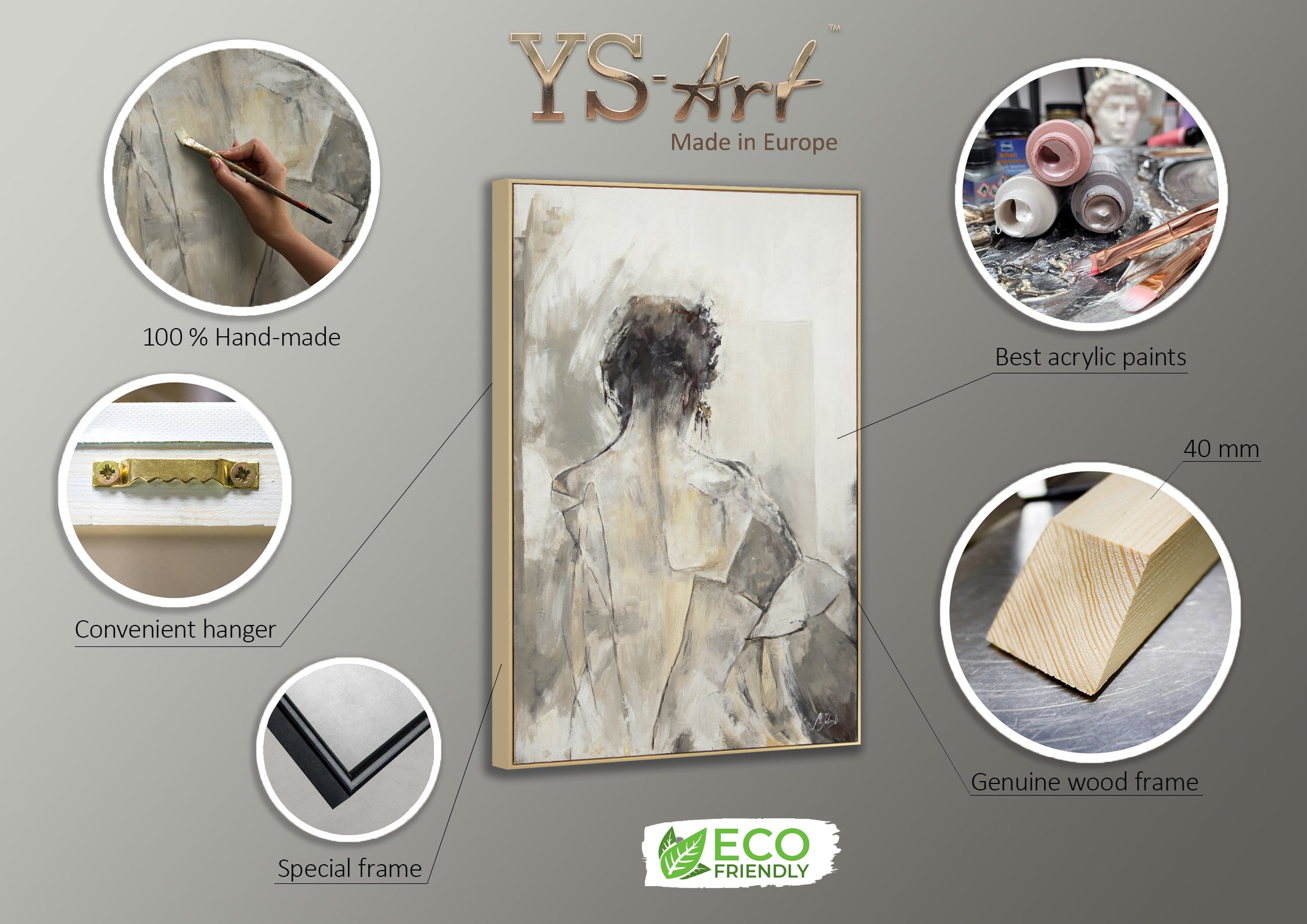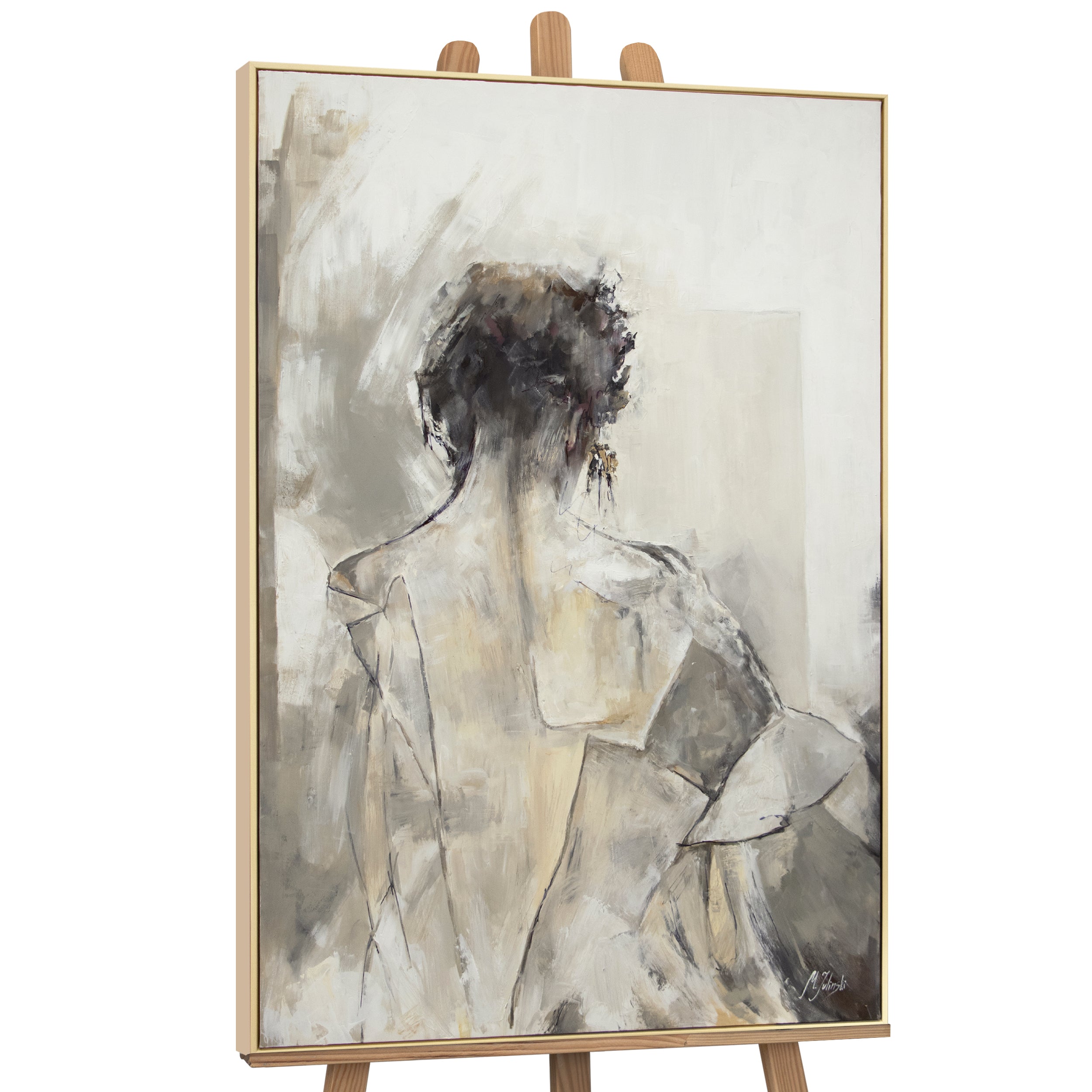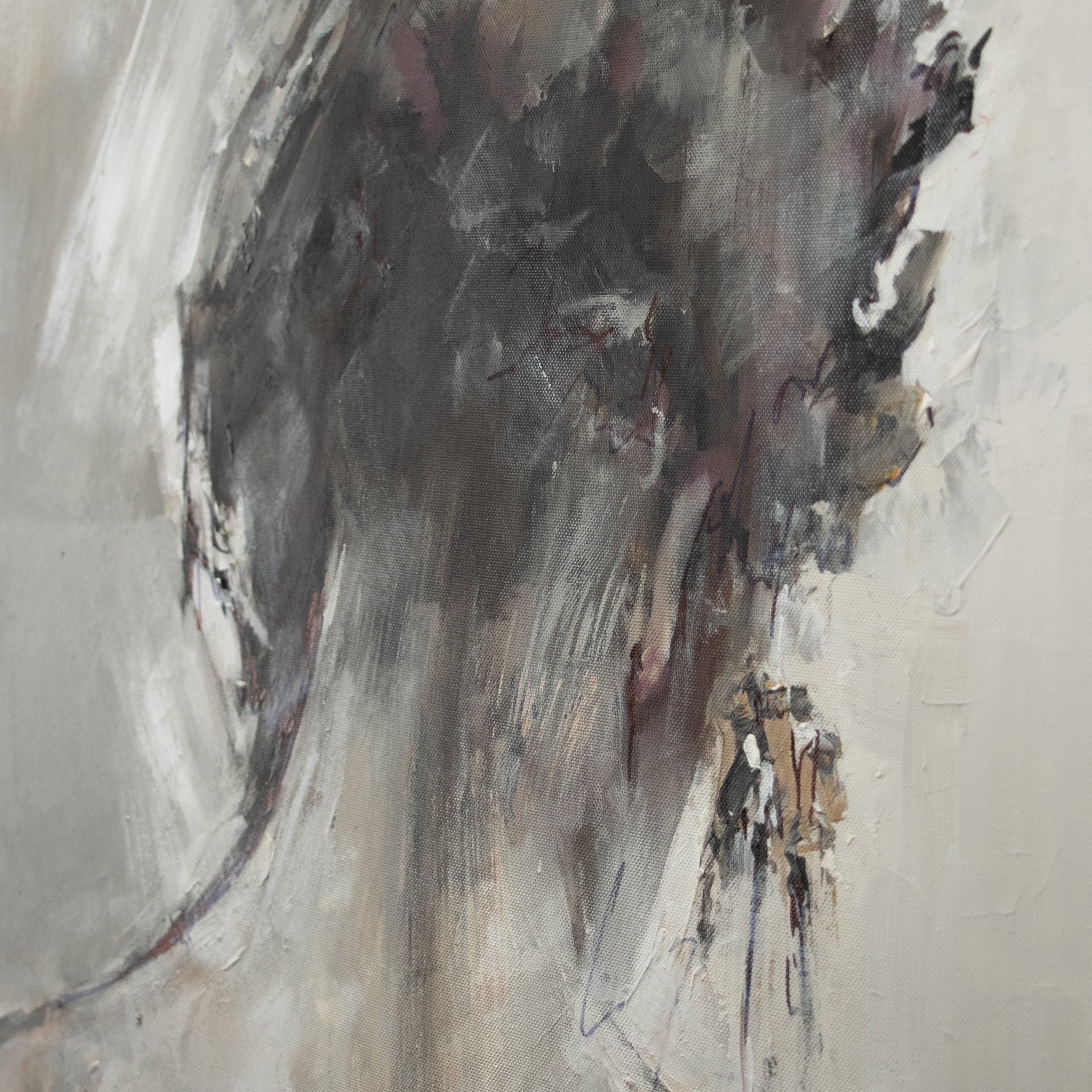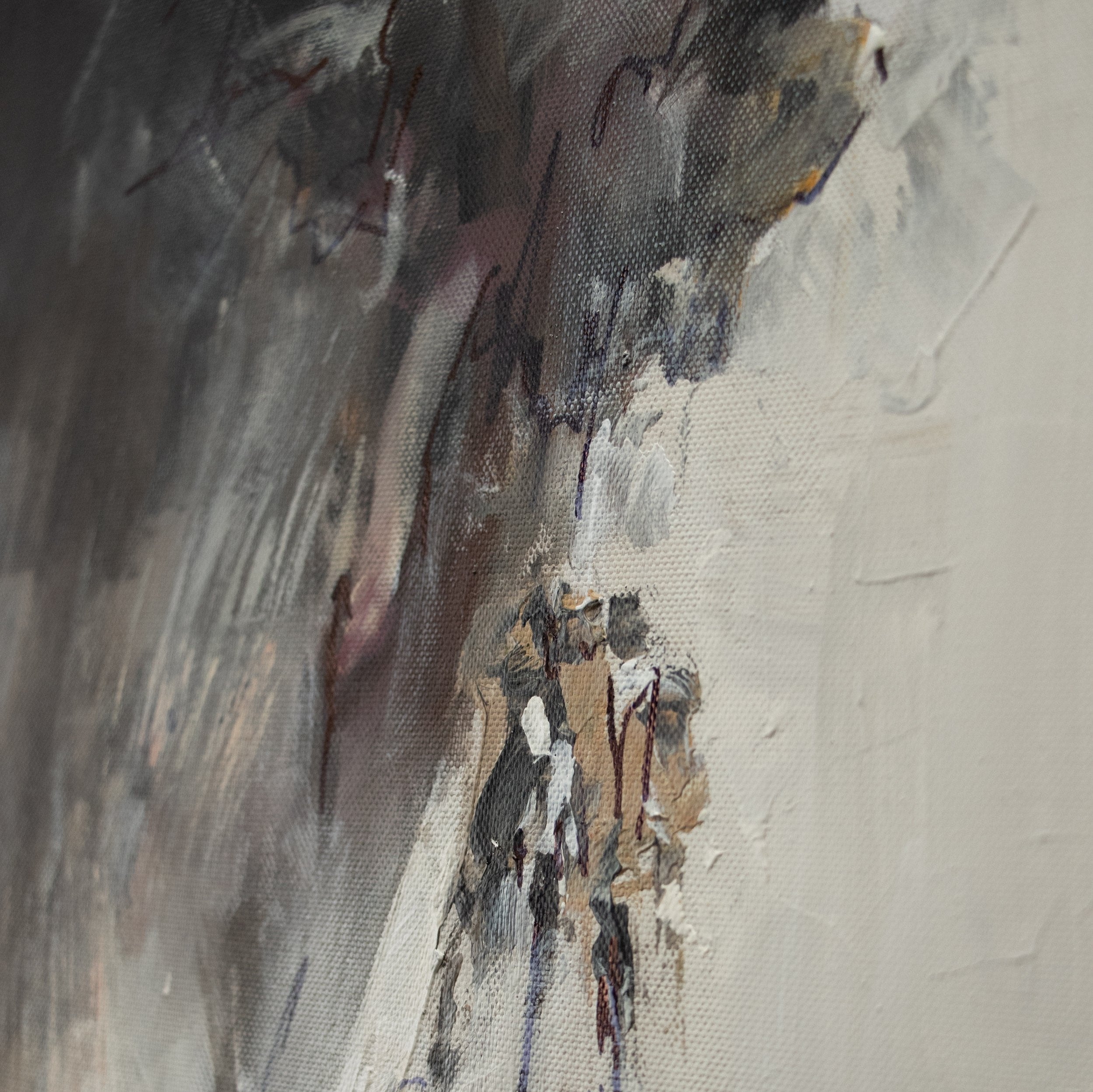 Dieses atemberaubende abstrakte Gemälde zeigt die Rückansicht einer Frau, die in sanften Farben und expressiven Pinselstrichen dargestellt ist. Die harmonische Mischung aus Grautönen und dezenten Akzenten verleiht dem Bild eine elegante und zeitlose Ästhetik.