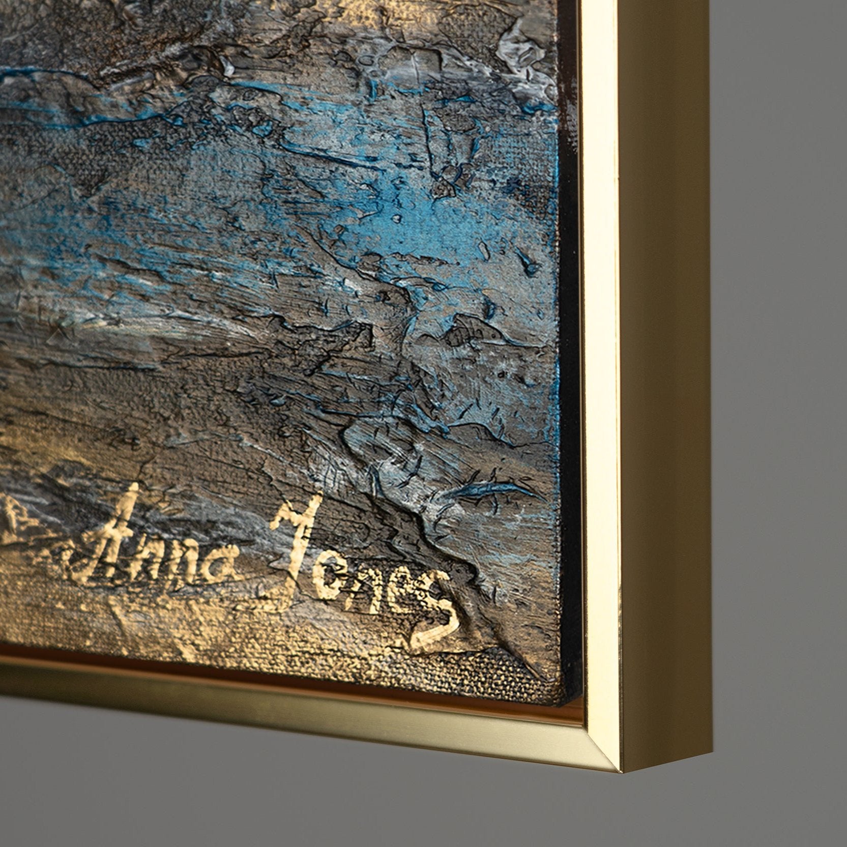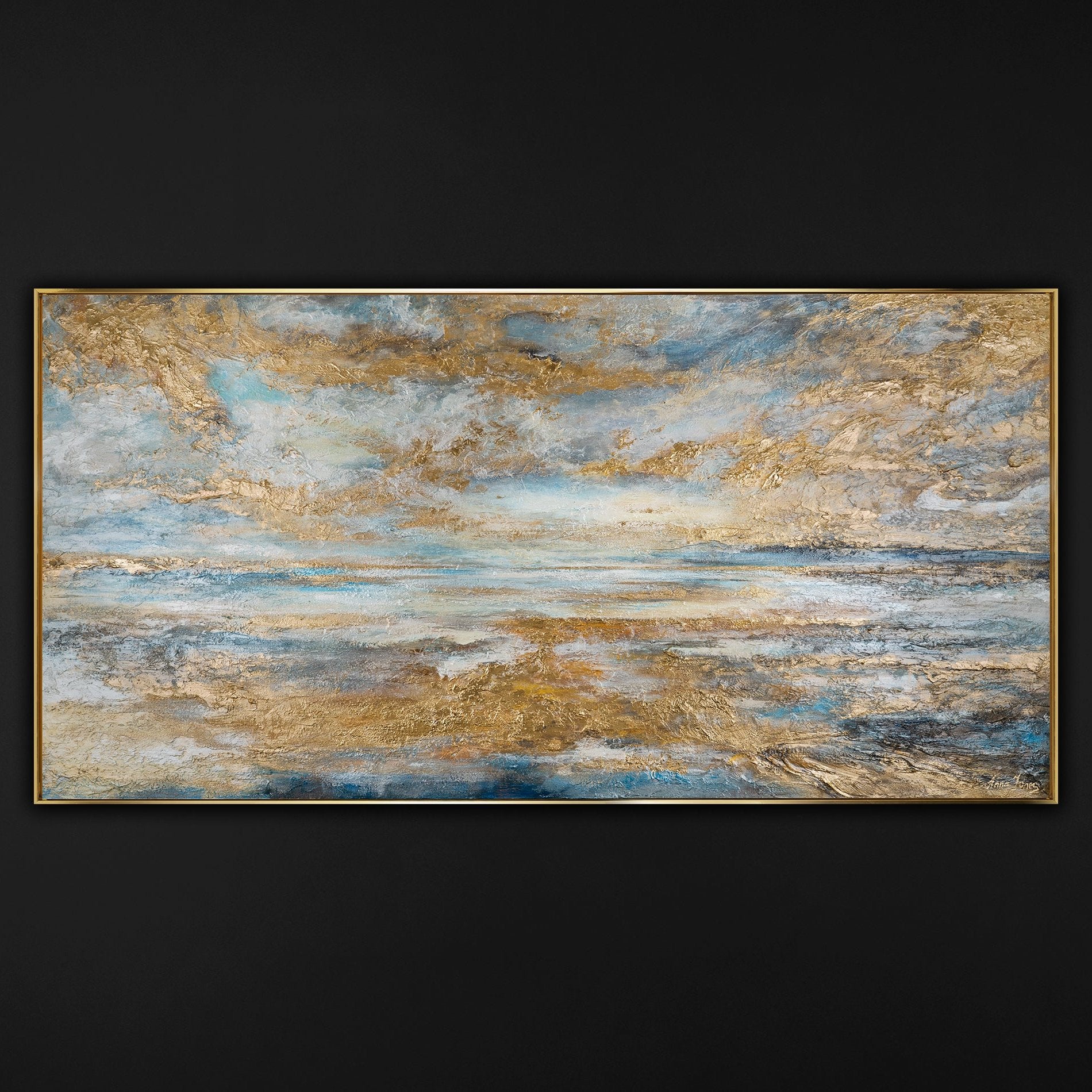 Dieses atemberaubende Acrylgemälde zeigt eine abstrakte Landschaft mit einer Mischung aus Blau- und Goldtönen, die das weite Meer und den Himmel darstellen. Die luxuriösen goldenen Akzente verleihen dem Bild einen Hauch von Eleganz und Exklusivität.