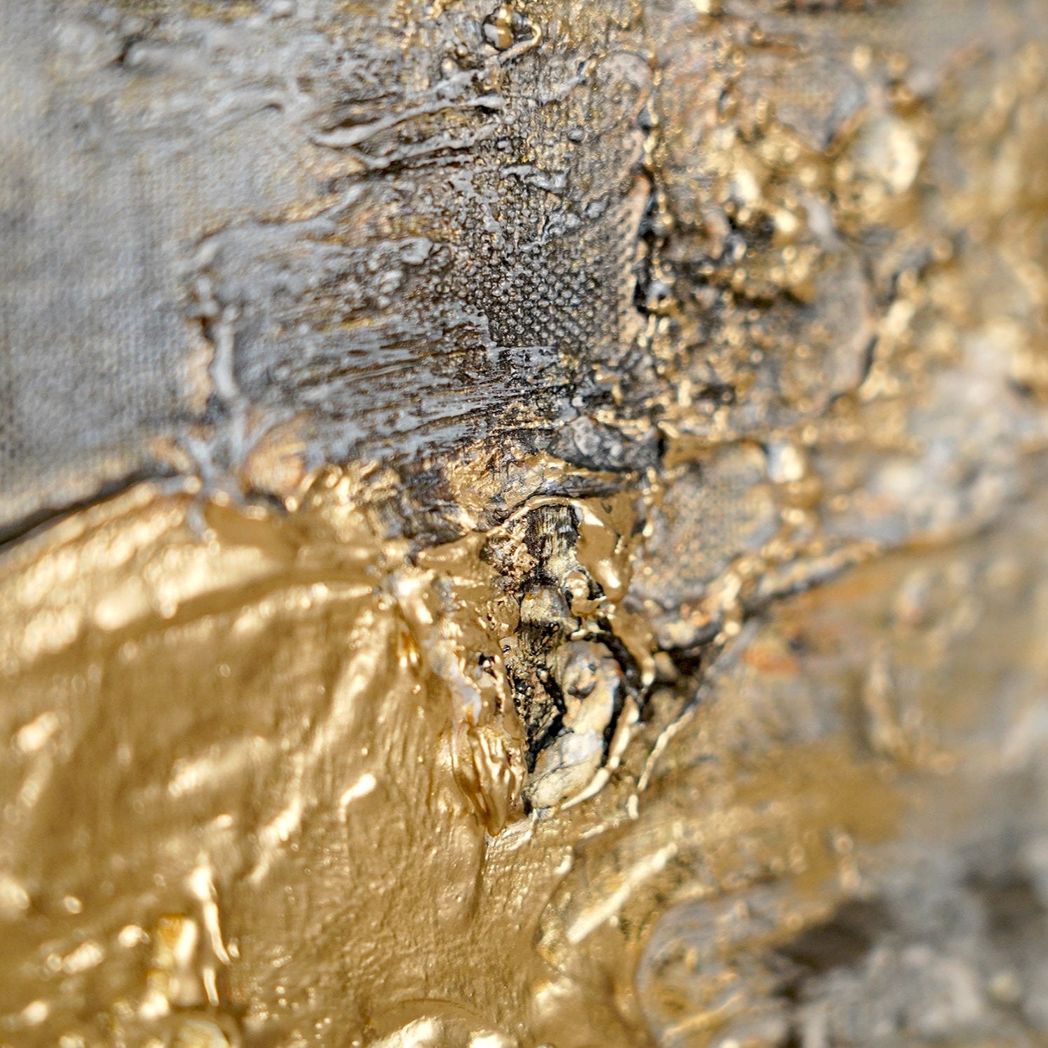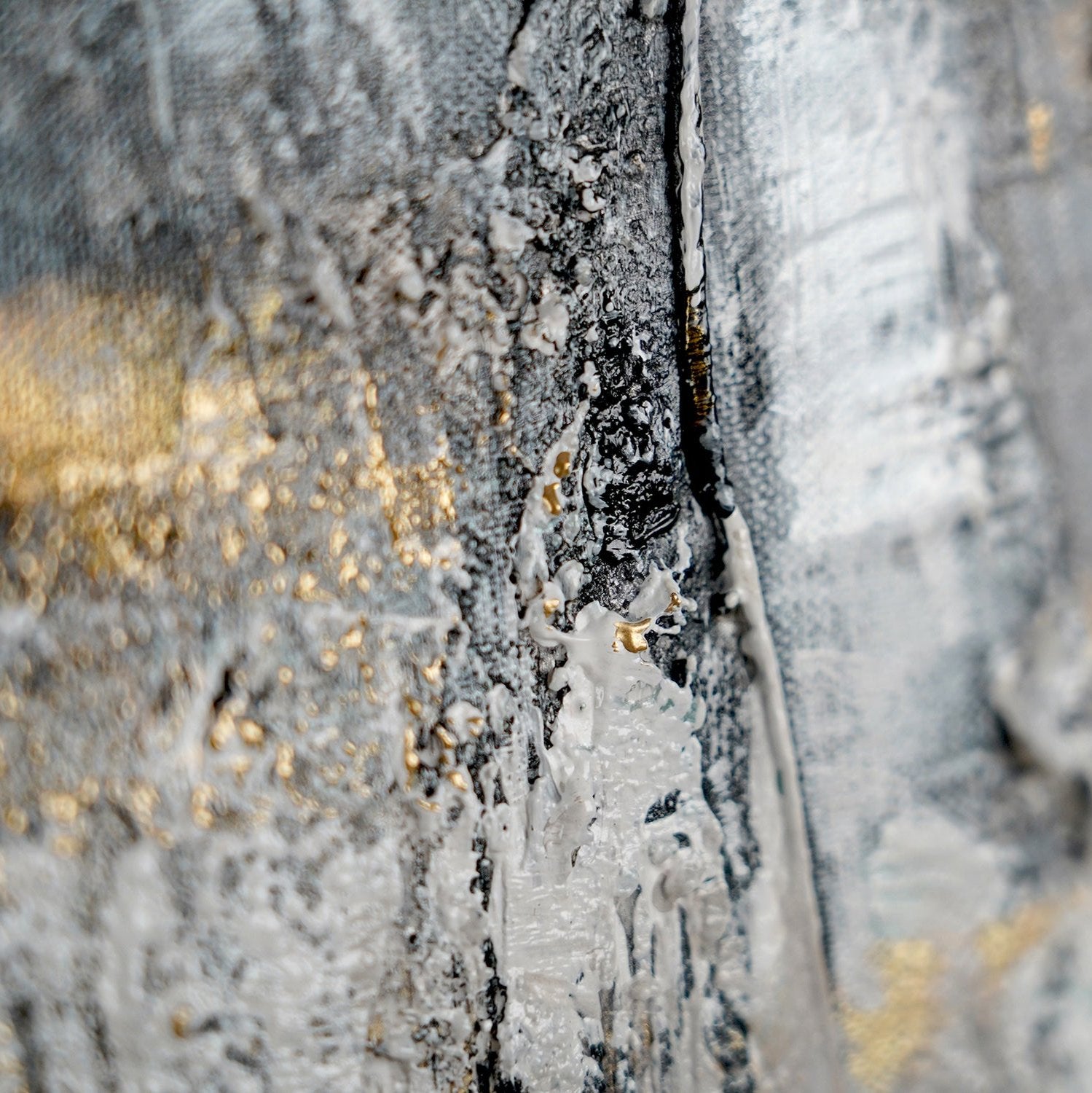 Dieses handgemalte abstrakte Kunstwerk auf Leinwand bringt eine moderne und luxuriöse Atmosphäre in Ihr Zuhause. Mit den beeindruckenden Goldakzenten und der harmonischen Kombination aus Schwarz, Weiß und Grau, wird dieses Bild zum Blickfang in jedem Raum.