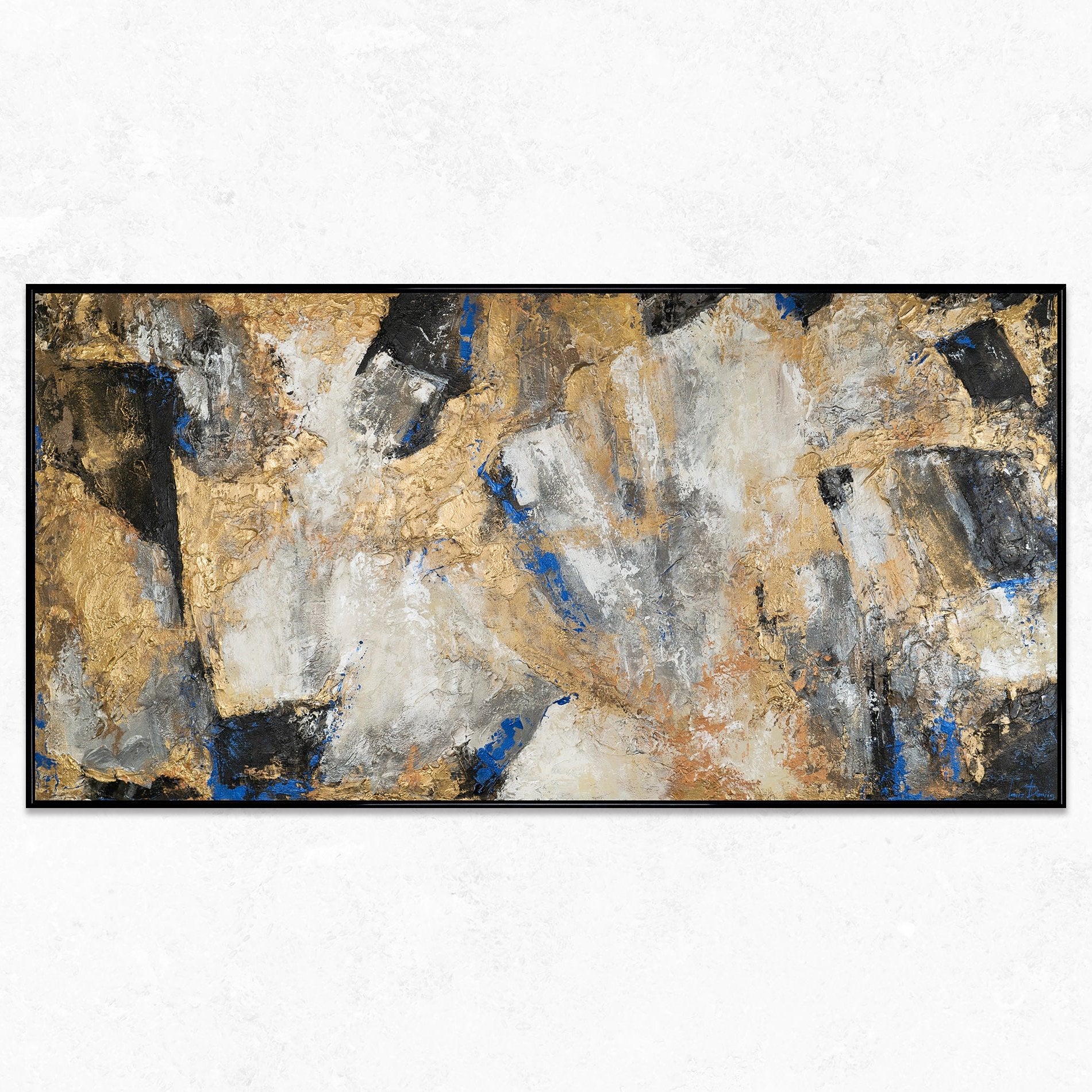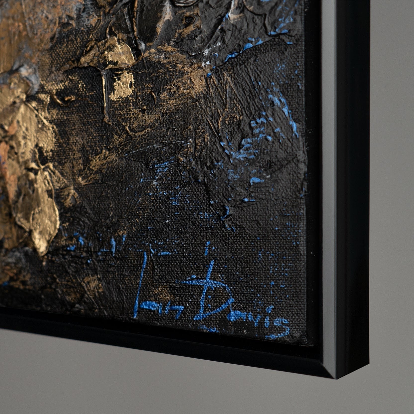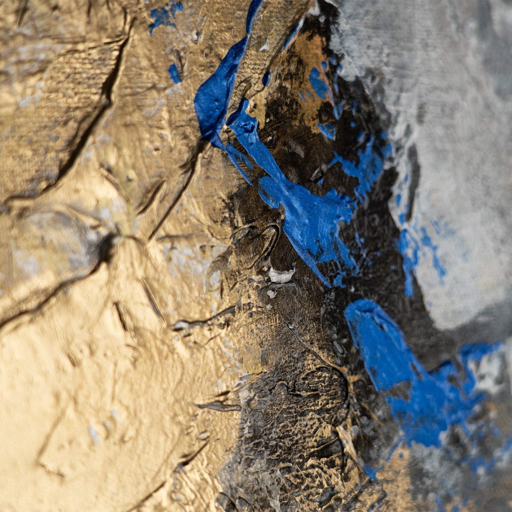 Dieses moderne abstrakte Gemälde ist ein Meisterwerk der handgemalten Acrylmalerei. Es kombiniert kräftige Goldakzente mit satten Schwarz- und Blautönen, die eine kraftvolle und dynamische Atmosphäre erzeugen. Die Struktur und Tiefe des Bildes verleihen Ihrem Raum eine luxuriöse und künstlerische Note.