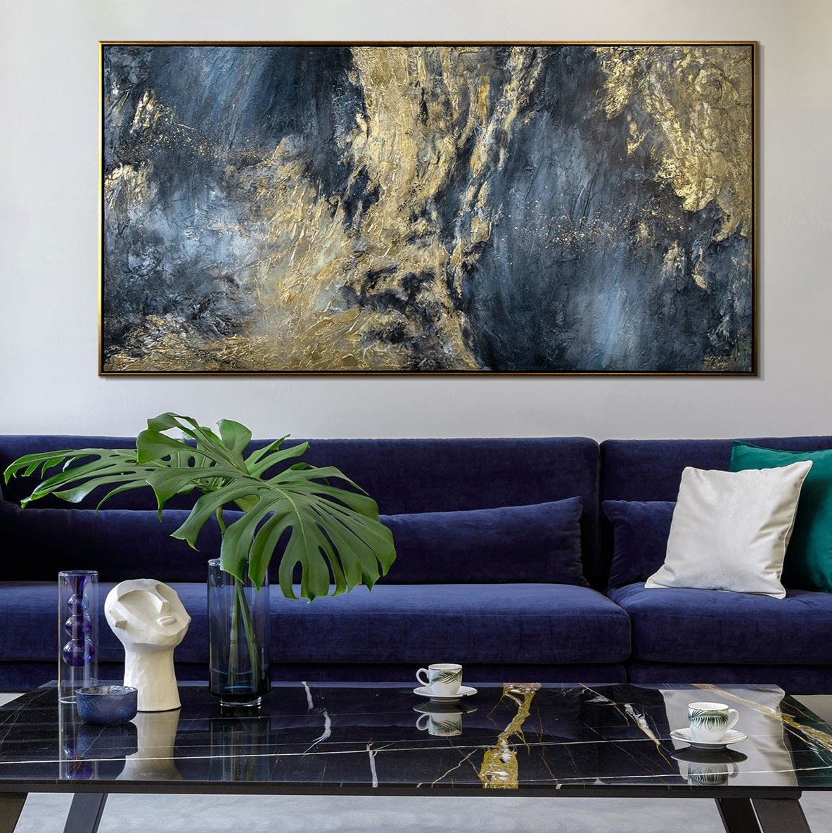Dieses beeindruckende, handgemalte Gemälde vereint die Eleganz von Goldakzenten mit tiefen Blautönen und schafft so eine kraftvolle und moderne Ästhetik. Die abstrakte Komposition und die Textur der Leinwand verleihen dem Werk eine tiefe Dynamik, die in jedem Raum eine starke Präsenz schafft.