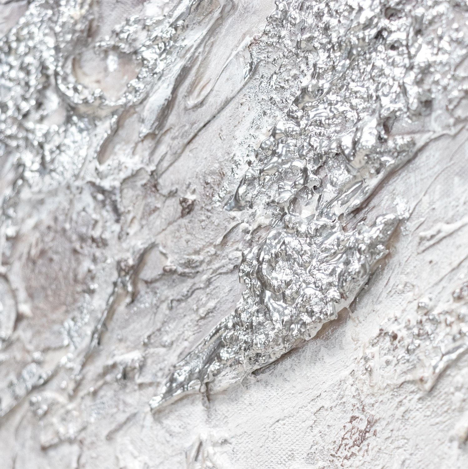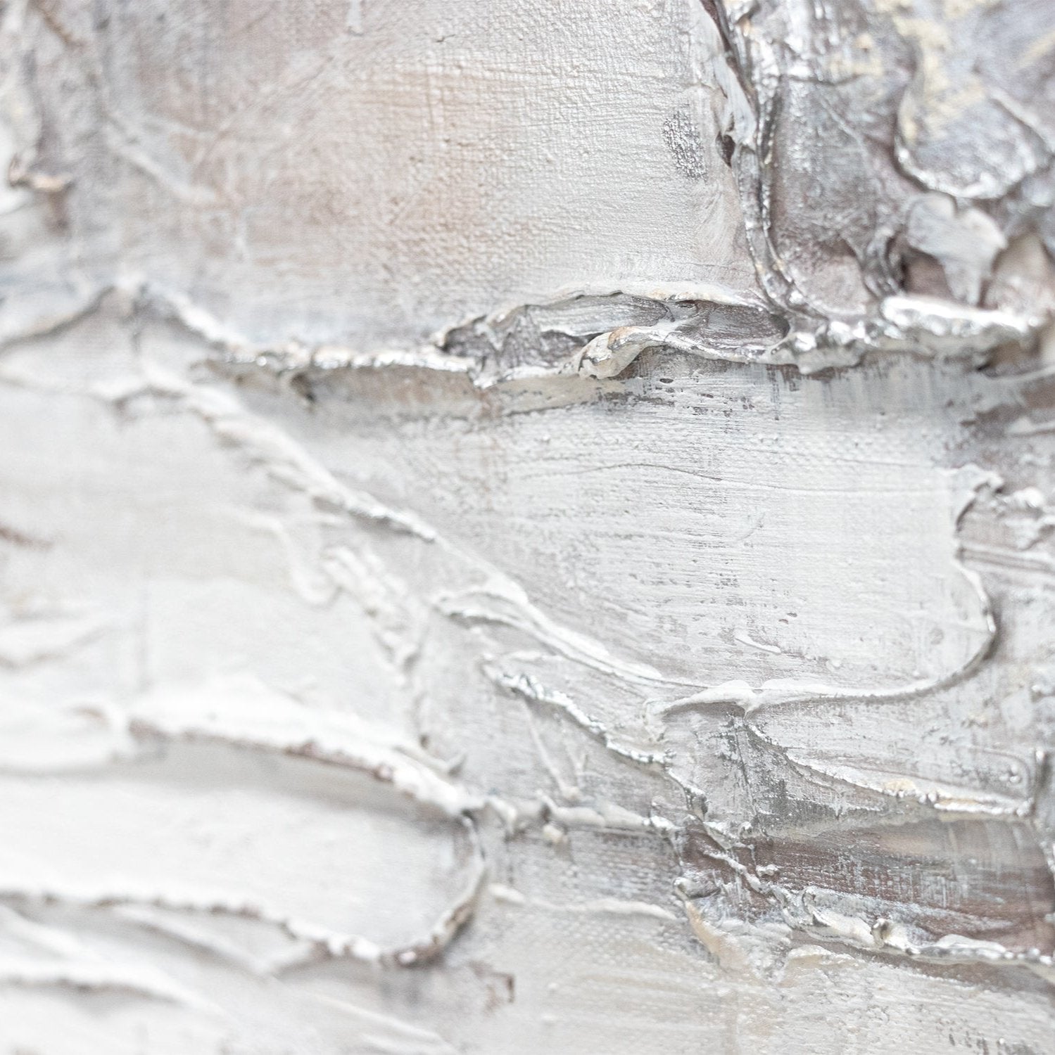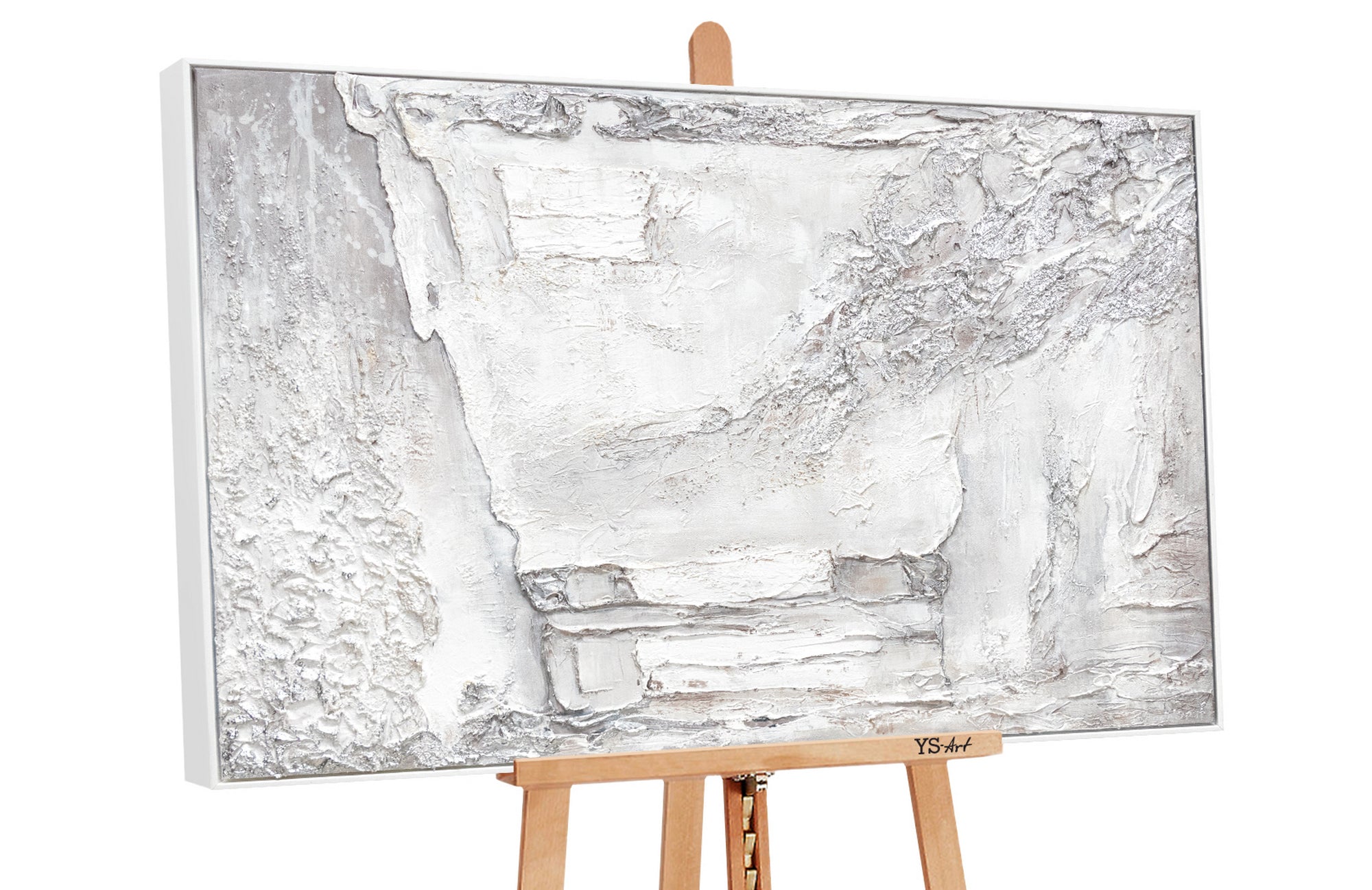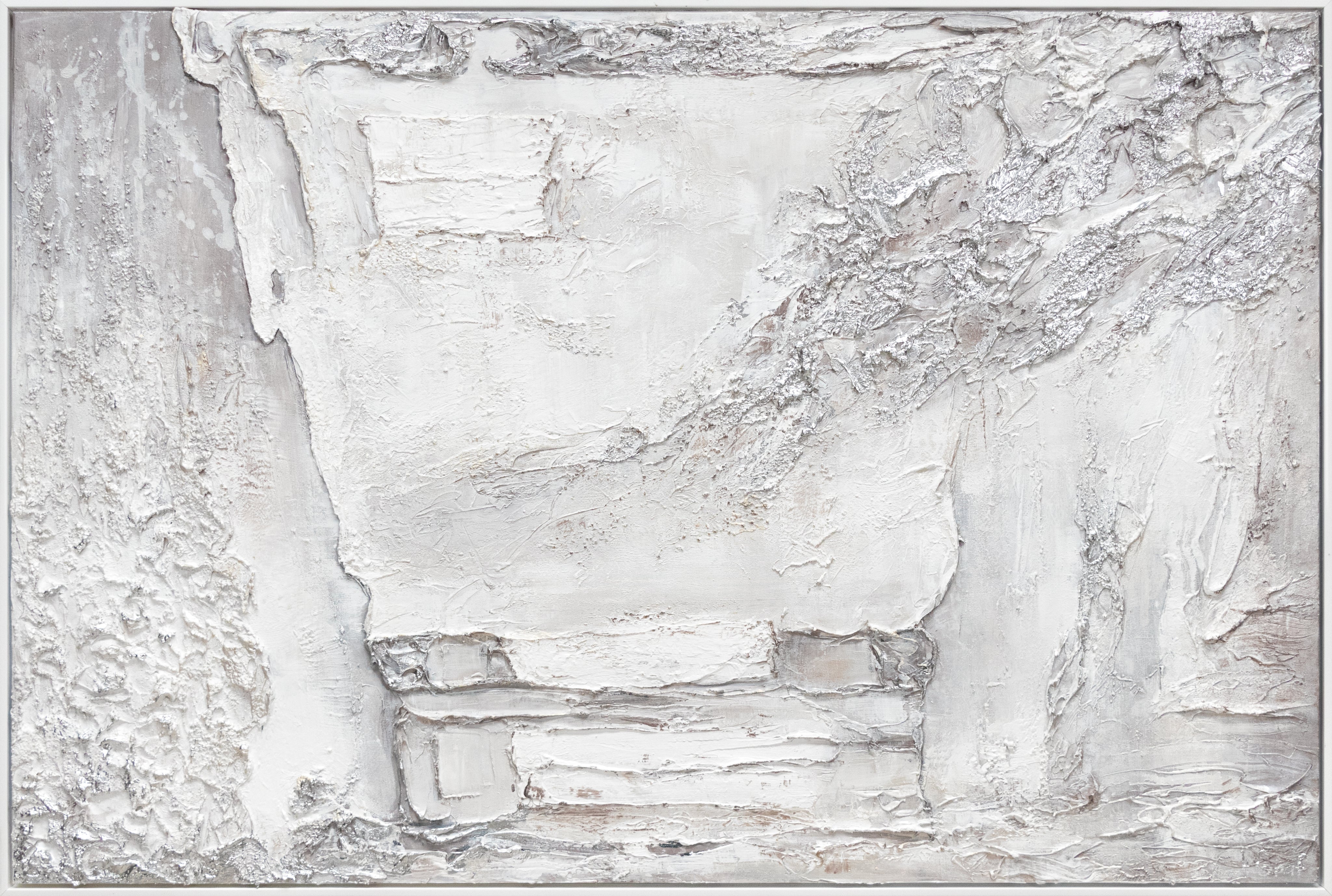 Abstraktes modernes Gemälde auf Leinwand – Strukturbild in Weiß und Silber mit Rahmen