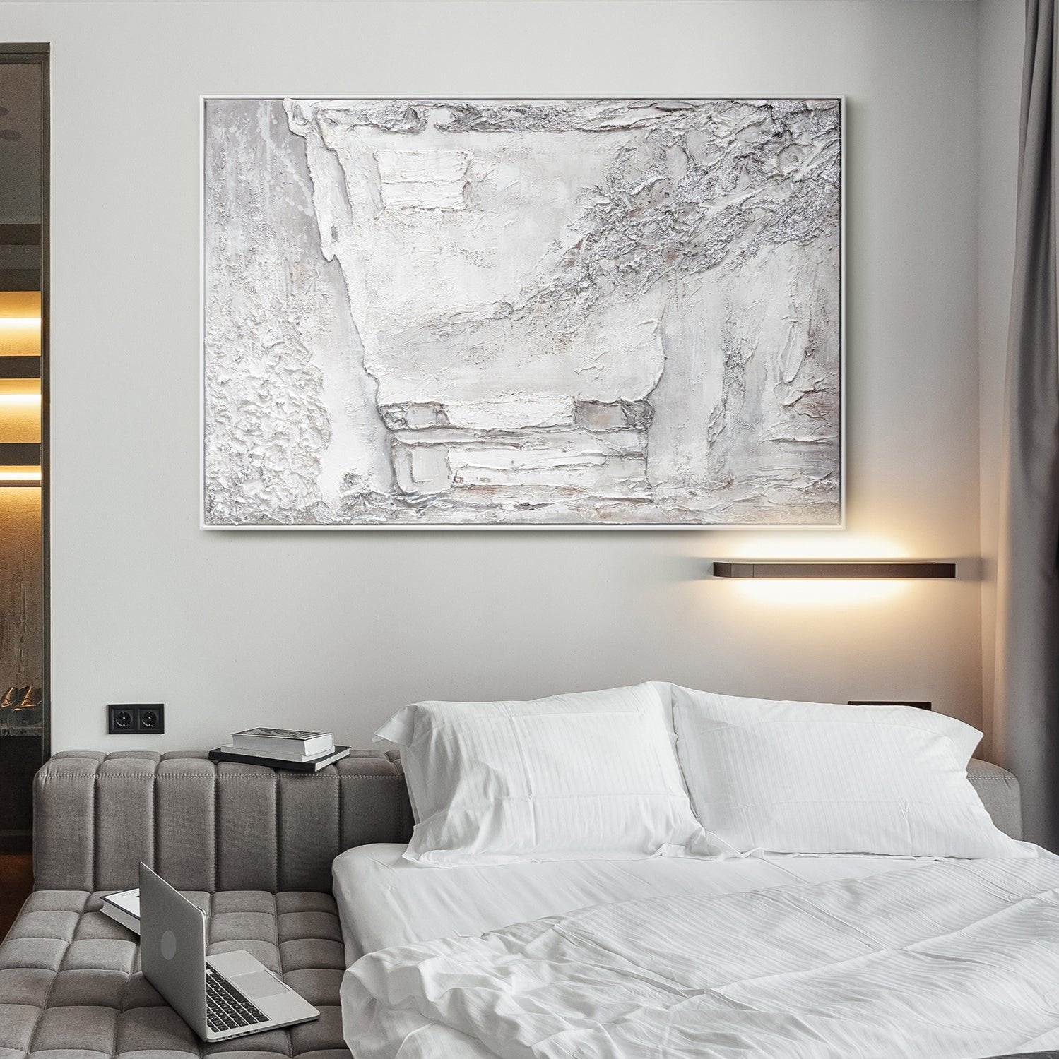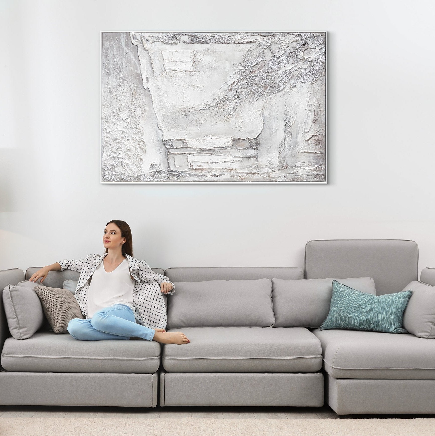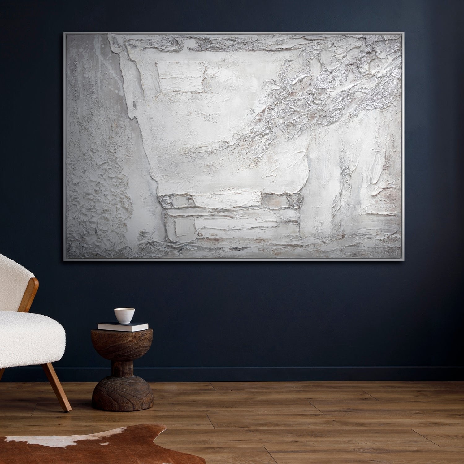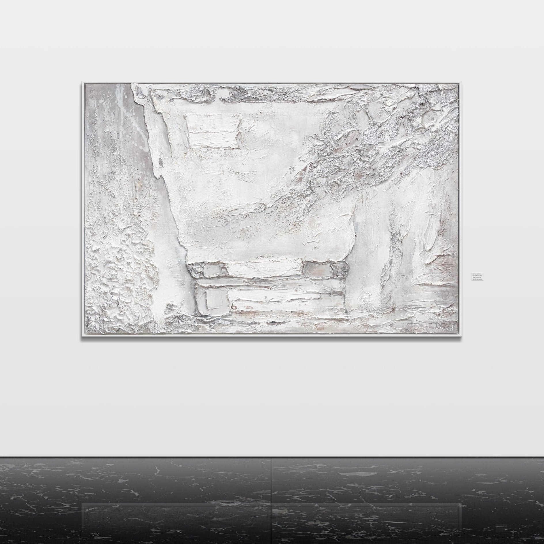 Abstraktes modernes Gemälde auf Leinwand – Strukturbild in Weiß und Silber mit Rahmen