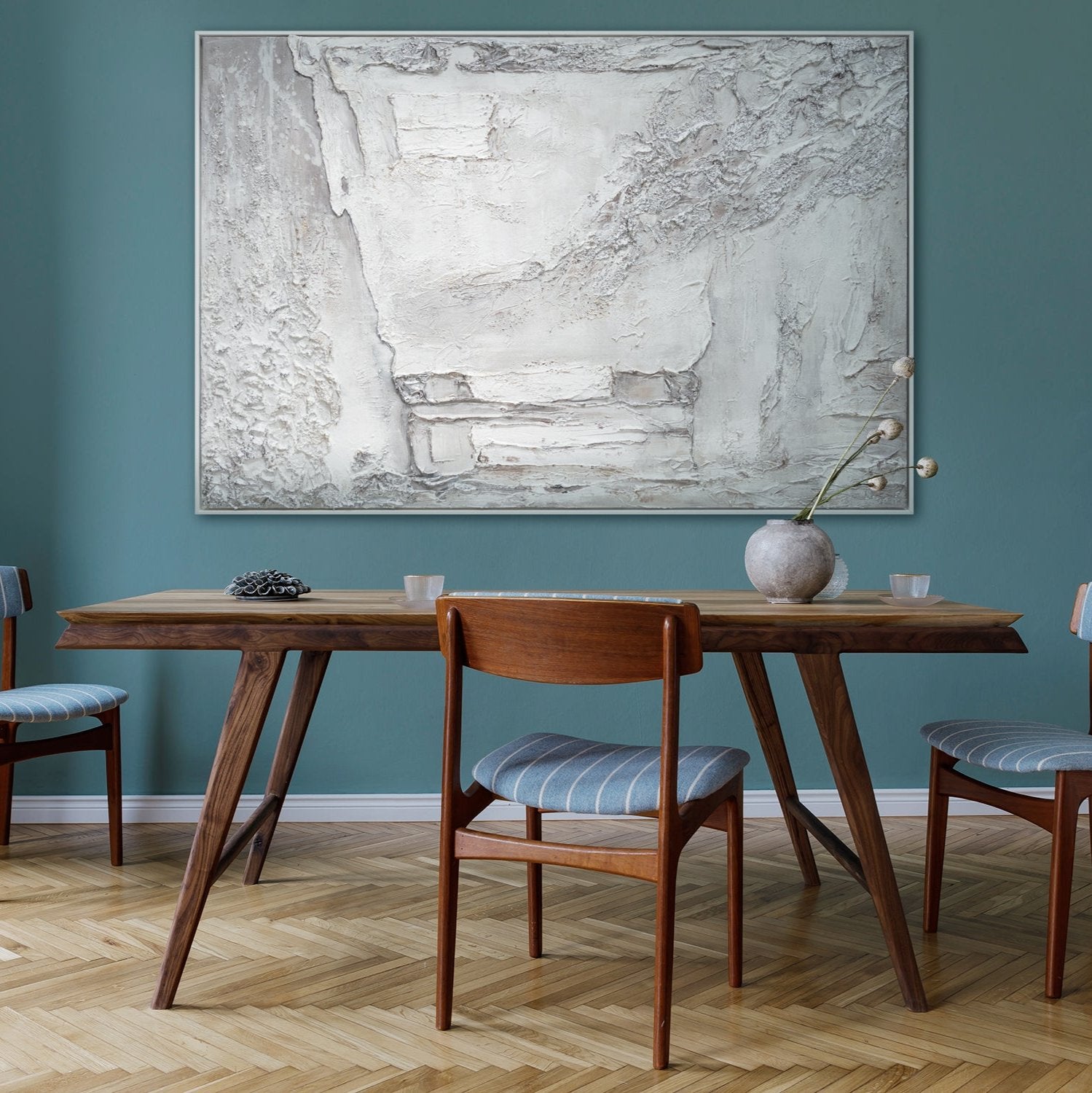 Perfekt für minimalistische Inneneinrichtungen, strahlt das Gemälde Ruhe und zeitlose Eleganz aus.