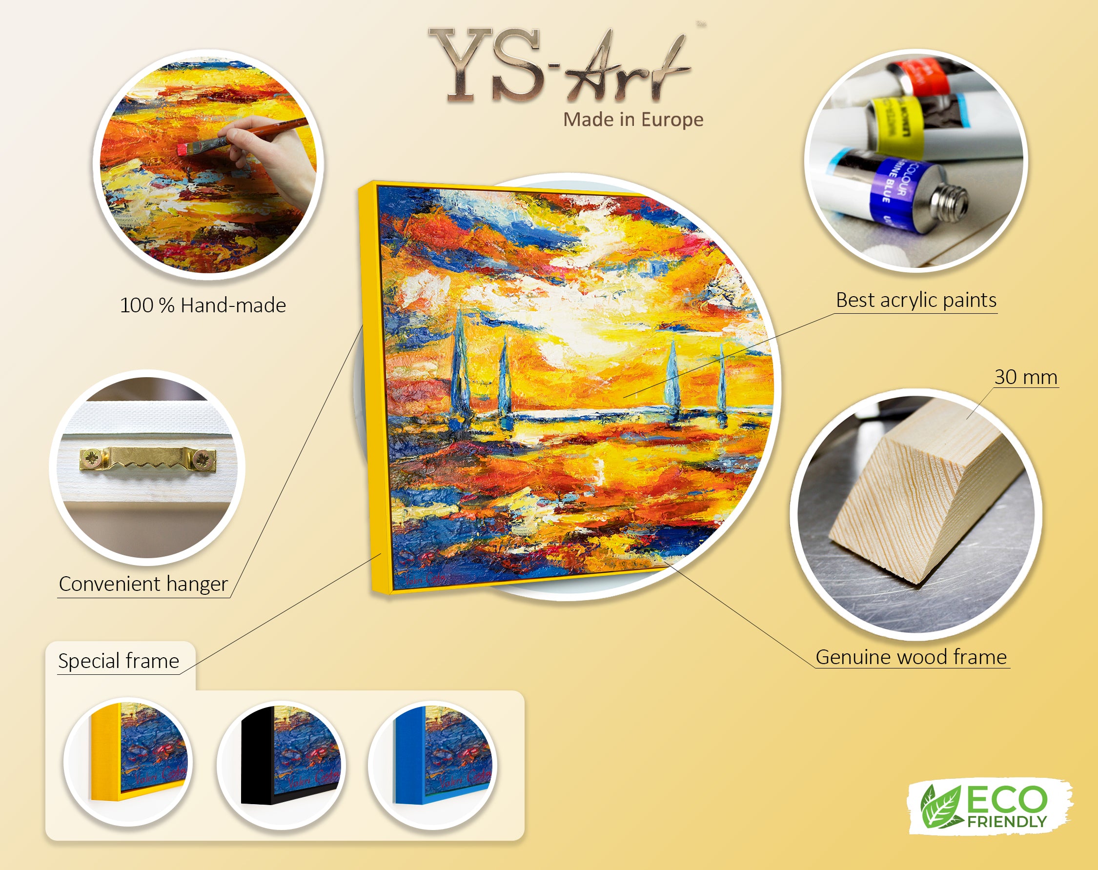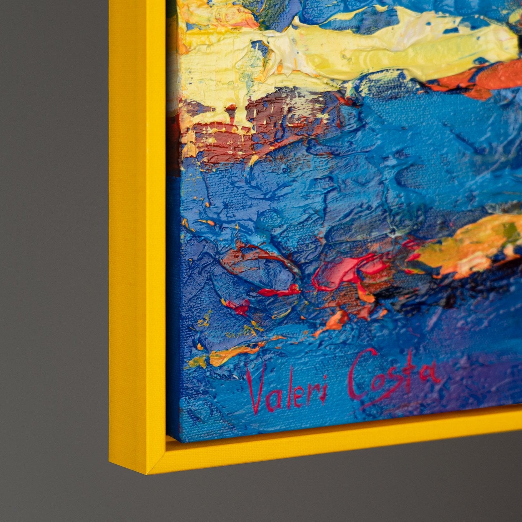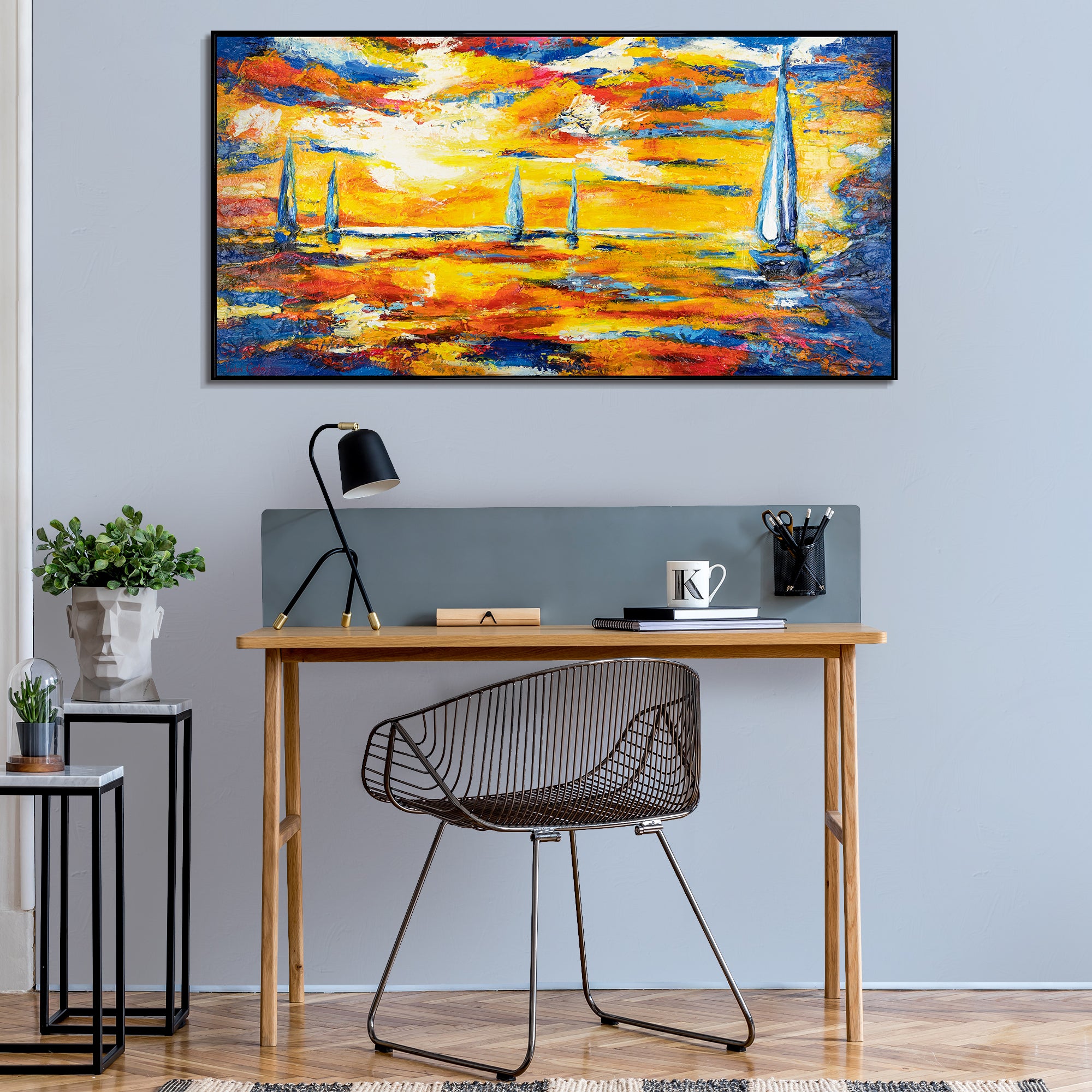 Ein kraftvolles und lebendiges Kunstwerk, das die Magie des Sonnenuntergangs am Meer einfängt. Die leuchtenden Gelb-, Orange- und Blautöne harmonieren perfekt miteinander und schaffen eine Atmosphäre voller Wärme und Energie. Diese handgemalte Acrylmalerei ist ideal, um Ihrem Wohnraum Farbe und Leben zu verleihen.