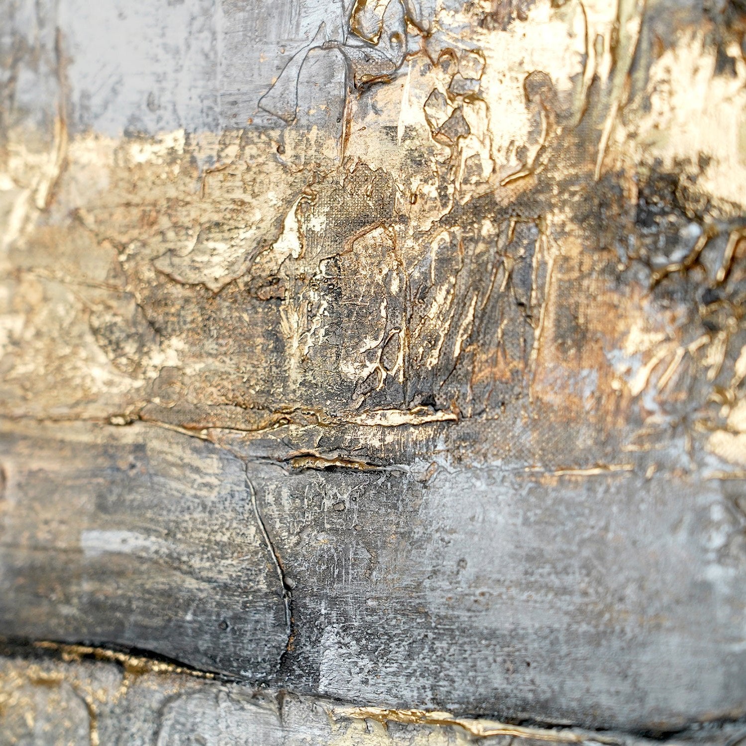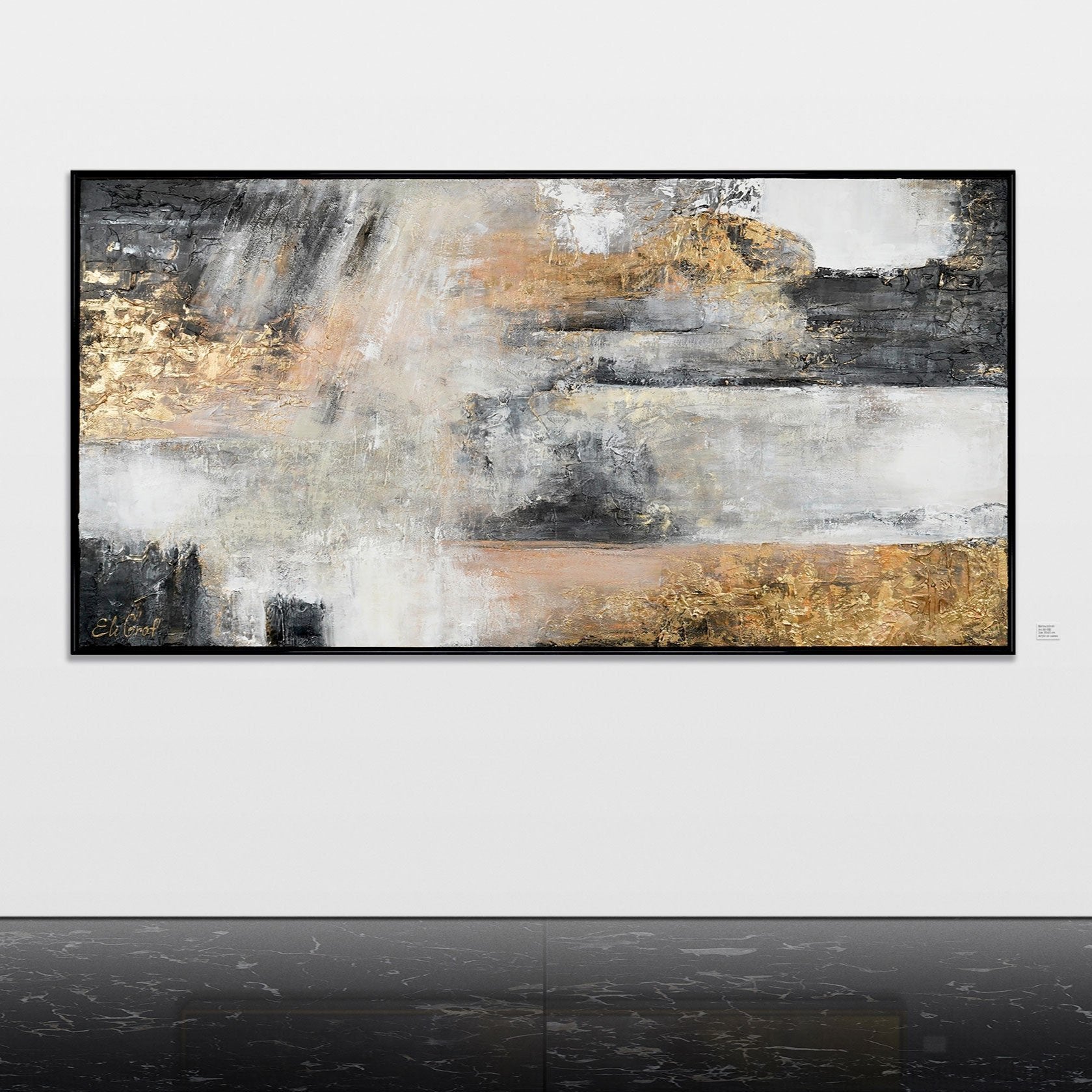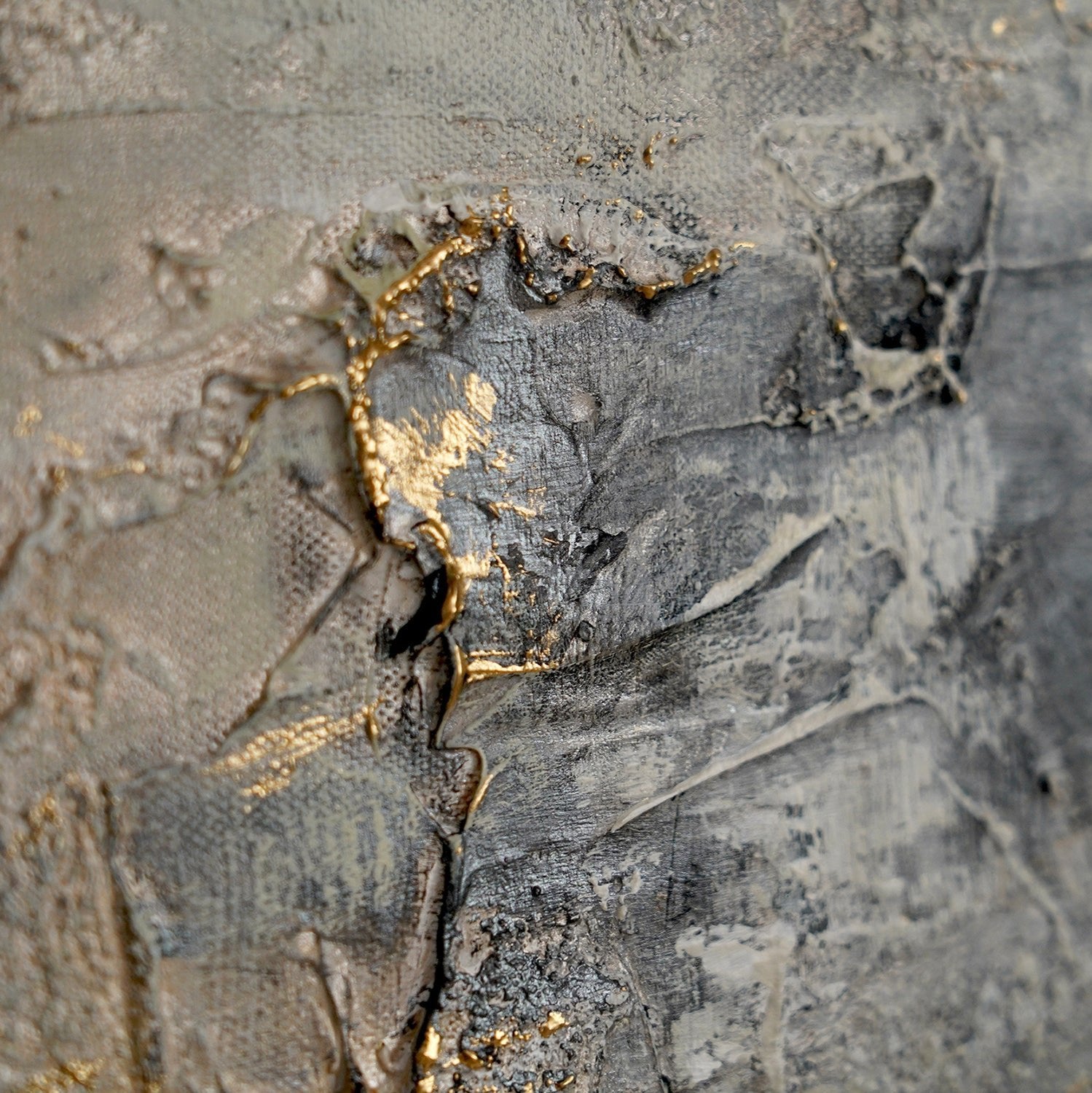 Dieses abstrakte Gemälde beeindruckt durch seine elegante Mischung aus dezenten Farben und auffälligen goldenen Akzenten. Mit Schichten von Textur und Tiefe schafft dieses handgemalte Kunstwerk eine faszinierende Wirkung an jeder Wand.