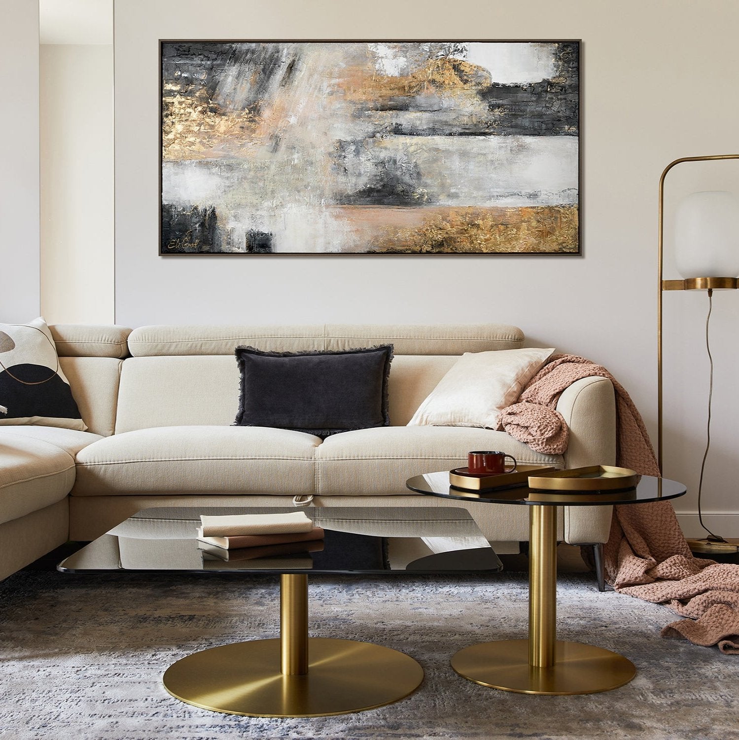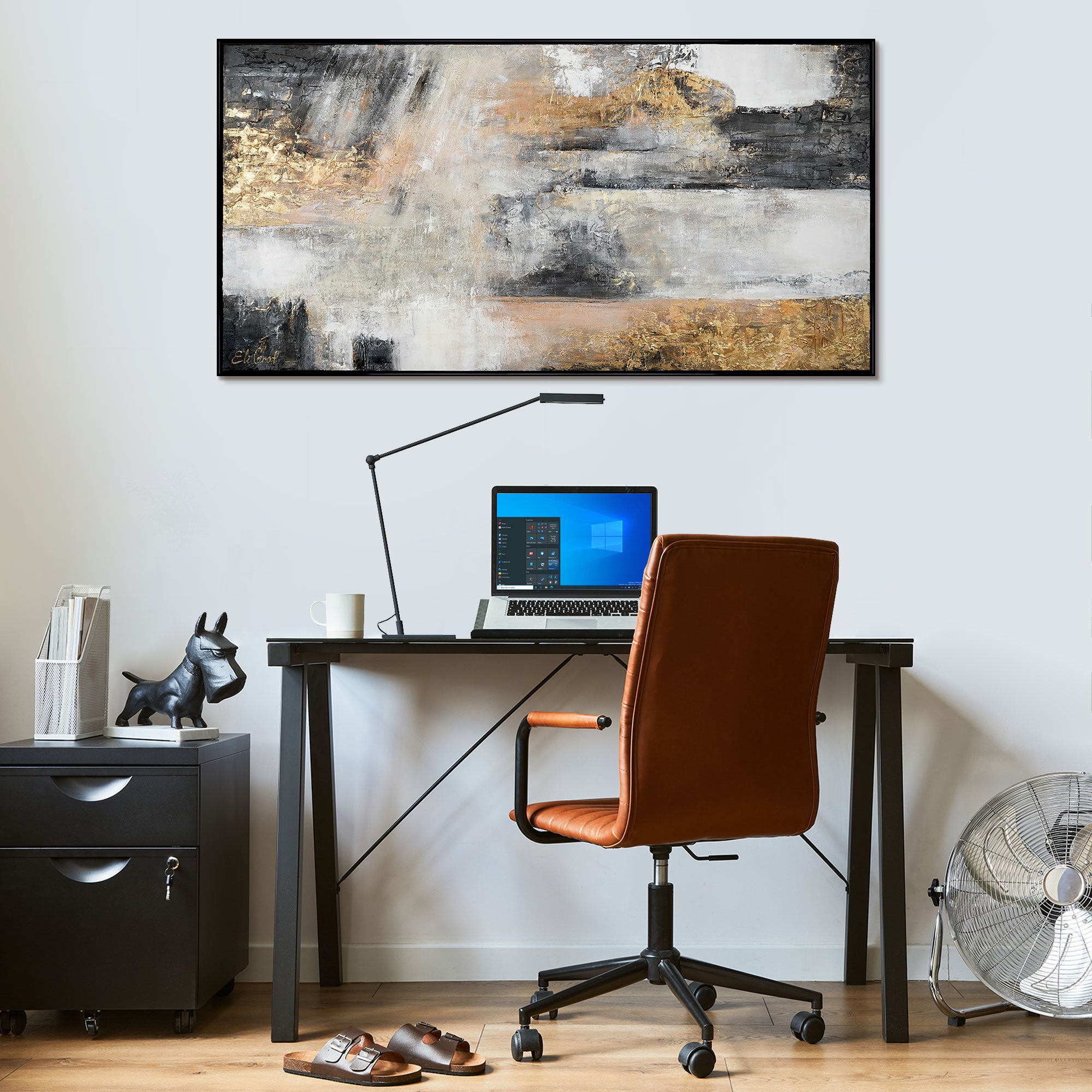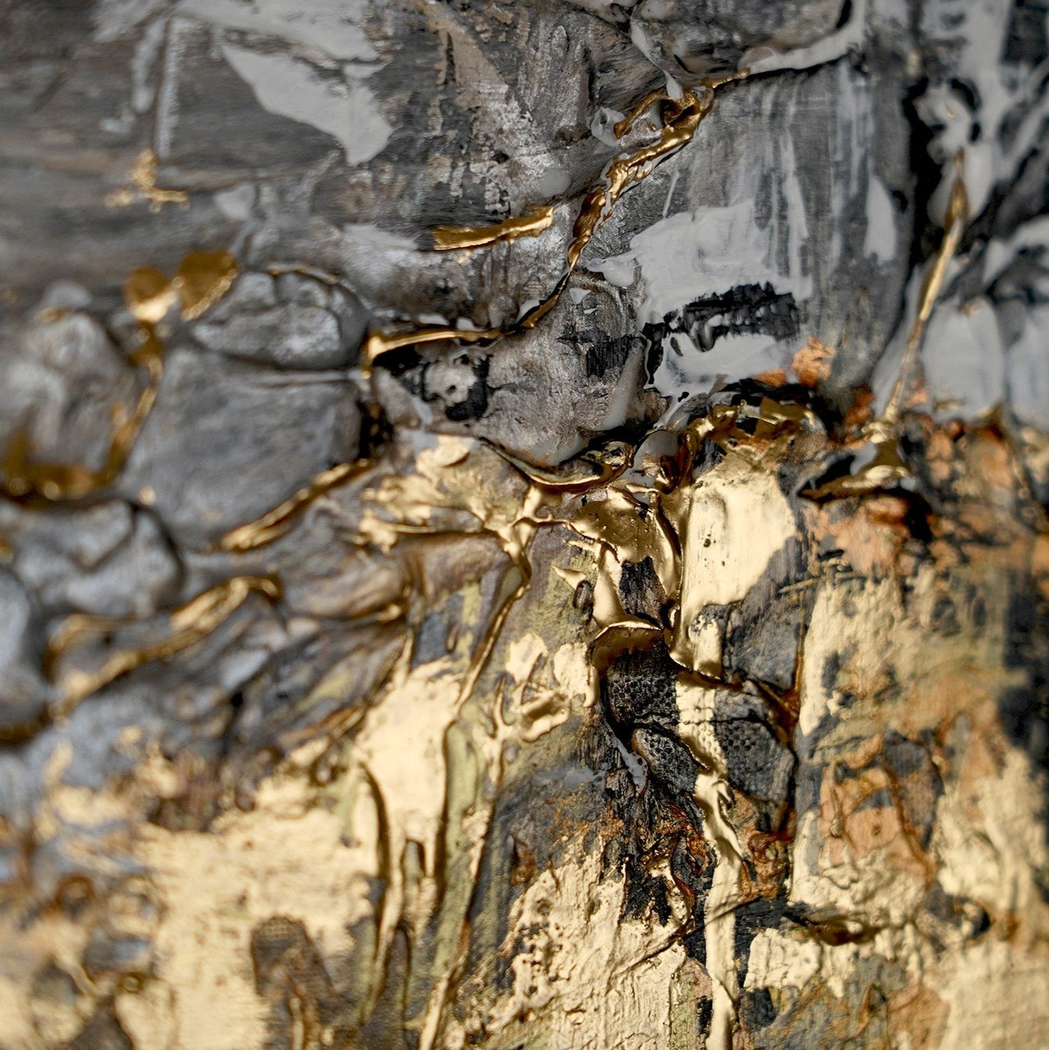 Dieses abstrakte Gemälde beeindruckt durch seine elegante Mischung aus dezenten Farben und auffälligen goldenen Akzenten. Mit Schichten von Textur und Tiefe schafft dieses handgemalte Kunstwerk eine faszinierende Wirkung an jeder Wand.