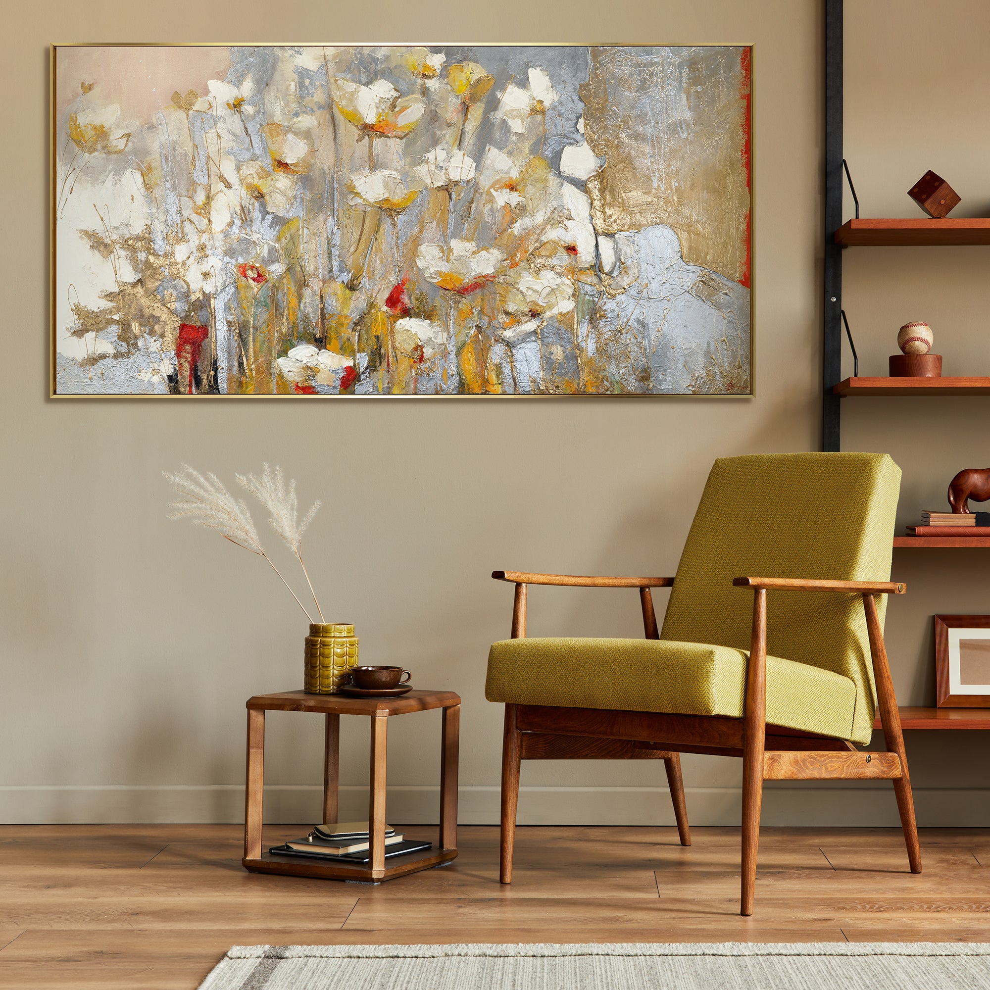 Dieses einzigartige Acrylgemälde fängt die Schönheit eines blühenden Blumenfeldes in leuchtenden Farben und mit eleganten goldenen Akzenten ein. Die warmen Gelb- und Rot-Töne harmonieren perfekt mit den strukturierten Blumen und verleihen Ihrem Raum eine friedliche, künstlerische Atmosphäre.