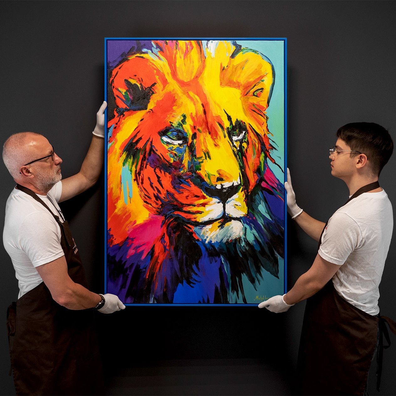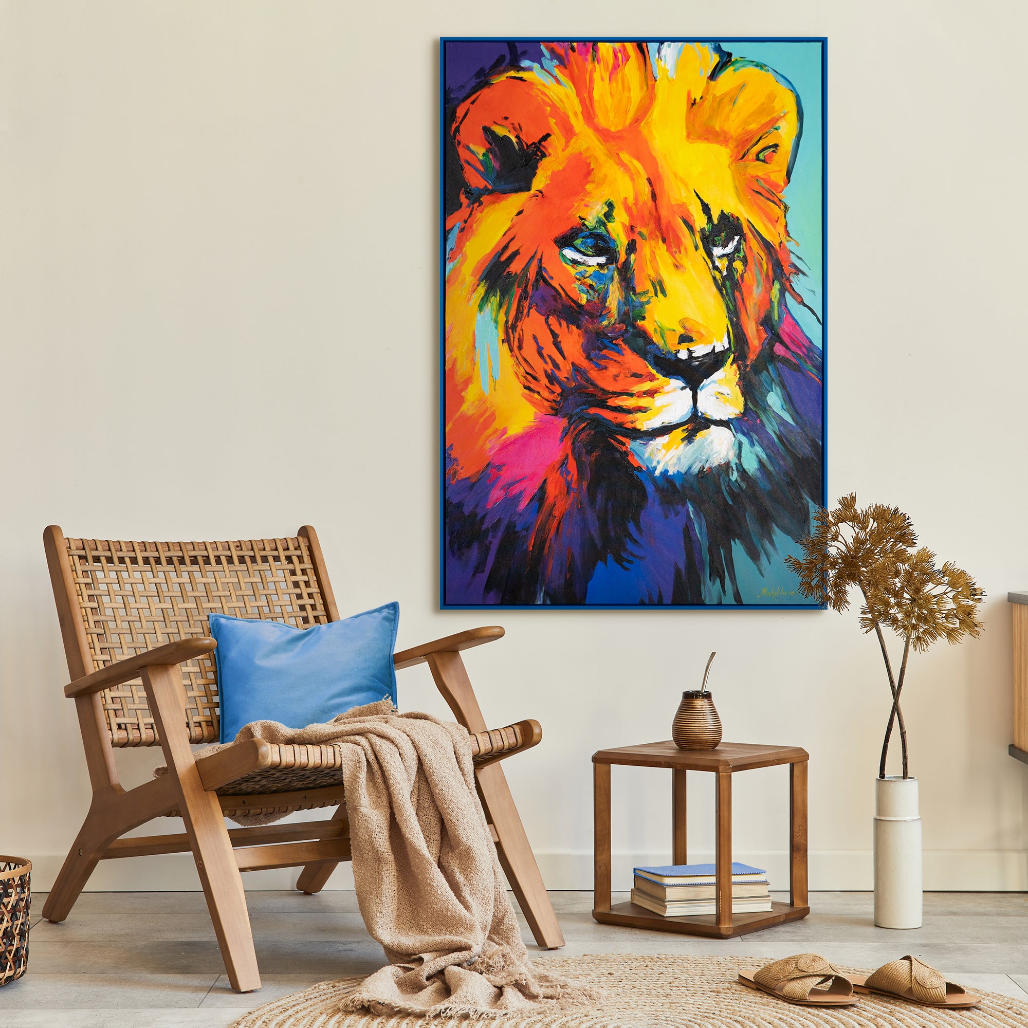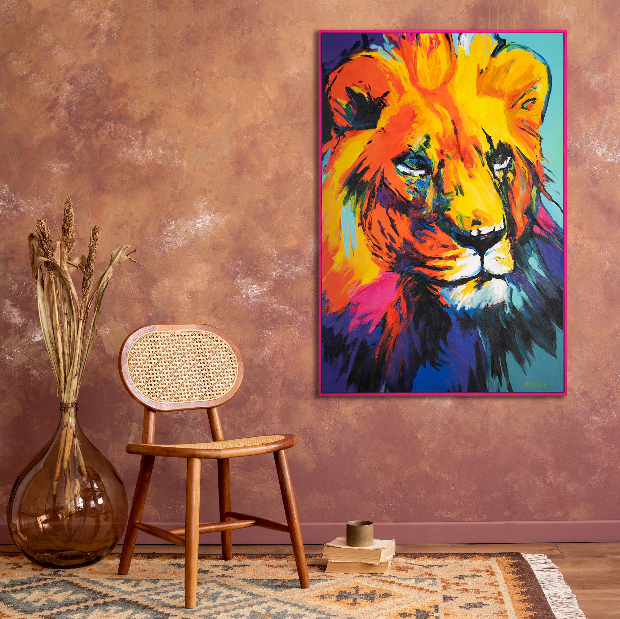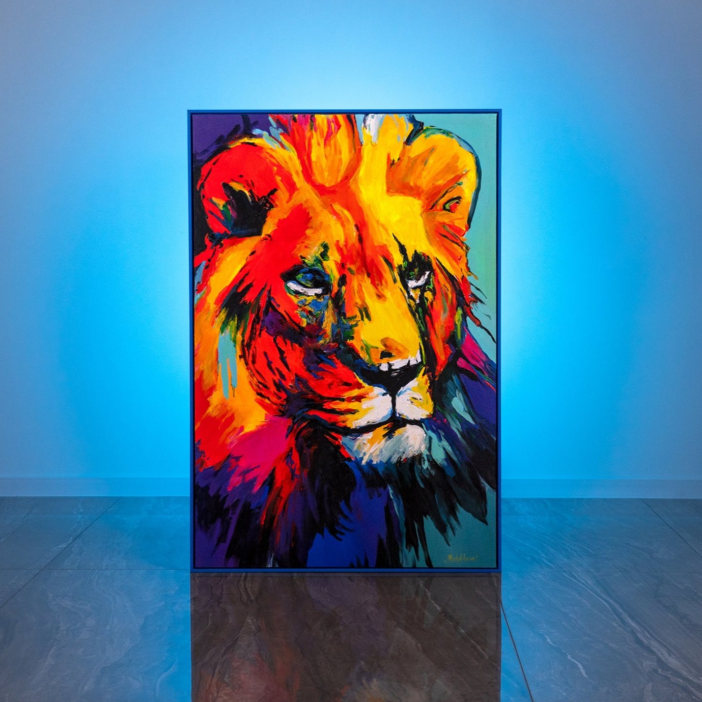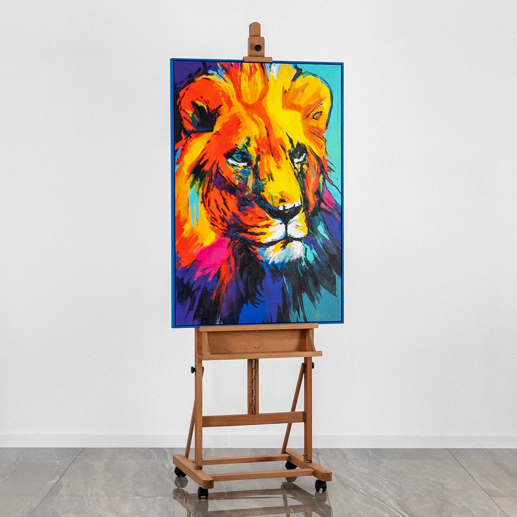 Entdecken Sie die majestätische Schönheit des Löwen, eingefangen in einem Meer aus lebendigen Farben in unserem Gemälde 'Farbenpracht des Königs'.
