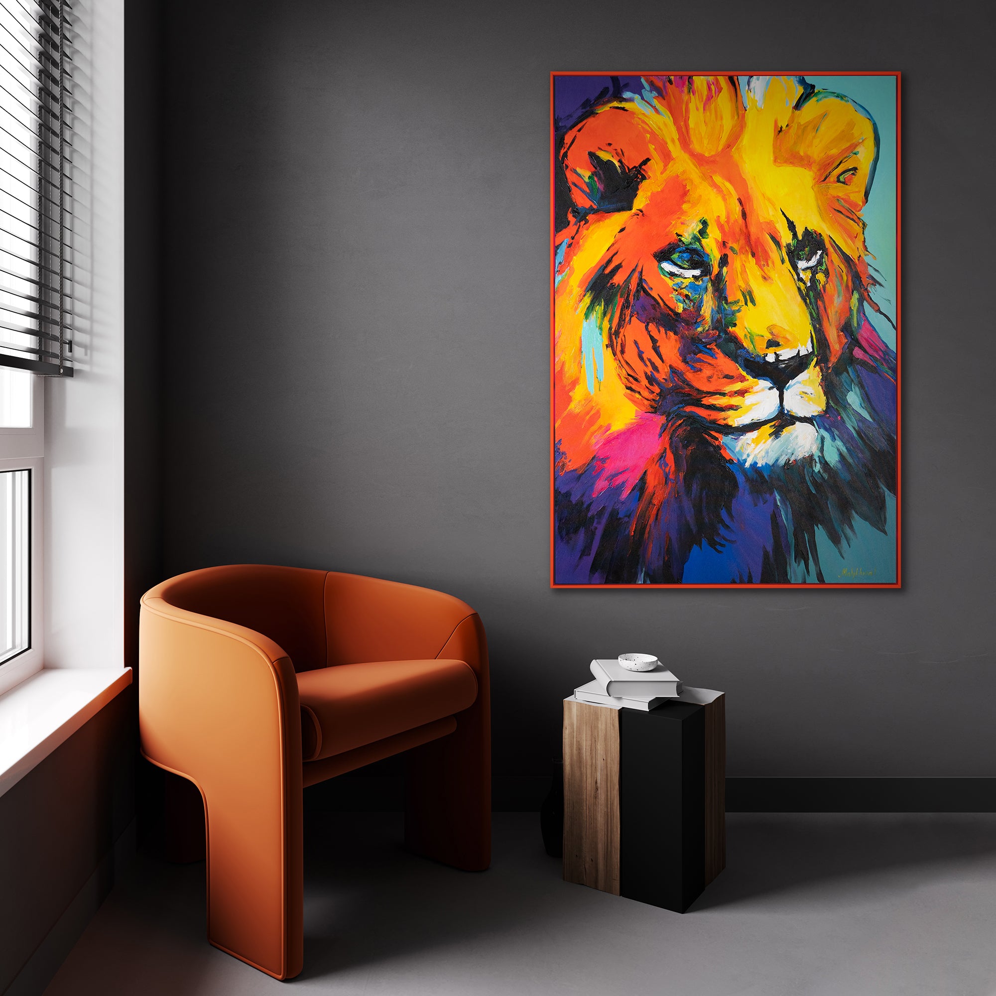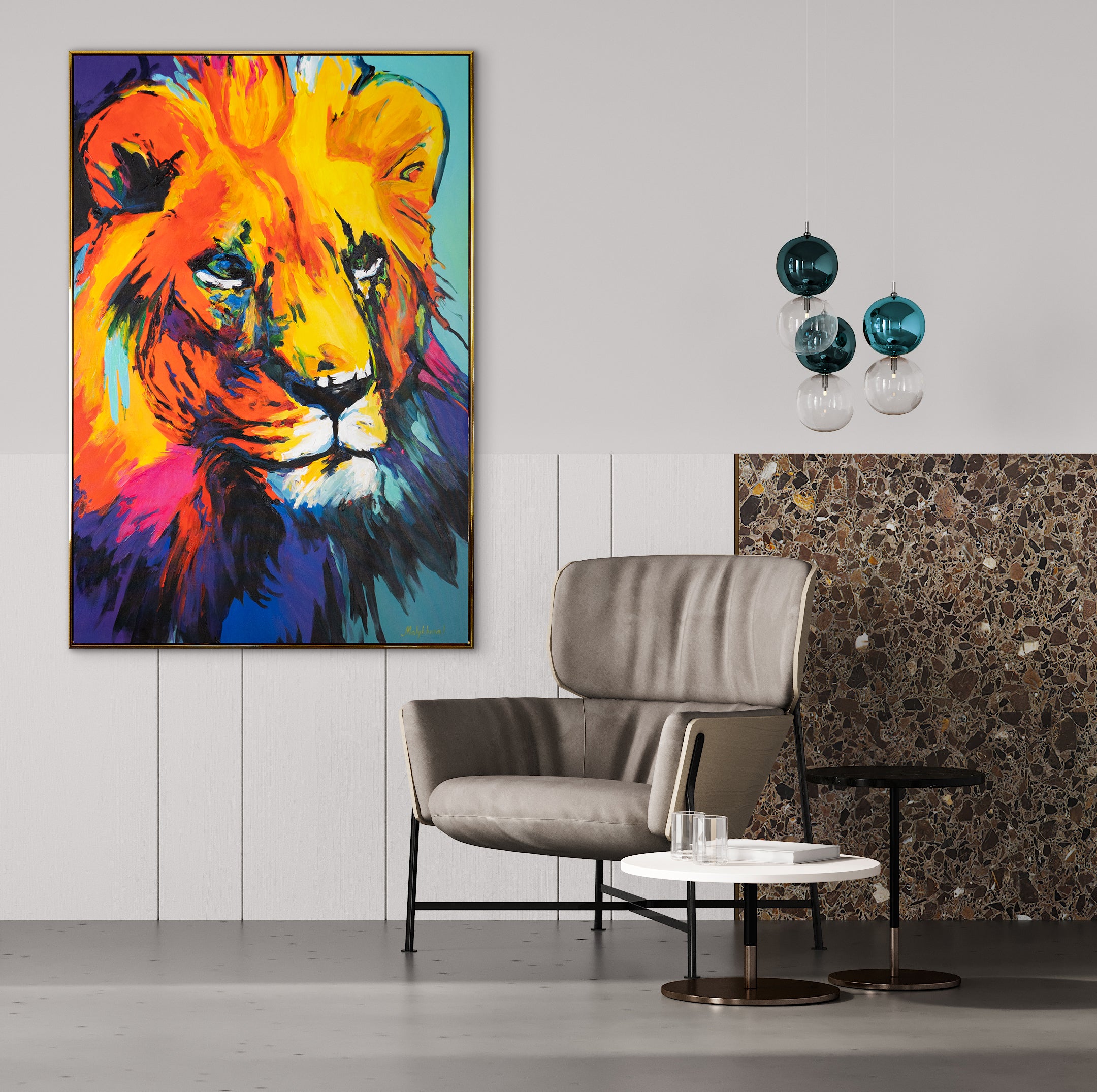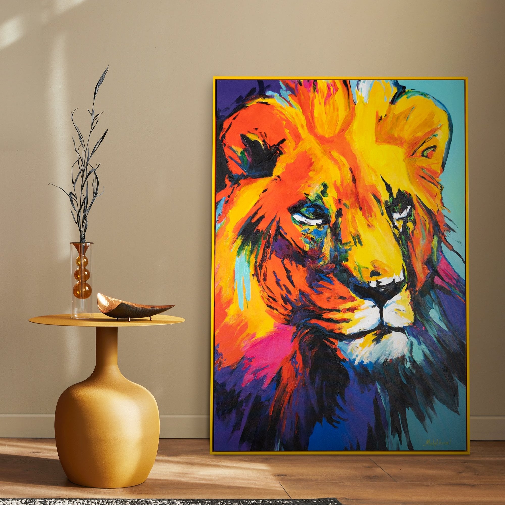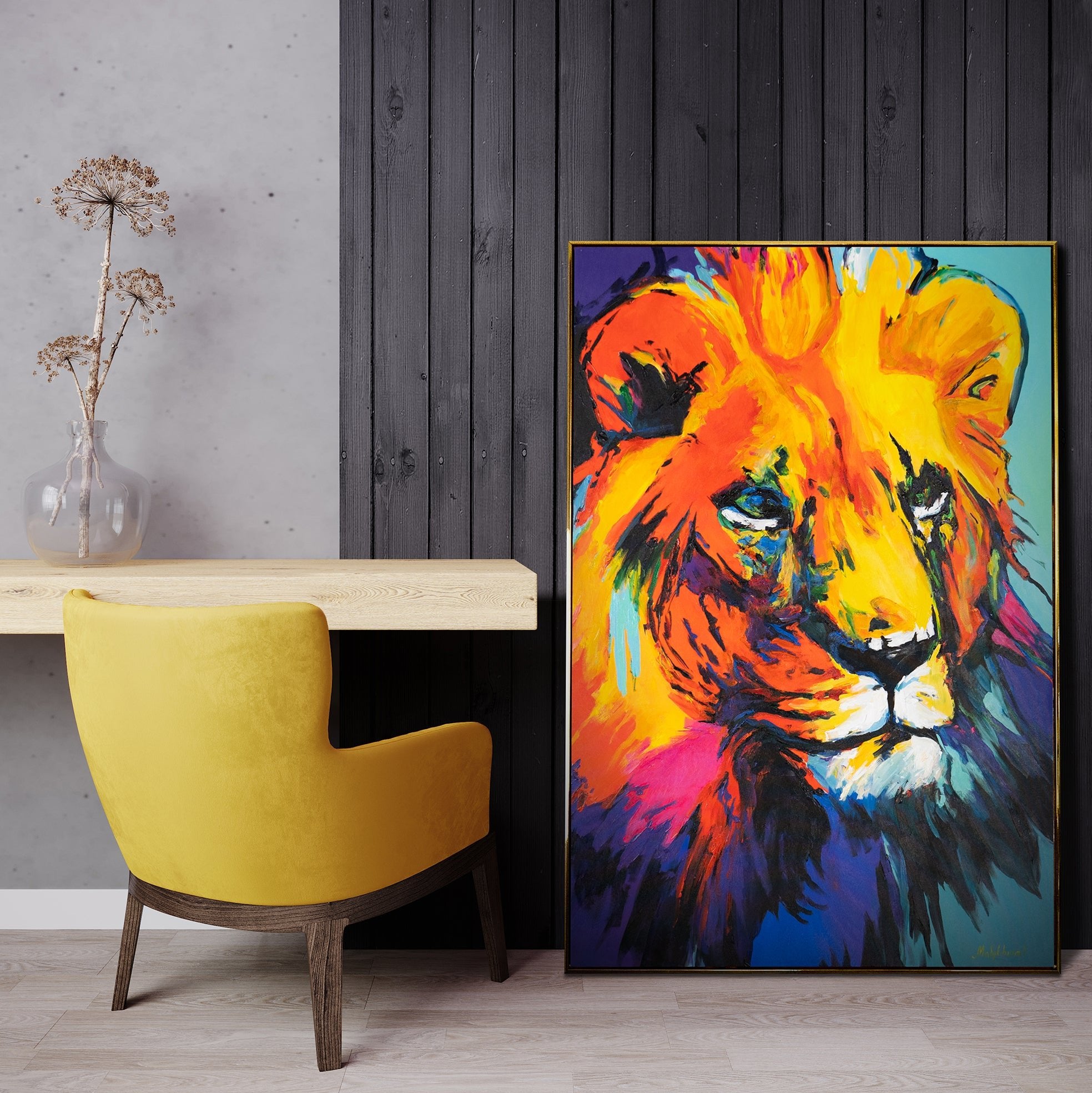 Dieses moderne Kunstwerk in Acryl bringt Energie und Bewegung in jedes Interieur und zelebriert die kraftvolle Präsenz des Königs der Tiere.