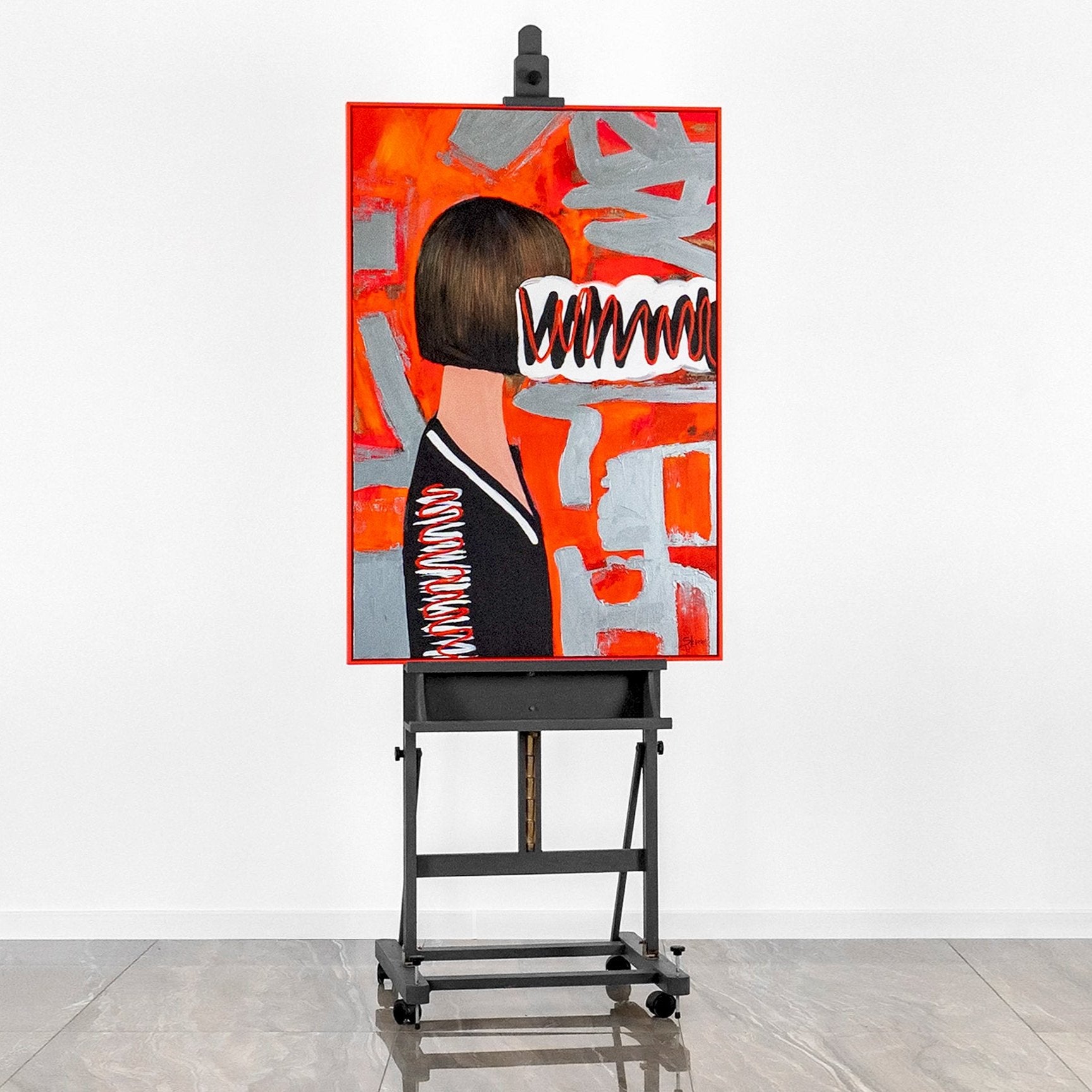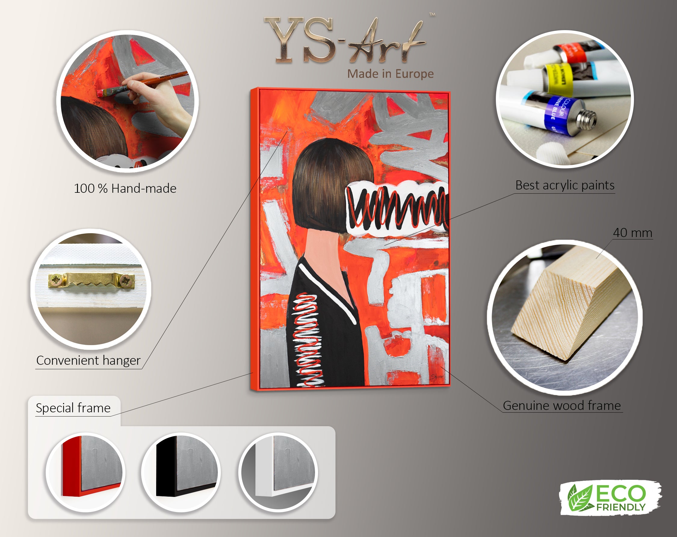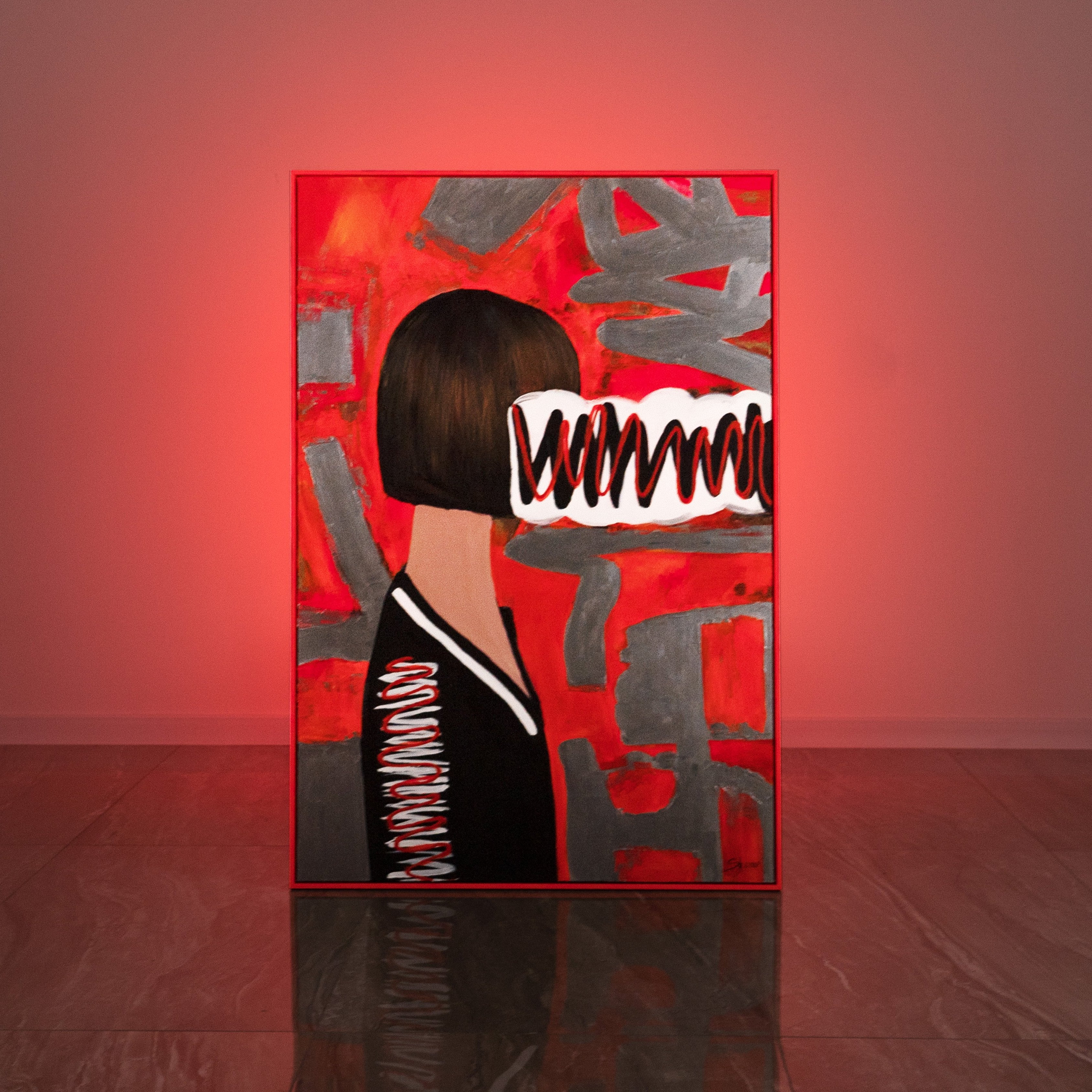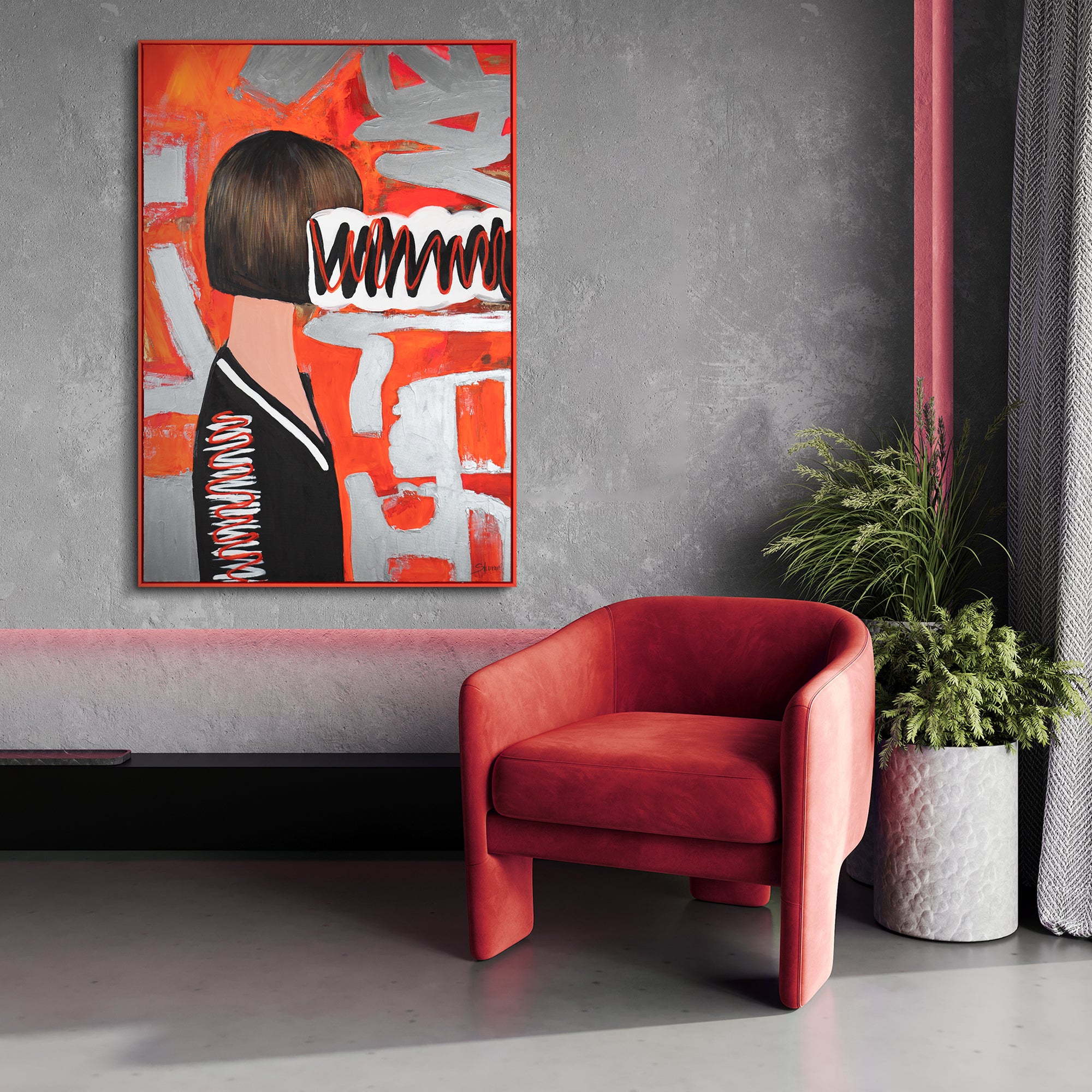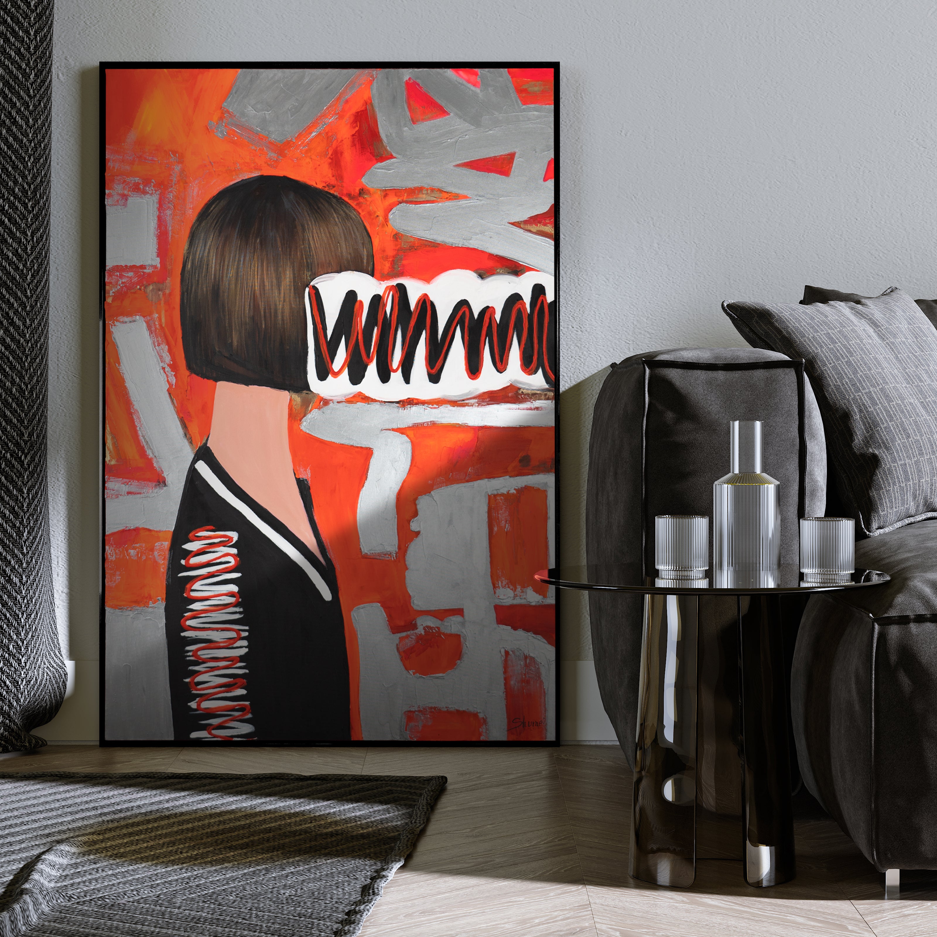 'Geheimnis in Rot' ist ein fesselndes, handgemaltes Kunstwerk, das eine moderne Interpretation der weiblichen Silhouette in einem Meer aus leuchtendem Rot bietet.