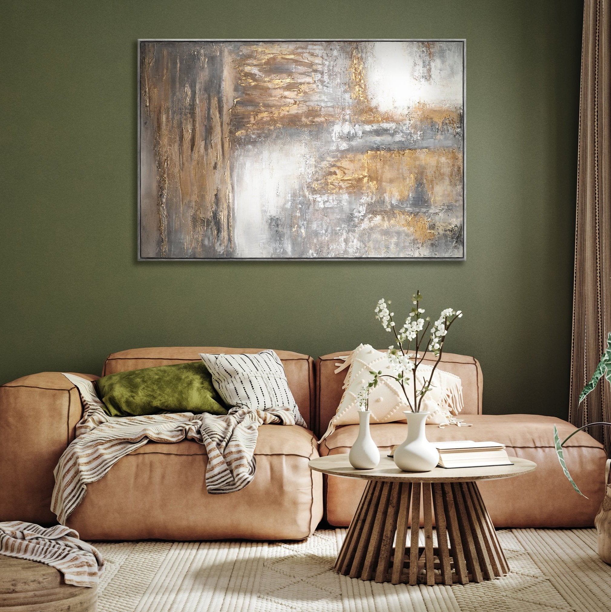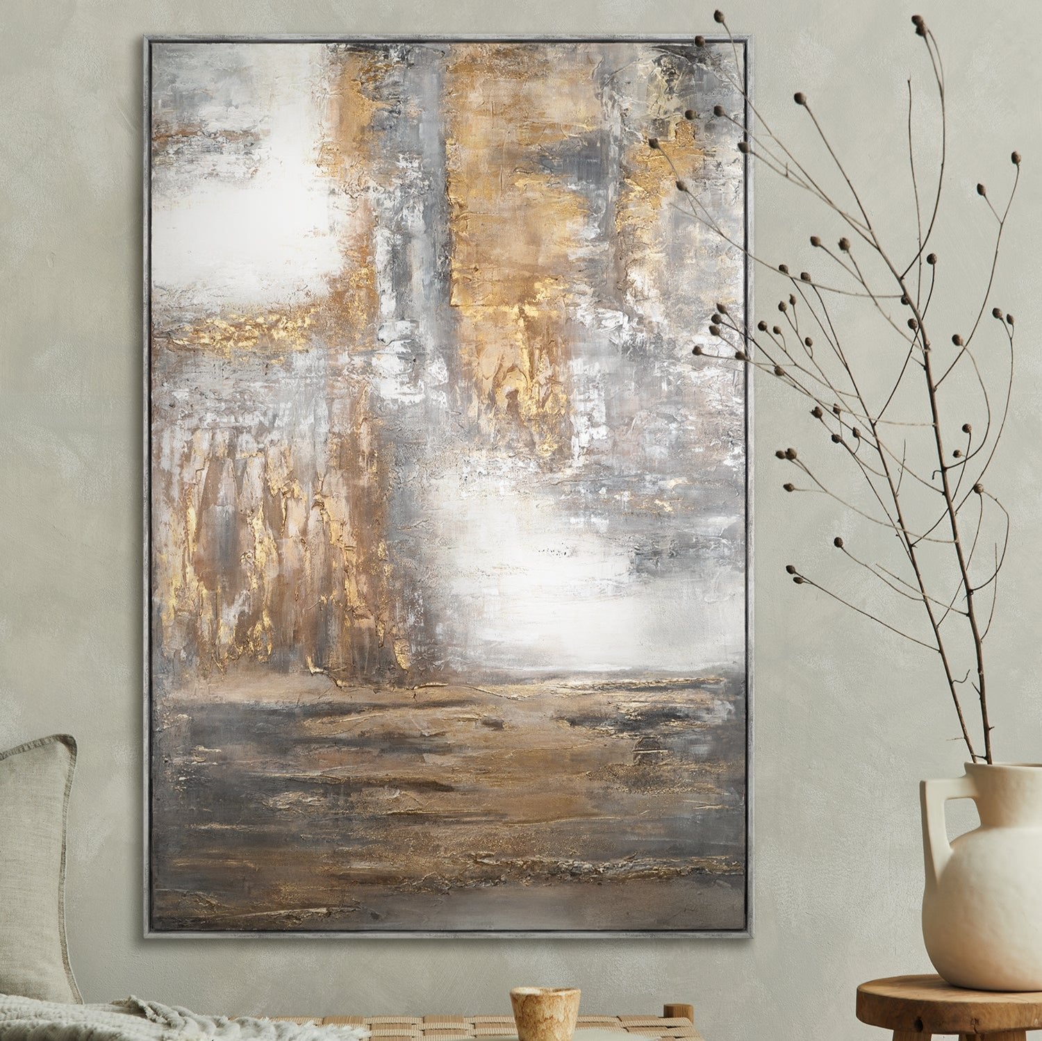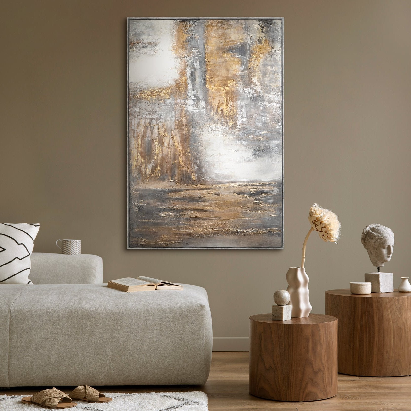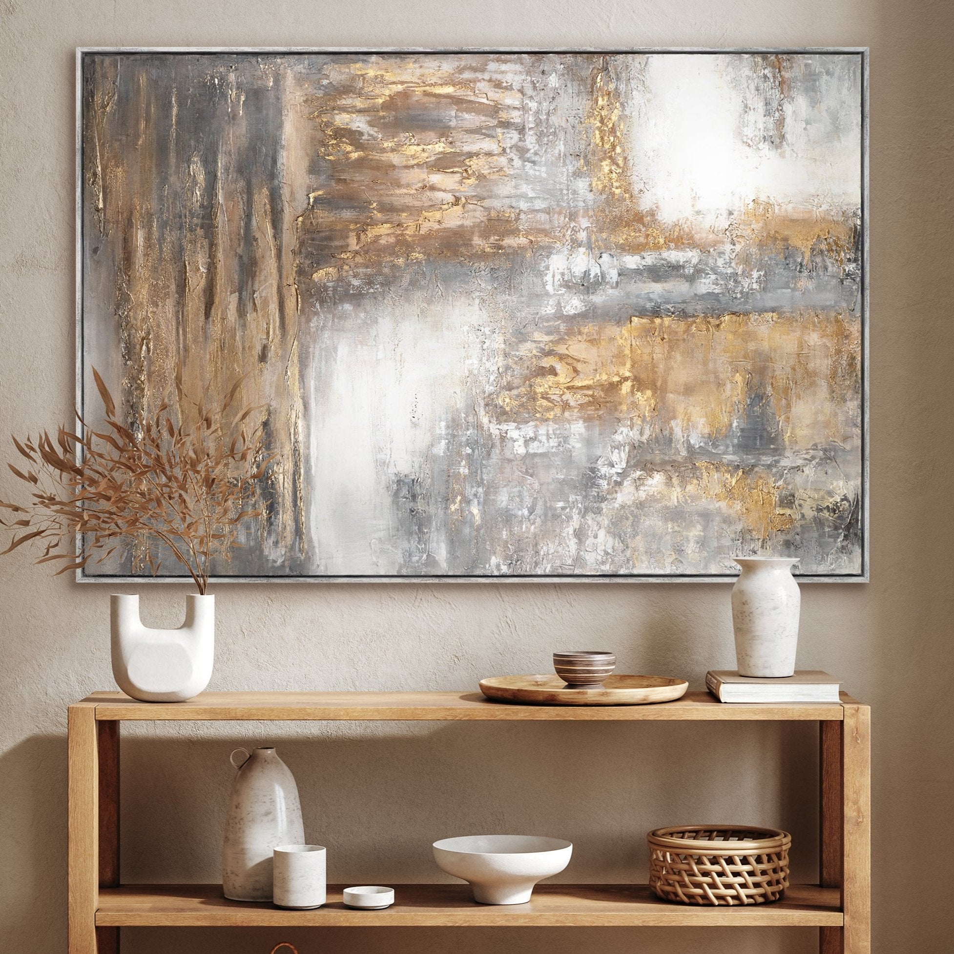 Das Zusammenspiel von Goldtönen und neutralen Farben schafft eine fesselnde visuelle Erfahrung, die sowohl inspirierend als auch beruhigend wirkt.