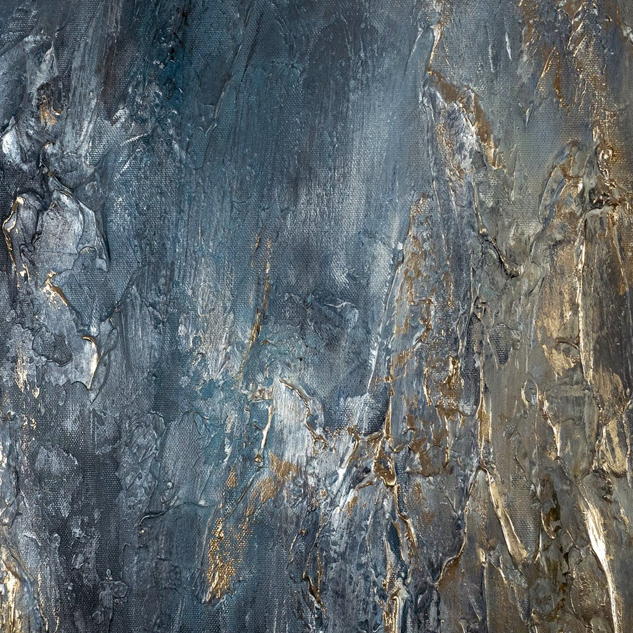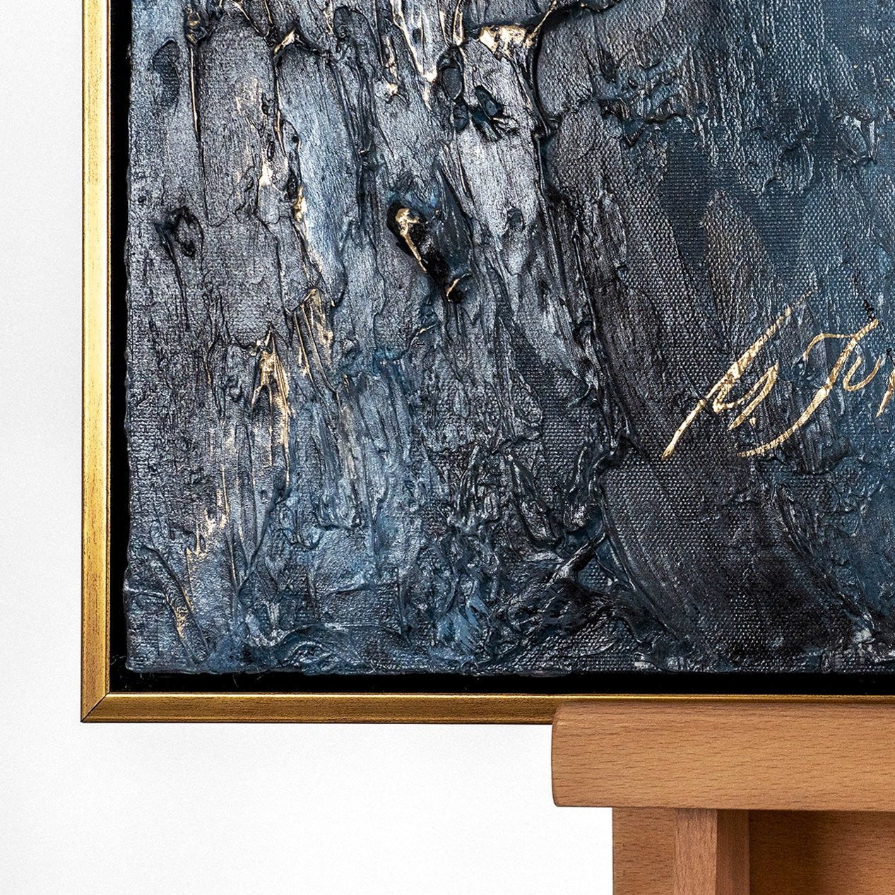 "Goldener Ozean" ist ein fesselndes Acrylgemälde, das die Tiefe und Unberechenbarkeit des Meeres mit einer einzigartigen Mischung aus tiefen Blautönen und leuchtenden Goldakzenten einfängt.