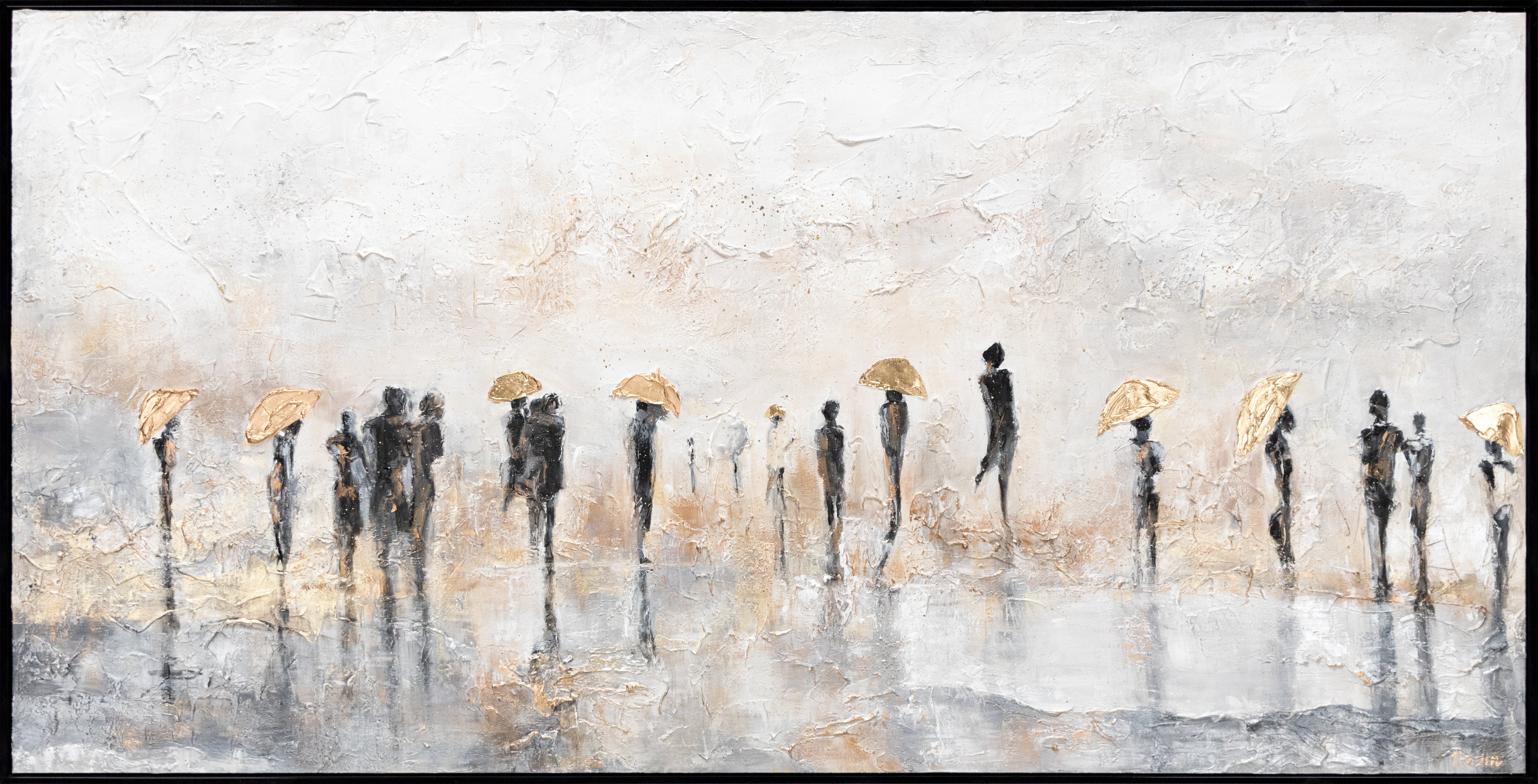 Dieses handgemalte Acrylbild auf Leinwand zeigt abstrakte Silhouetten von Menschen, die in einer ruhigen und gedämpften Farbpalette dargestellt sind. Die goldenen Akzente der Regenschirme bringen einen faszinierenden Kontrast und verleihen dem Werk einen Hauch von Eleganz.