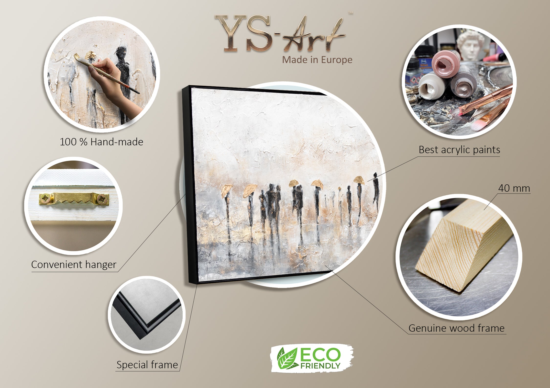 • Handgemalte Acrylmalerei mit Rahmen – Abstrakte Menschen mit goldenen Regenschirmen