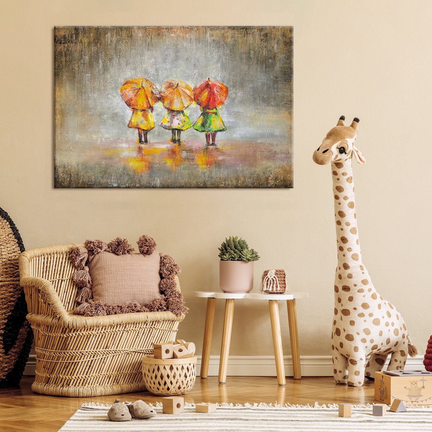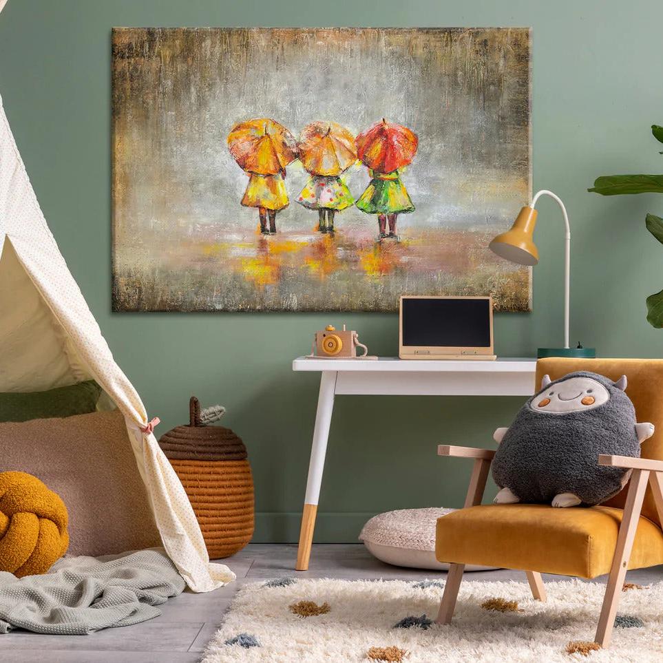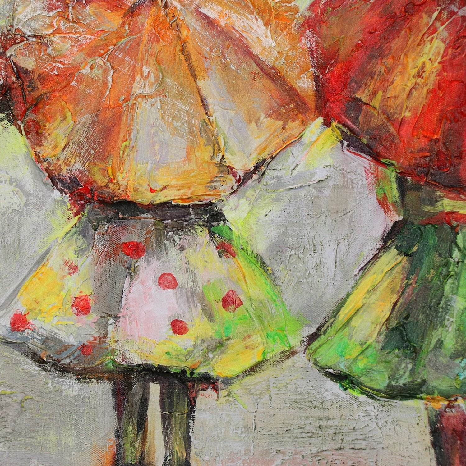 Dieses handgemalte Leinwandbild zeigt eine bezaubernde Szene mit drei Figuren, die unter bunten Regenschirmen in leuchtenden Farben stehen. Die abstrakte Darstellung und die lebendigen Farben bringen eine fröhliche und warme Atmosphäre in jeden Raum.