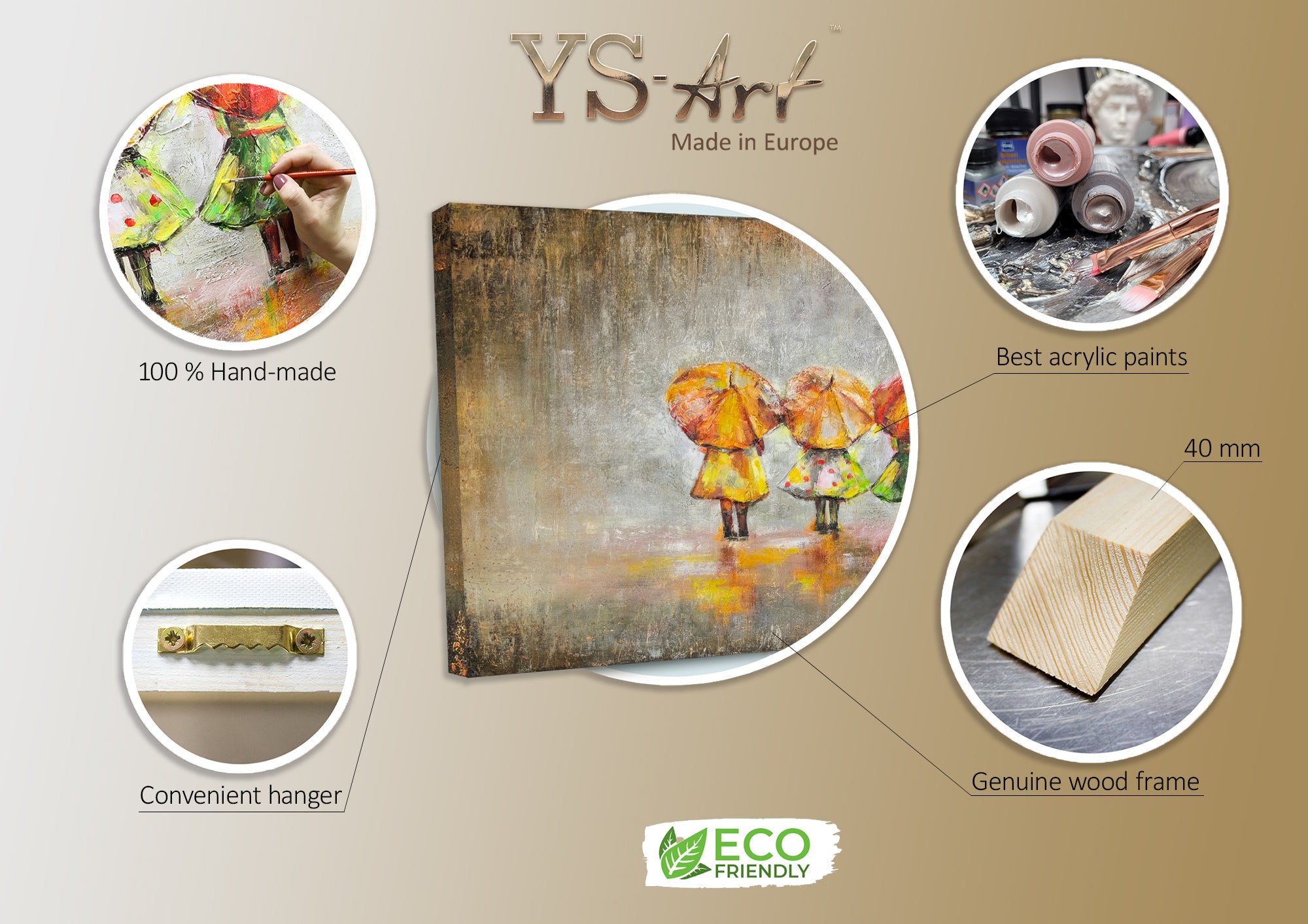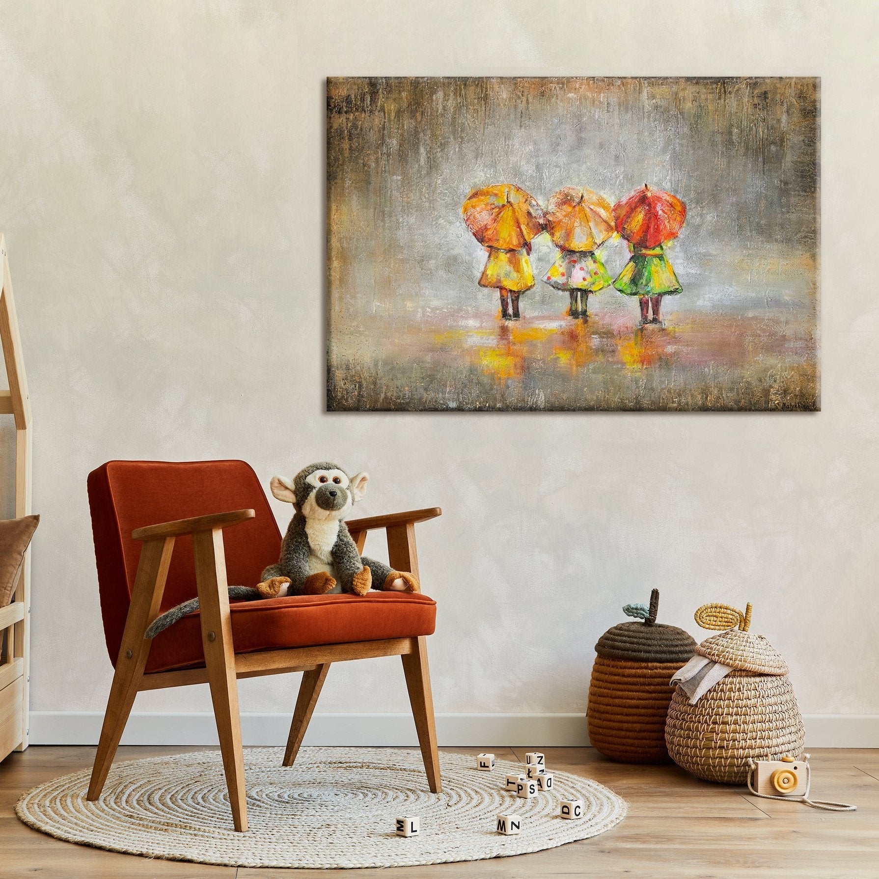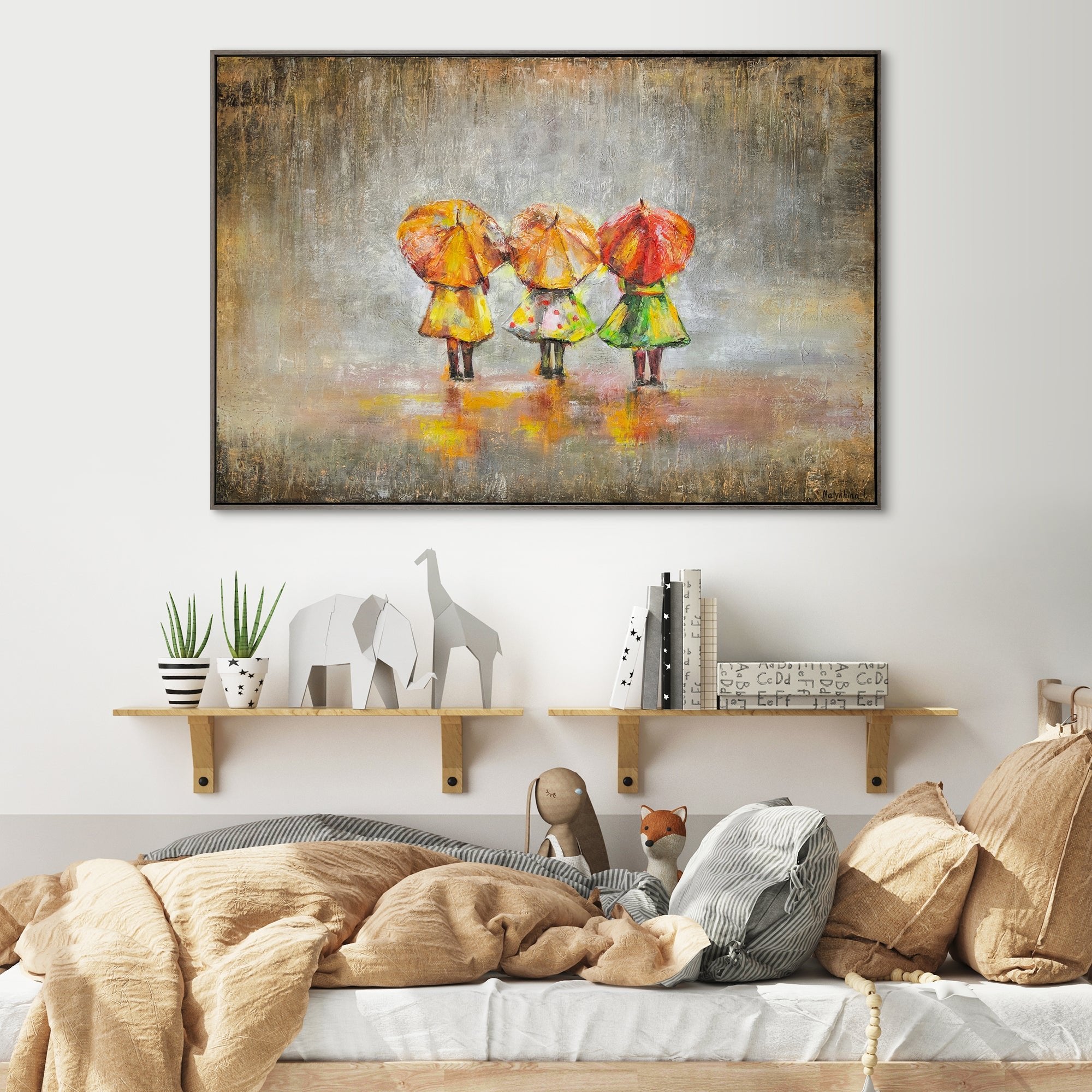 Dieses handgemalte Leinwandbild zeigt eine bezaubernde Szene mit drei Figuren, die unter bunten Regenschirmen in leuchtenden Farben stehen. Die abstrakte Darstellung und die lebendigen Farben bringen eine fröhliche und warme Atmosphäre in jeden Raum.