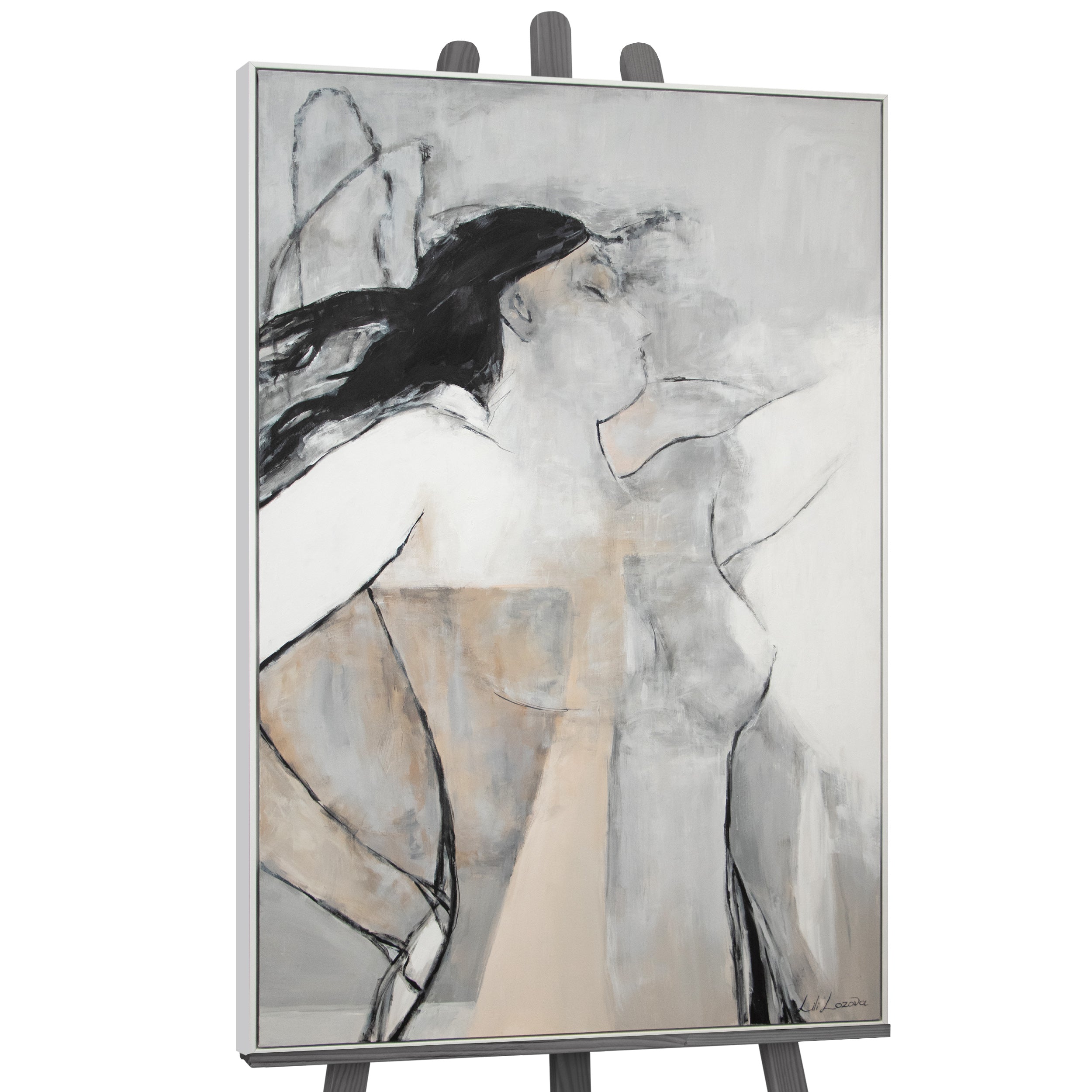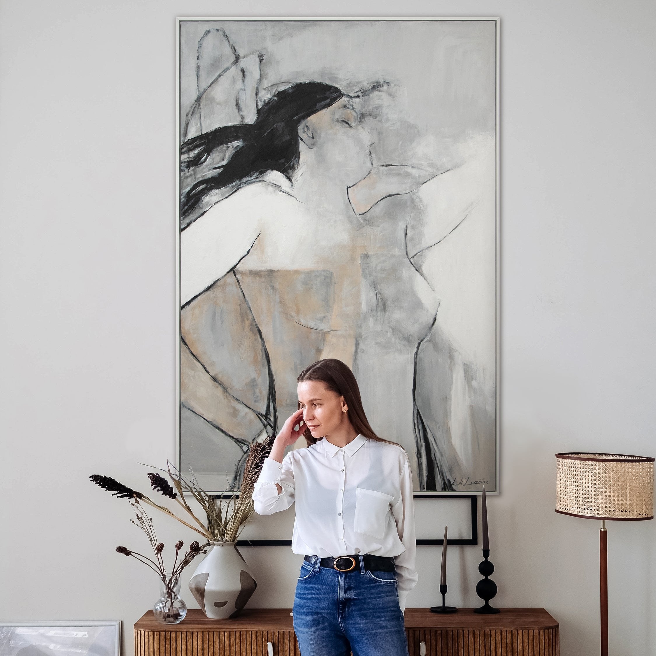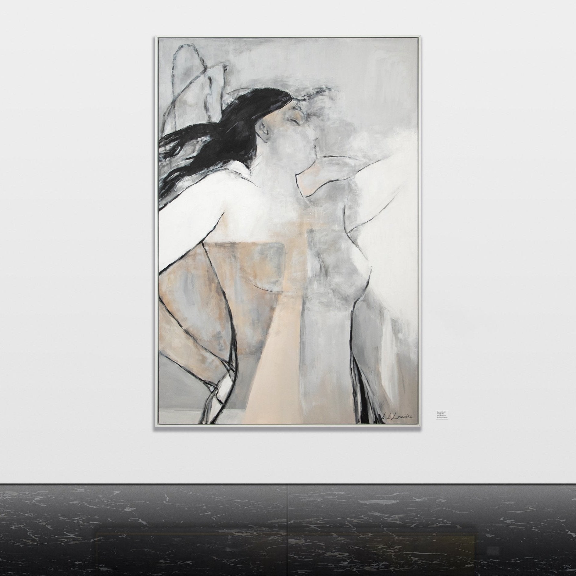 Dieses moderne, handgemalte Acrylbild auf Leinwand stellt eine stilisierte Figur in abstrahierter Form dar. Die weichen Pinselstriche und sanften Farbtöne fügen sich perfekt in jede moderne Wohnumgebung ein. Die dominanten Farben des Bildes sind Beige, Weiß und Schwarz, die eine ruhige und harmonische Atmosphäre schaffen.