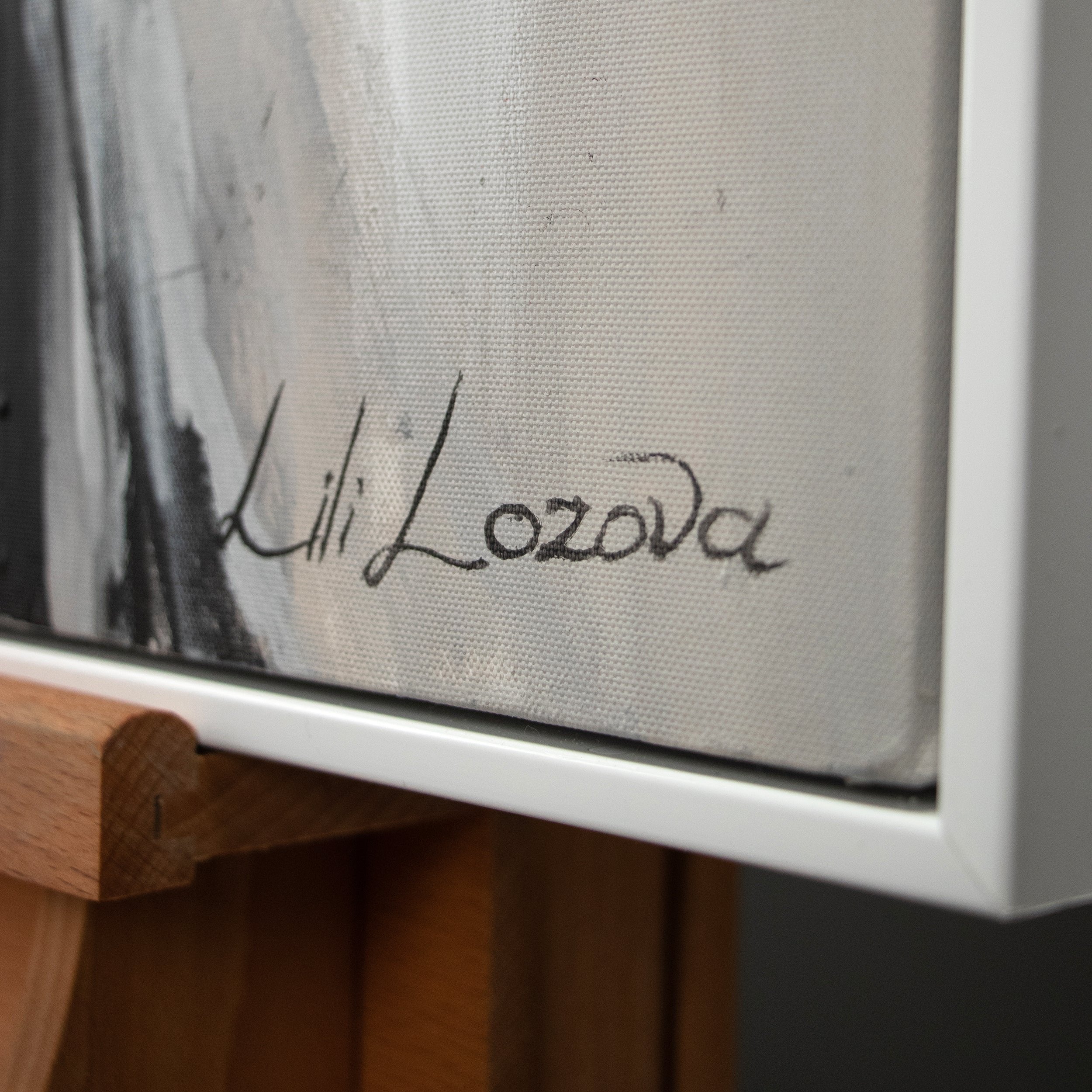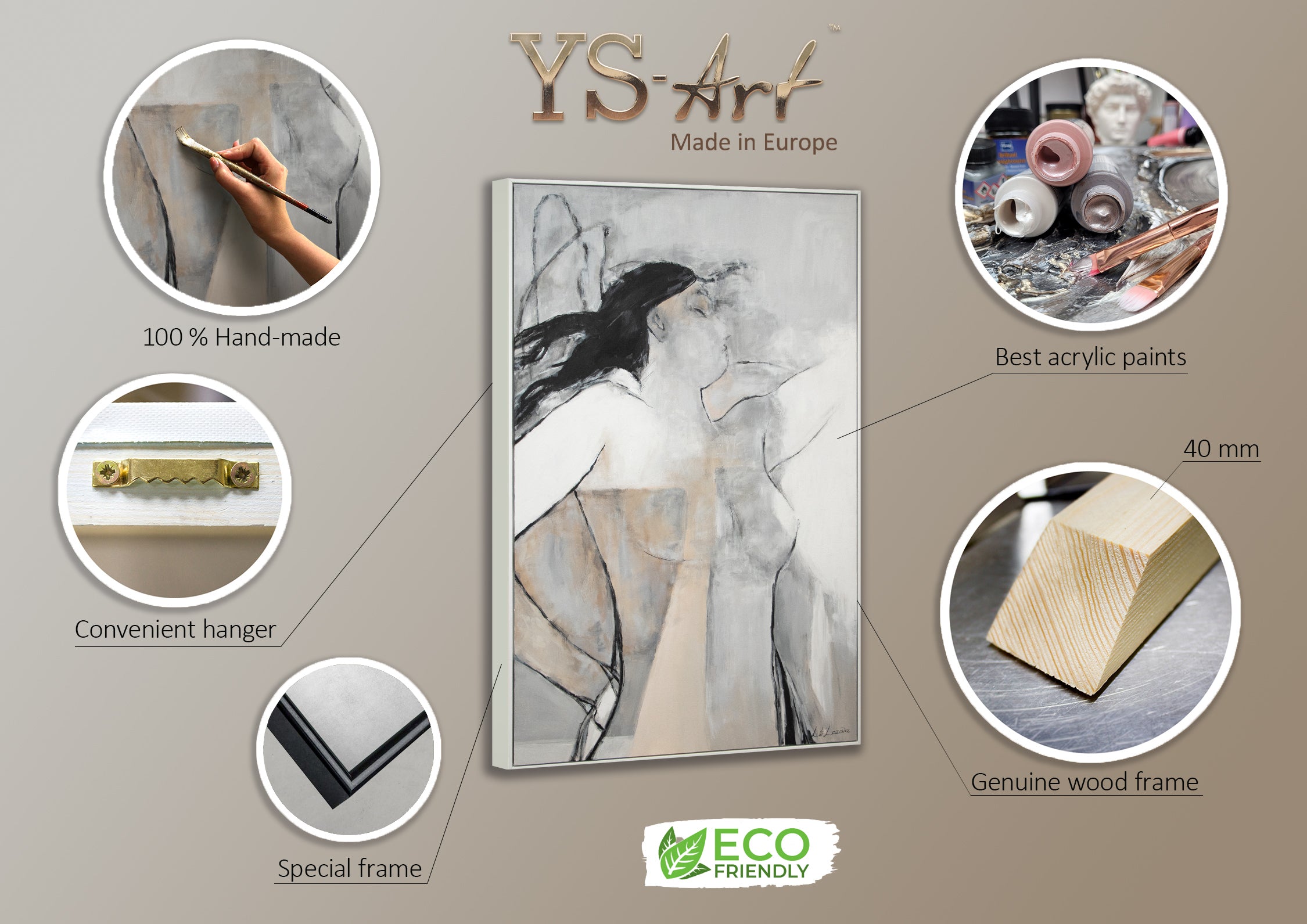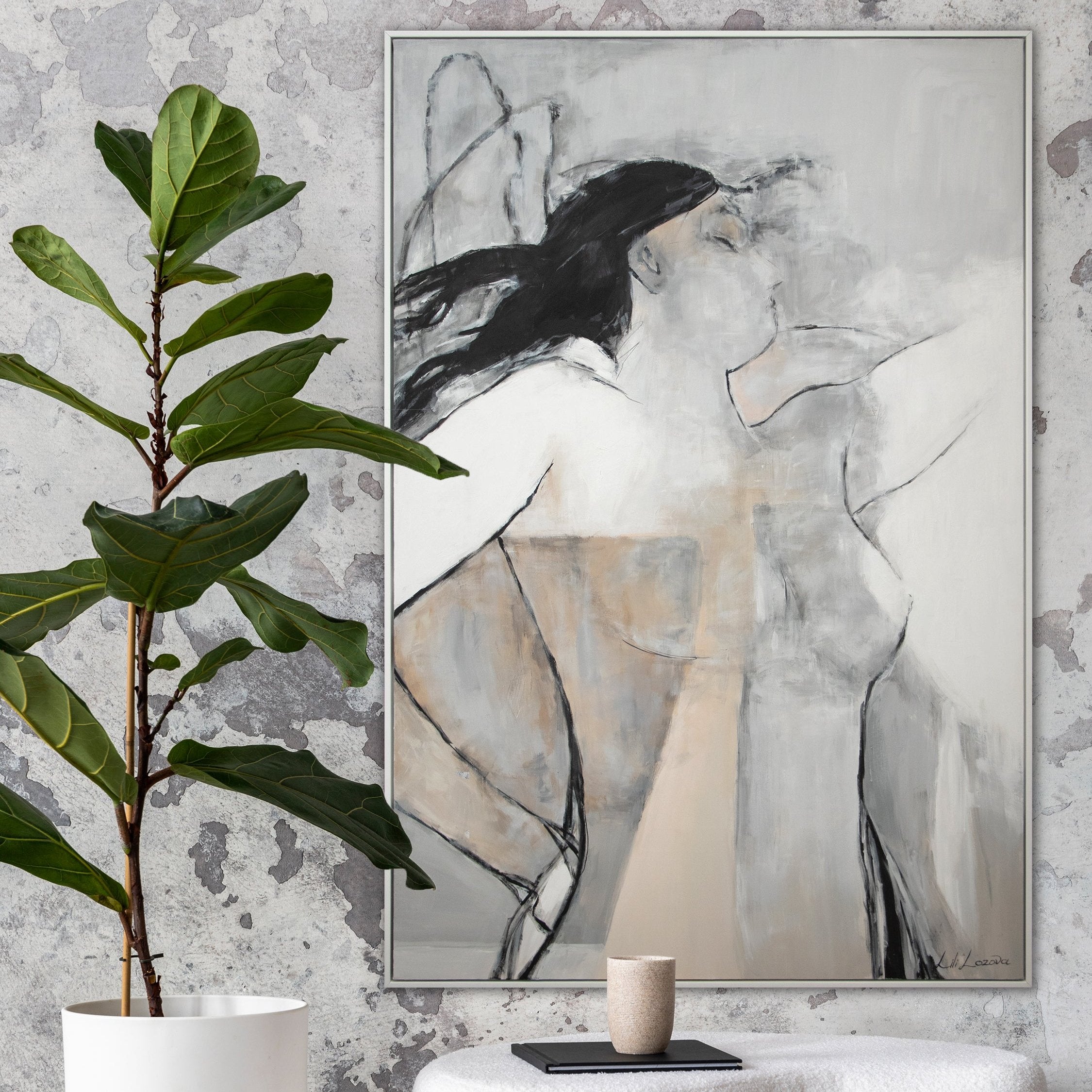 Dieses moderne, handgemalte Acrylbild auf Leinwand stellt eine stilisierte Figur in abstrahierter Form dar. Die weichen Pinselstriche und sanften Farbtöne fügen sich perfekt in jede moderne Wohnumgebung ein. Die dominanten Farben des Bildes sind Beige, Weiß und Schwarz, die eine ruhige und harmonische Atmosphäre schaffen.