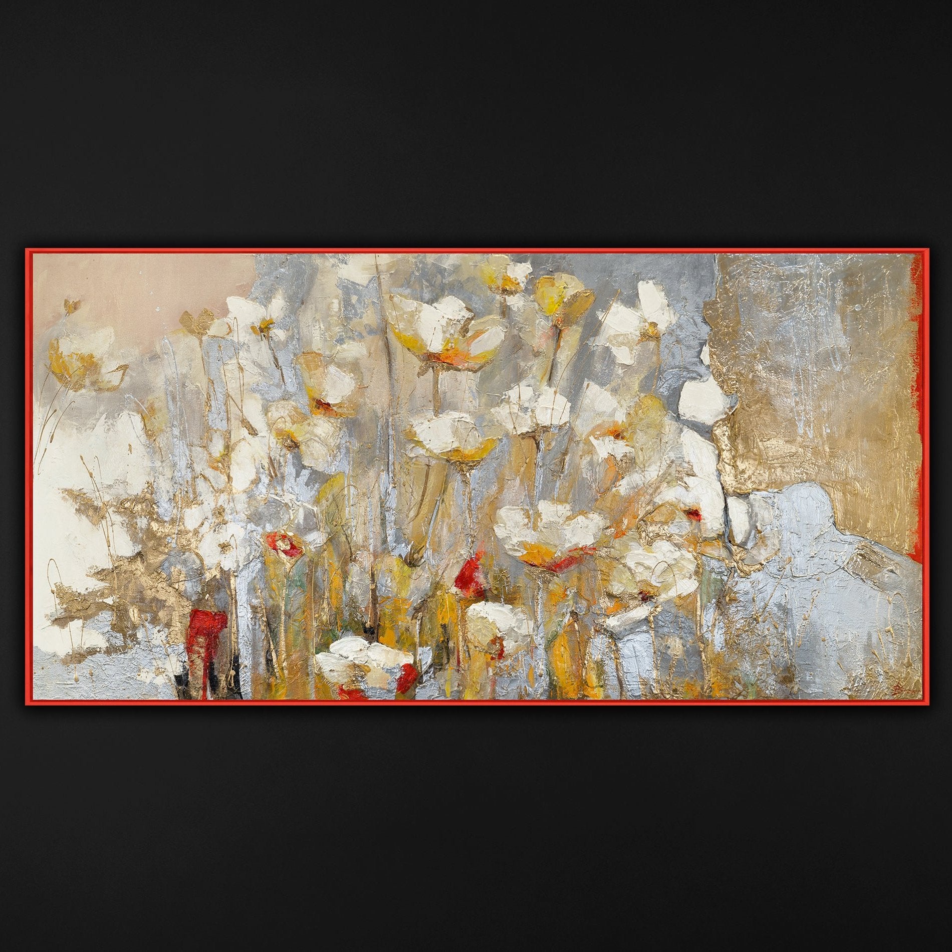 Dieses beeindruckende Acrylbild zeigt eine lebendige Blumenkomposition, die durch zarte Goldakzente veredelt wurde. Die harmonischen Farbtöne aus Beige, Gelb und Rot schaffen eine warme und einladende Atmosphäre.
