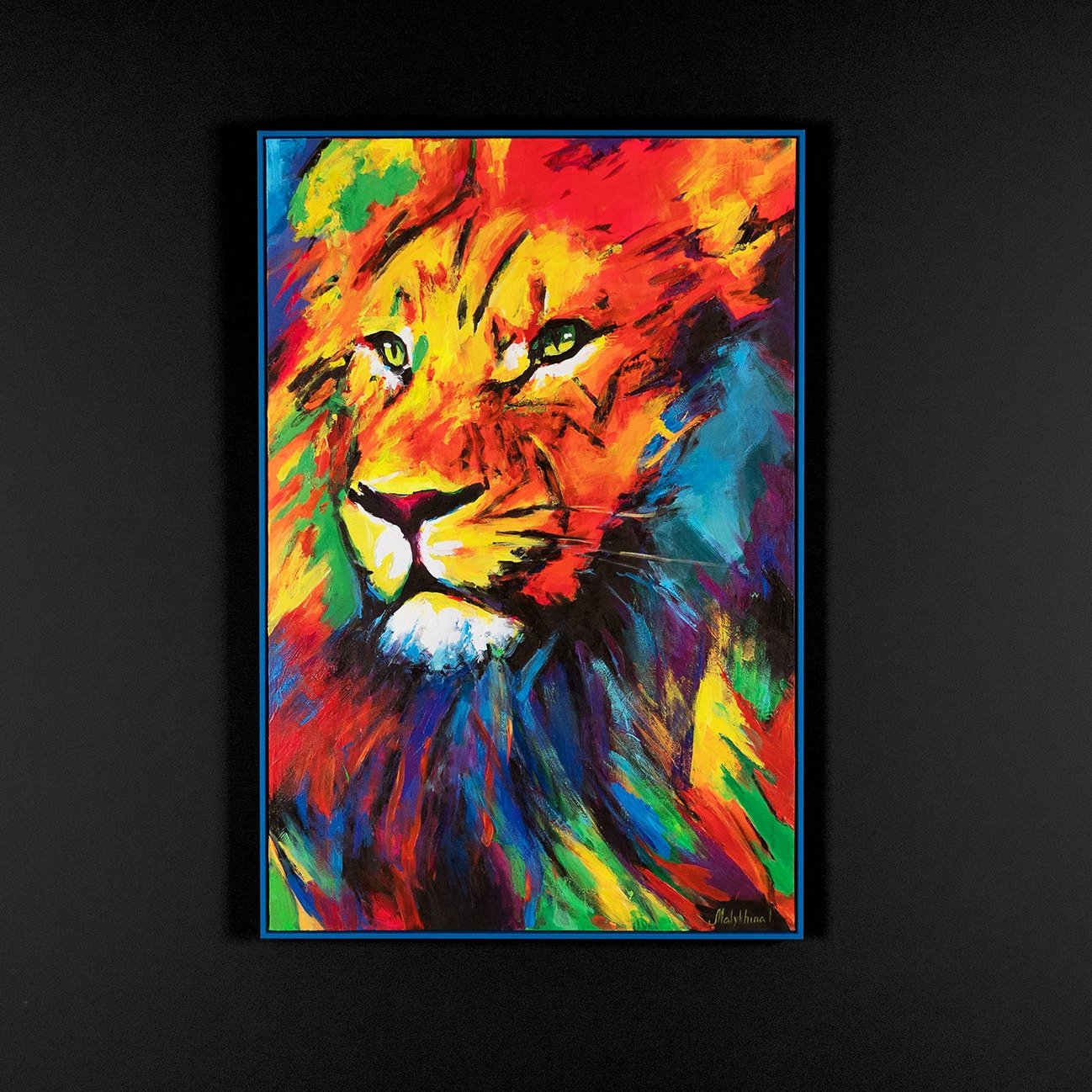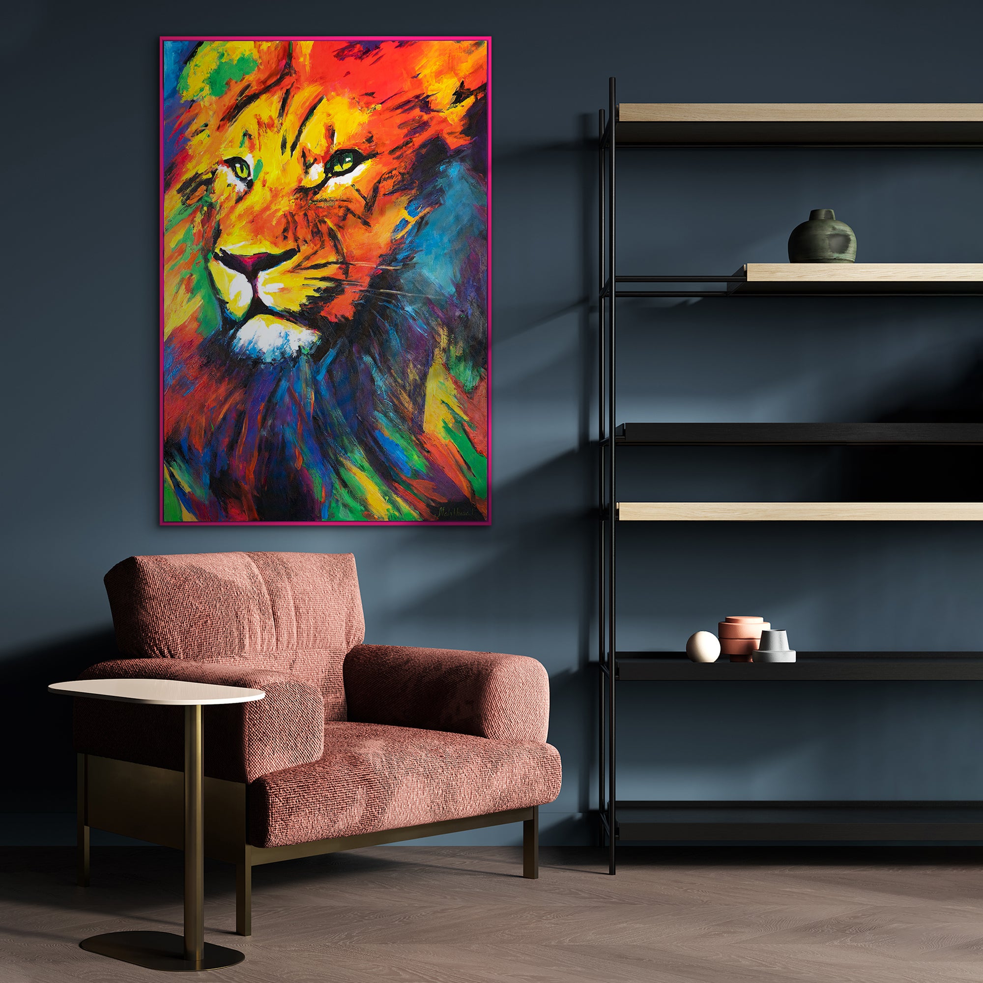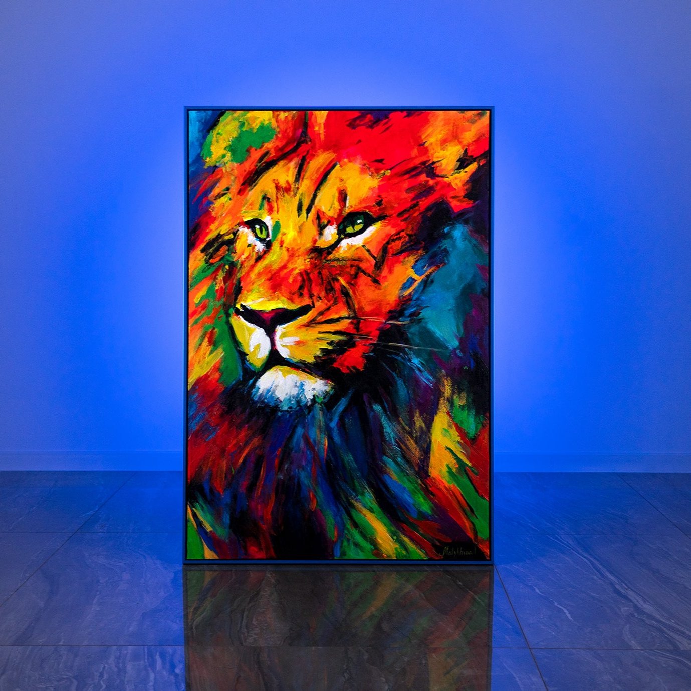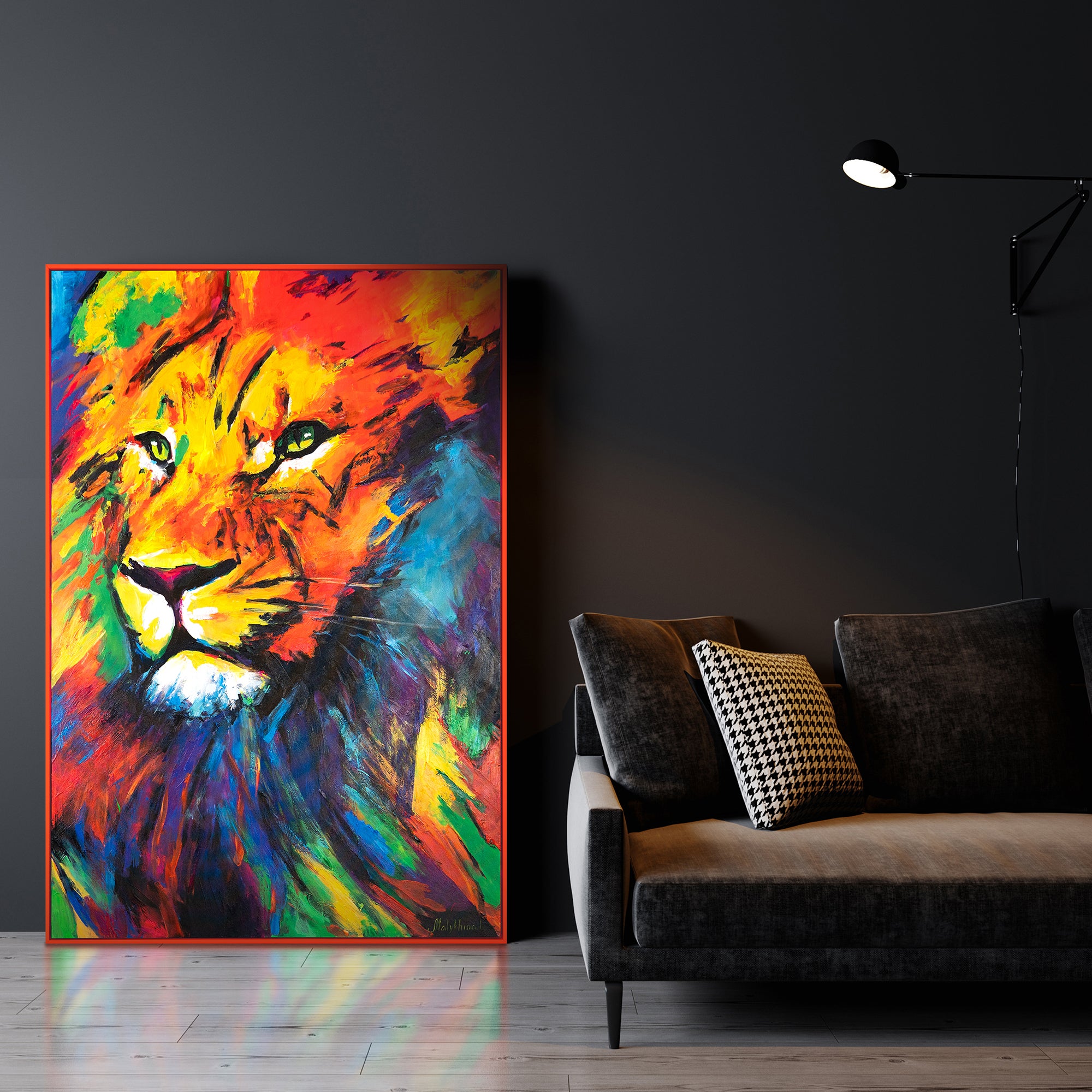 • Farbenfrohes Löwenporträt in Acryl mit Rahmen Löwenstärke