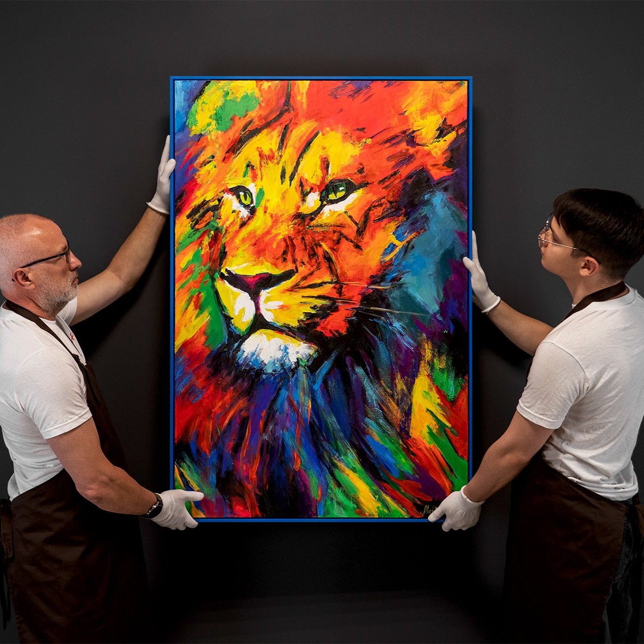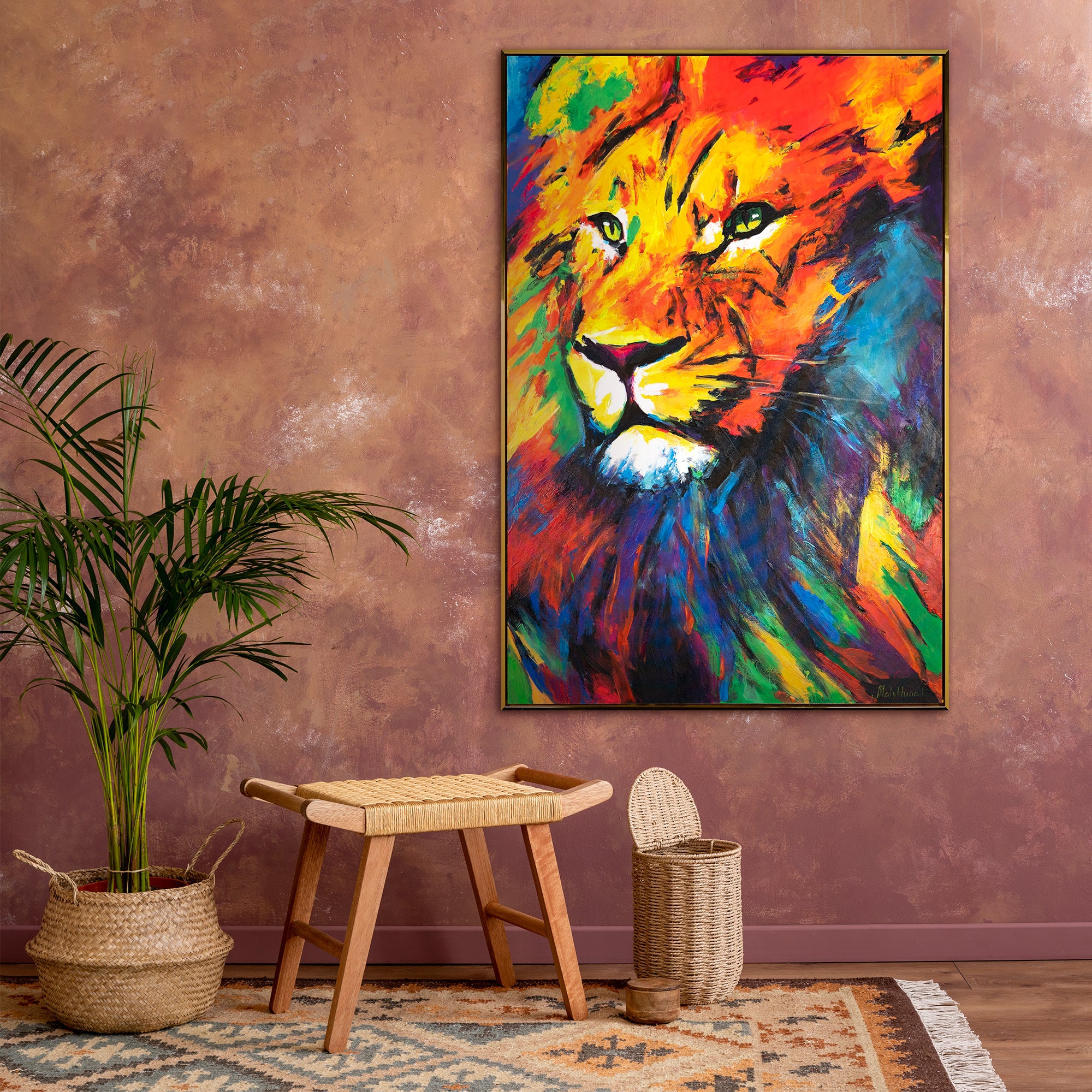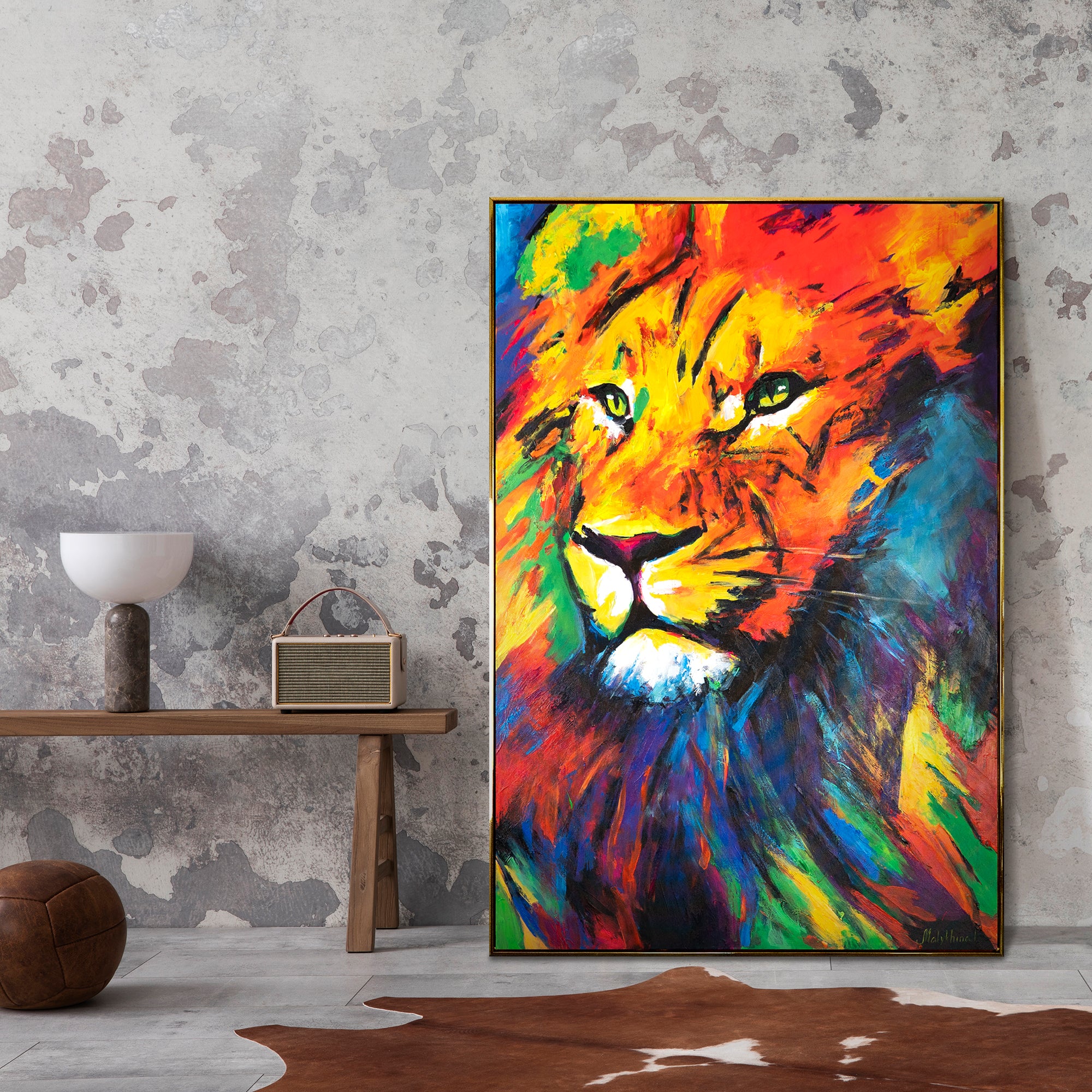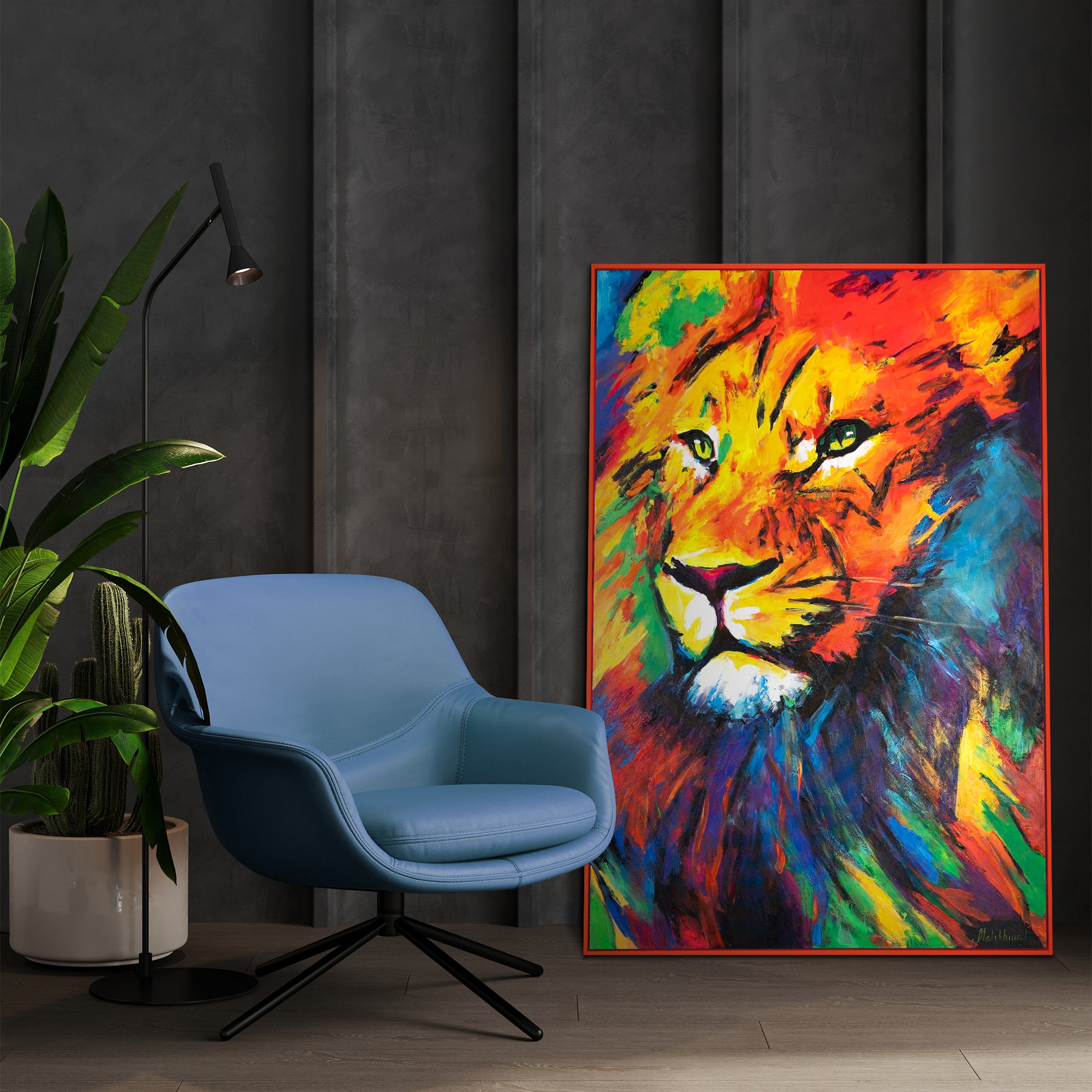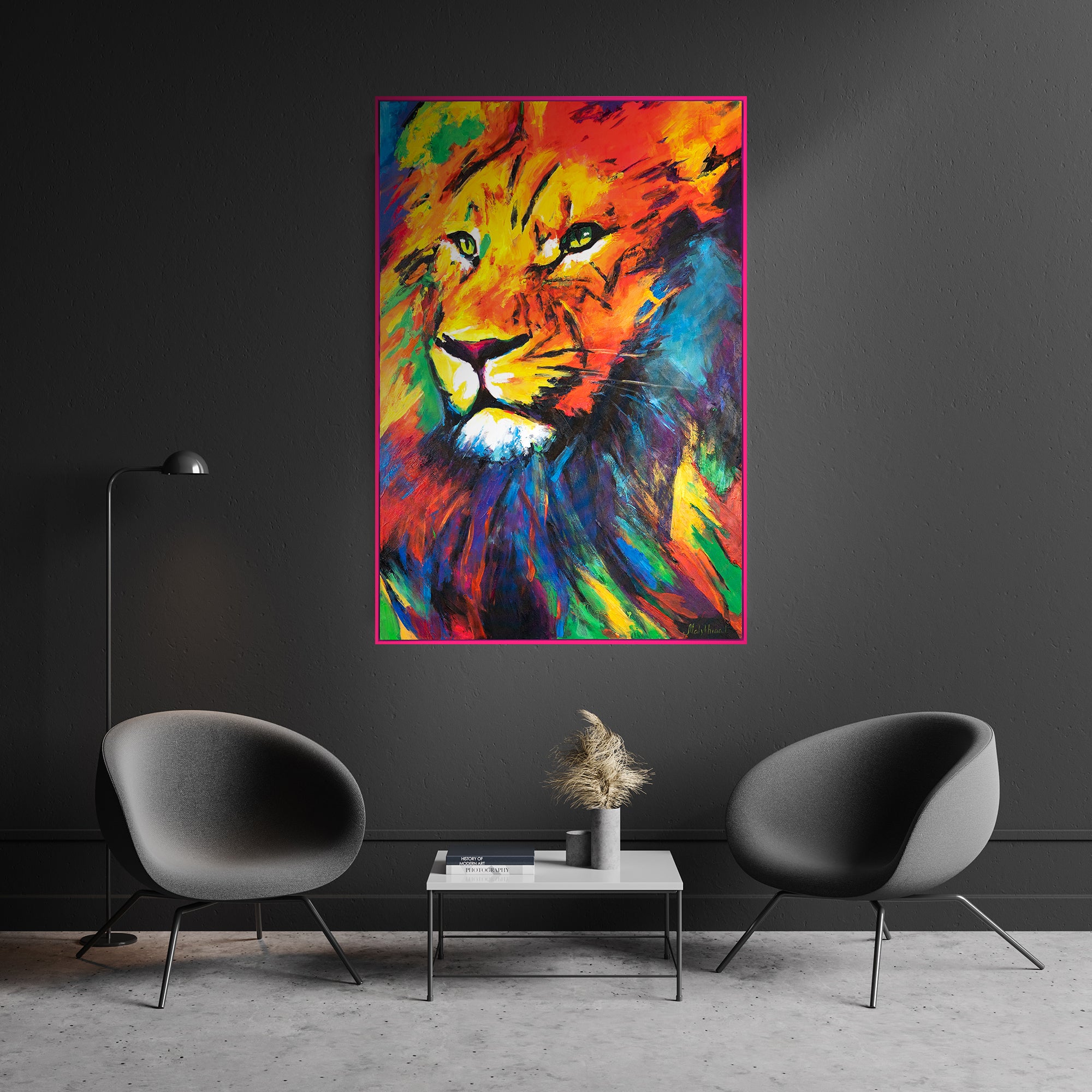 • Farbenfrohes Löwenporträt in Acryl mit Rahmen Löwenstärke