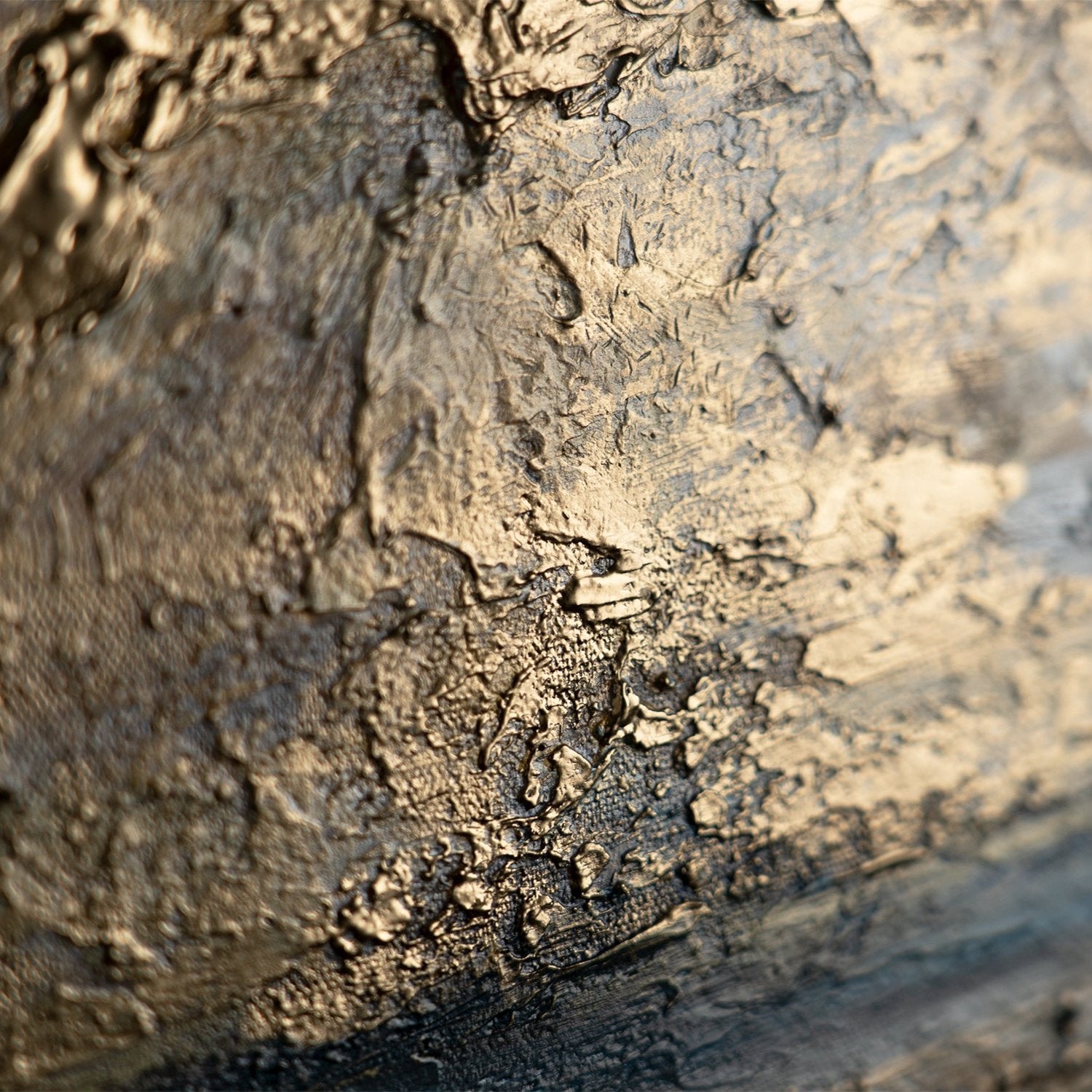 Dieses beeindruckende Acrylgemälde im Querformat vereint moderne abstrakte Malerei mit der majestätischen Ruhe einer Landschaft. Die leuchtenden Goldakzente verleihen dem Bild Tiefe und Brillanz und schaffen ein atemberaubendes Spiel von Licht und Farbe.
